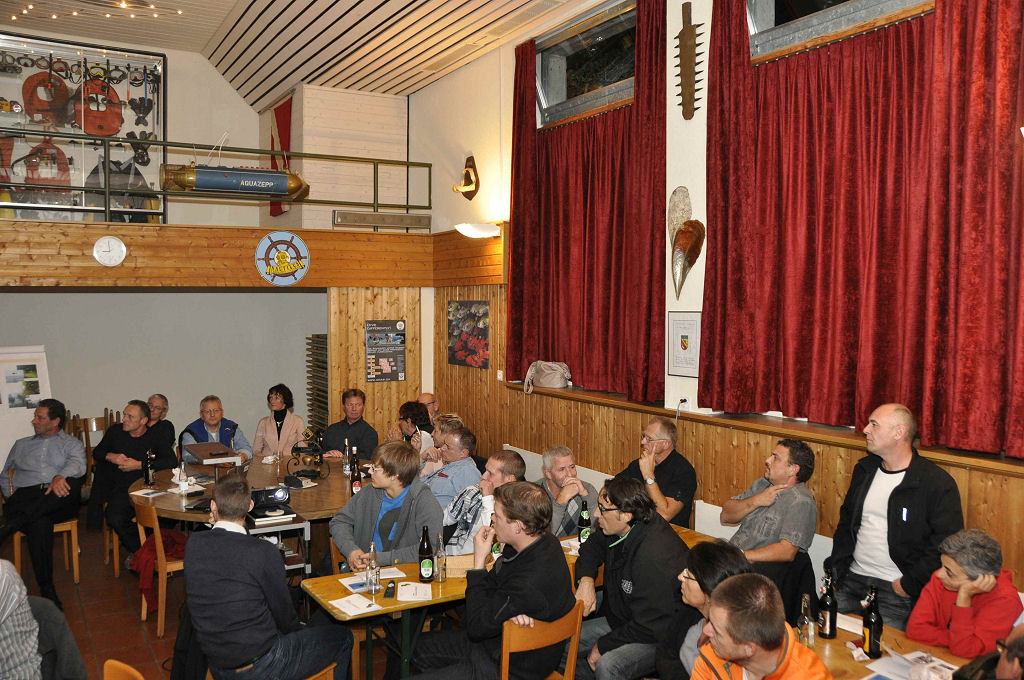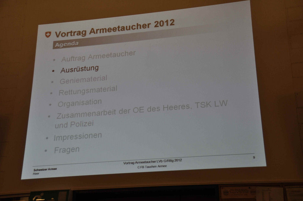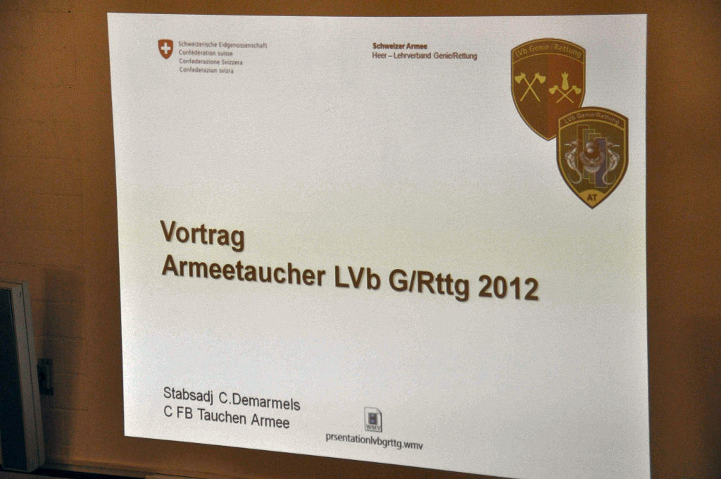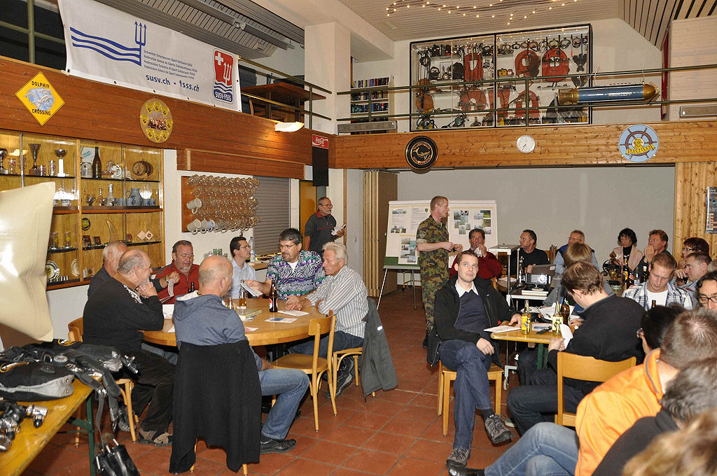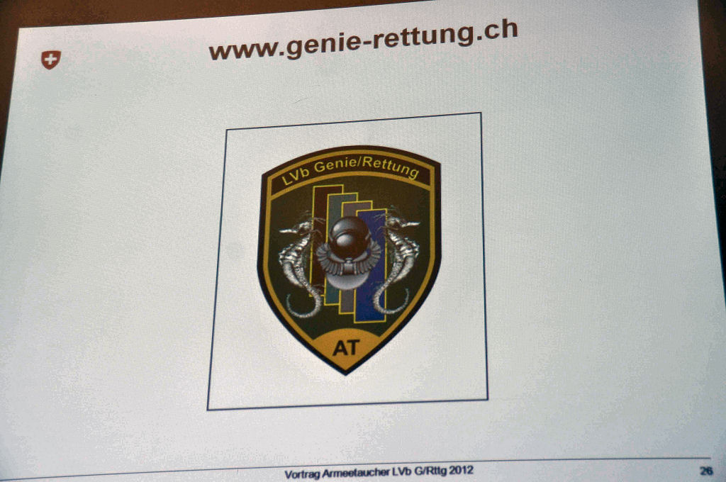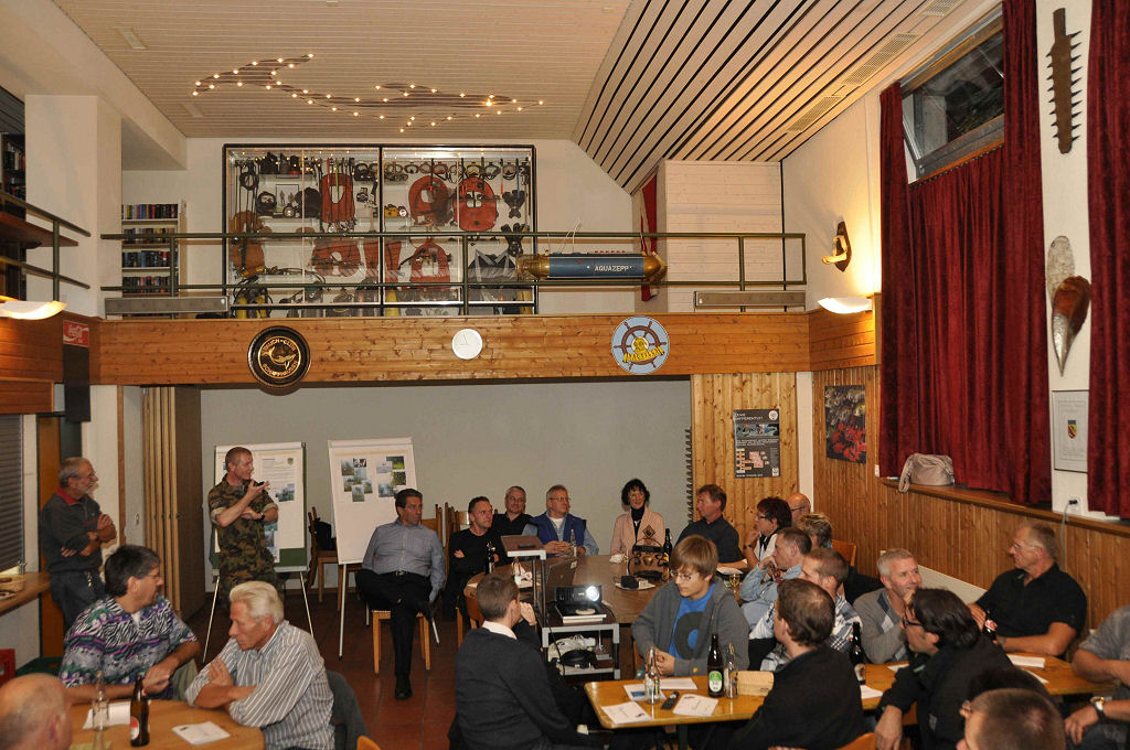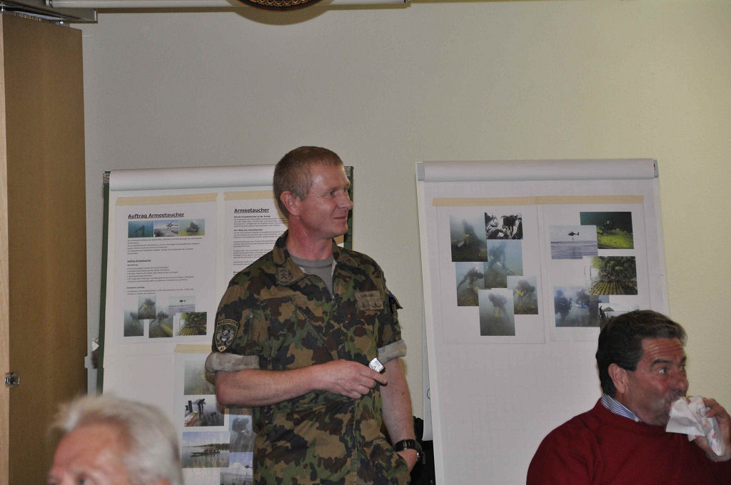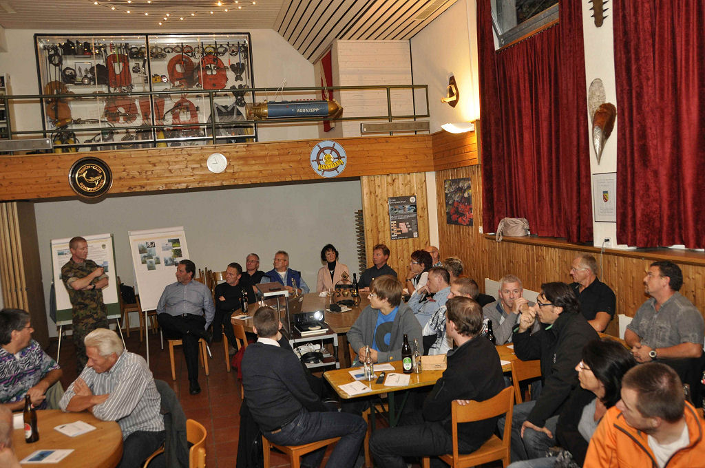 Sein bebilderter Vortrag, unterstützt durch Anschauungsmaterial, gewährte uns Einblick in die anspruchsvolle, z. T. nicht ganz ungefährliche Arbeit eines Armeetauchers. Um diesen Aufgaben gewachsen zu sein, ist nicht nur eine D2 CMAS oder äquivalente Tauchausbildung und körperliche Fitness erforderlich, sondern ebenfalls der Wille, mitunter bis an die eigene Leistungsgrenze zu gehen.