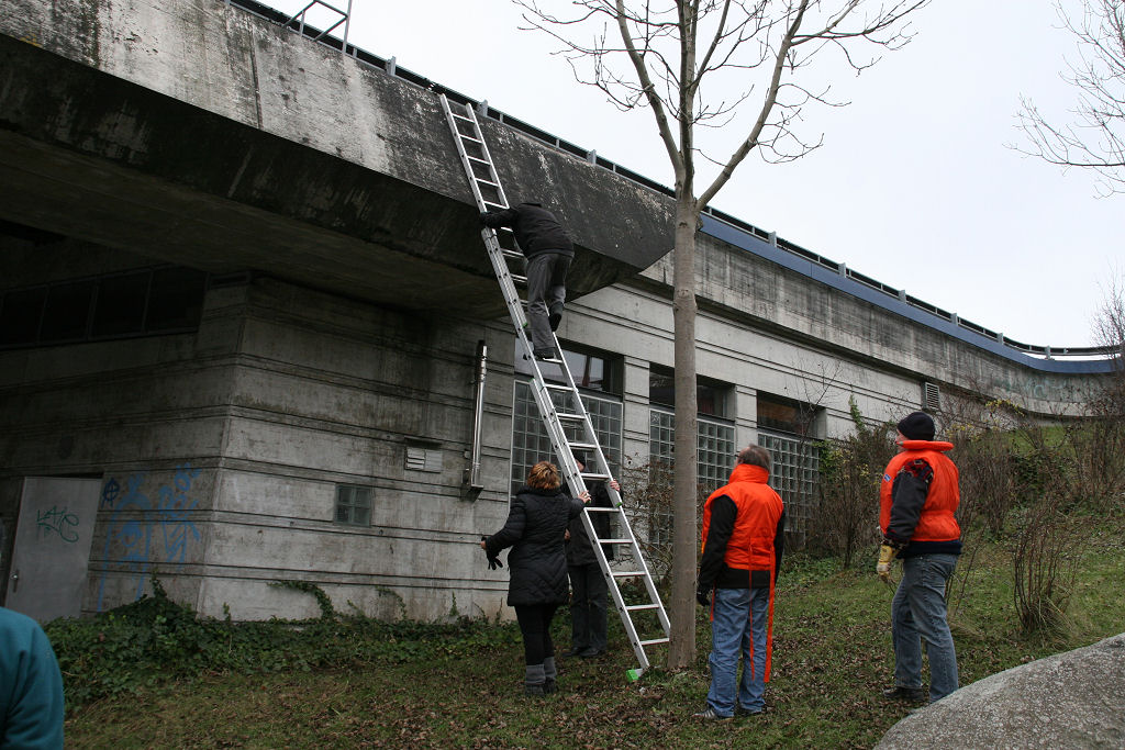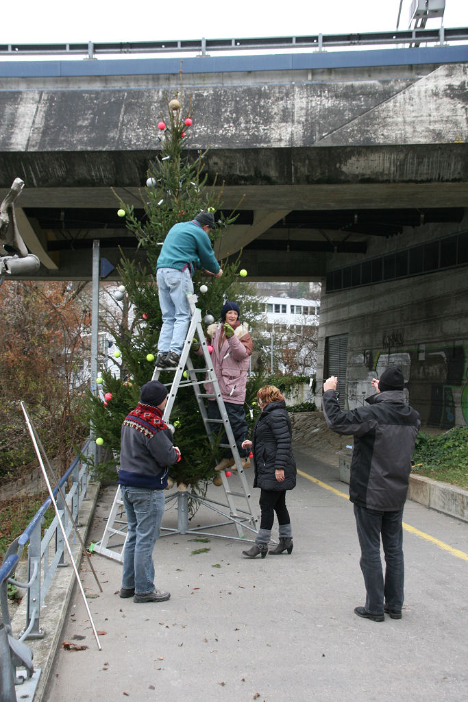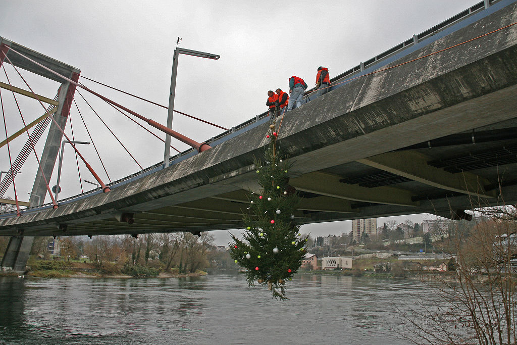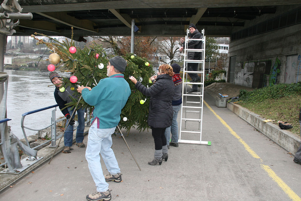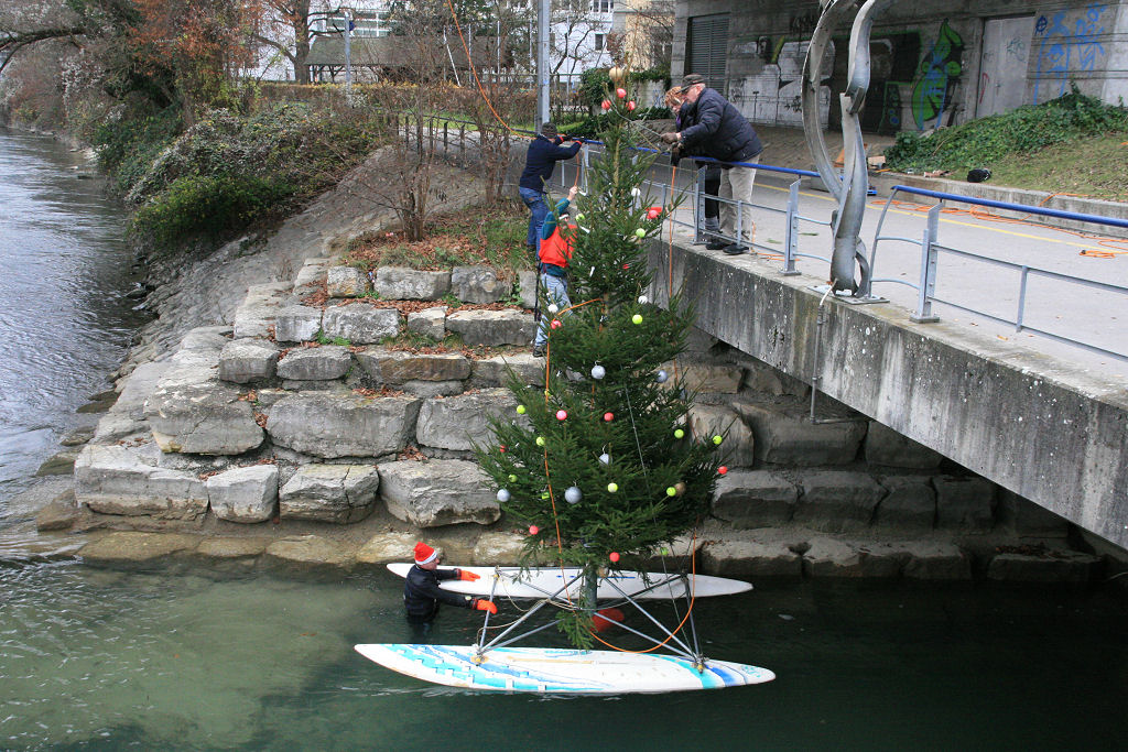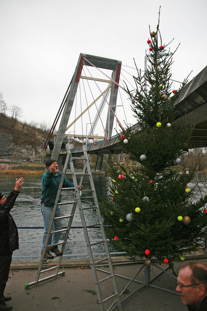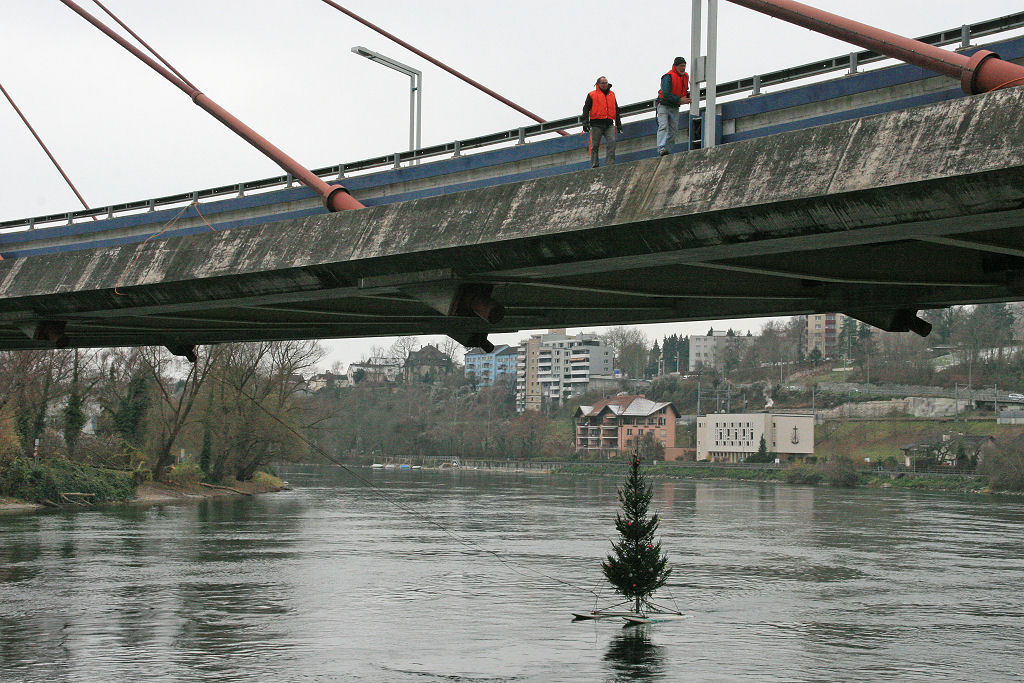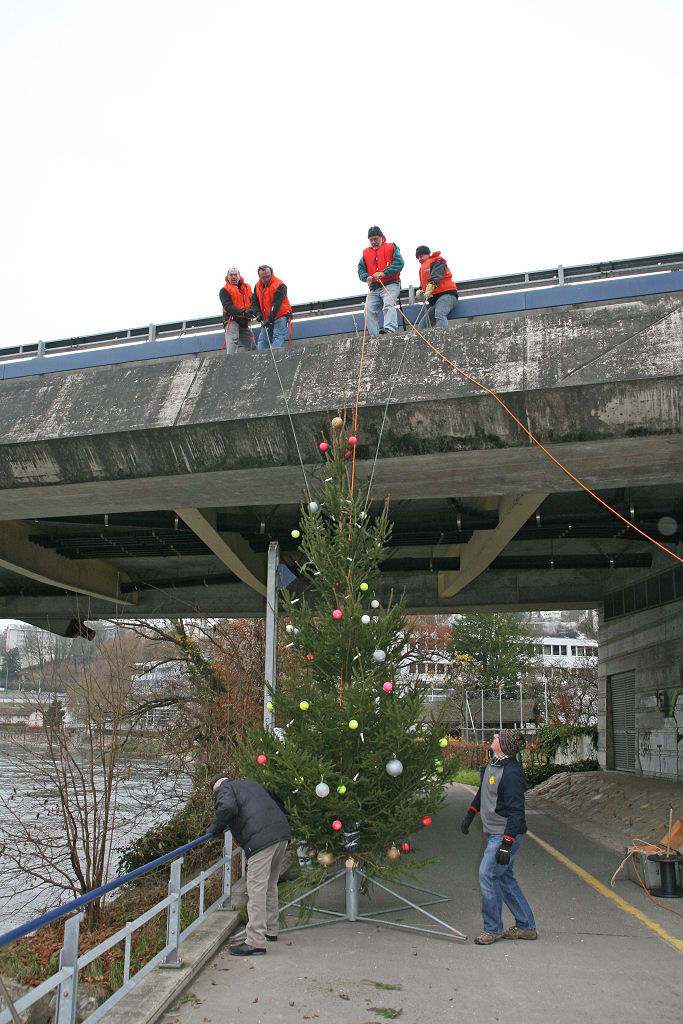 So wird dieses Jahr die glorreiche Idee geboren, den Baum frei schwebend unterhalb der N 4 Brücke ca. 1 m über dem Wasserspiegel aufzuhängen.
