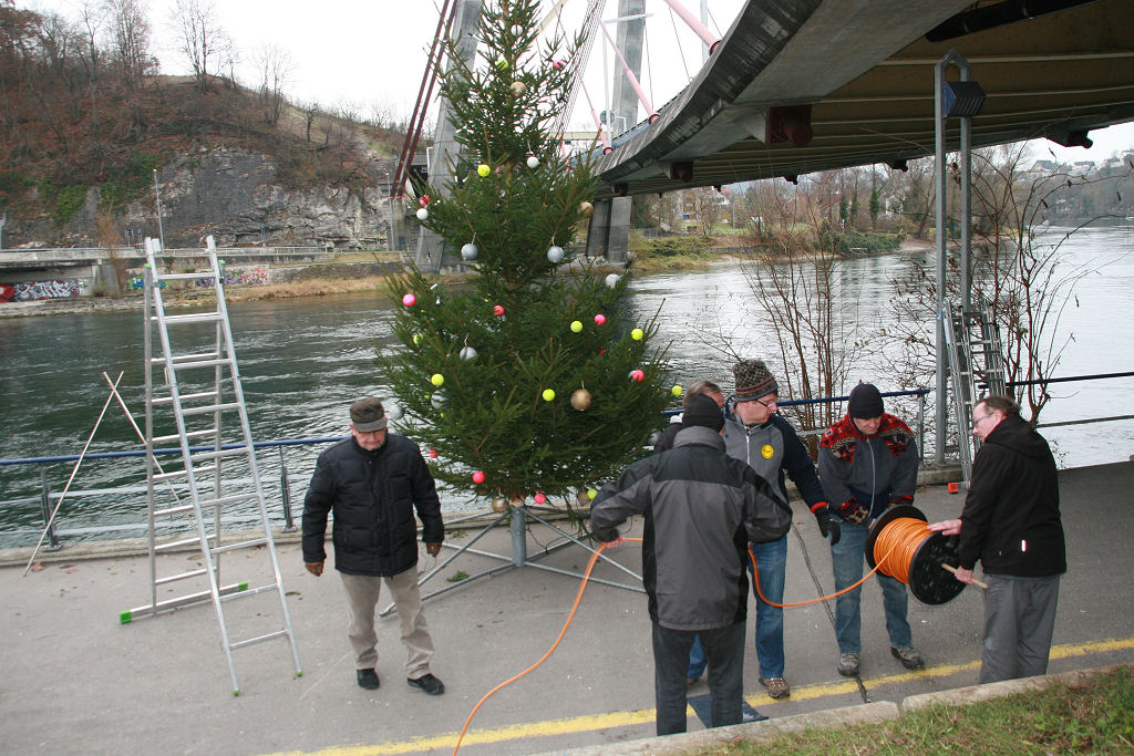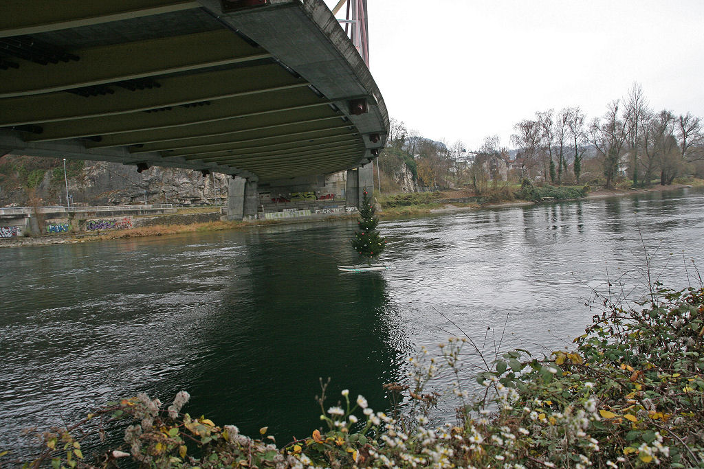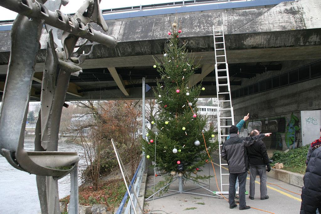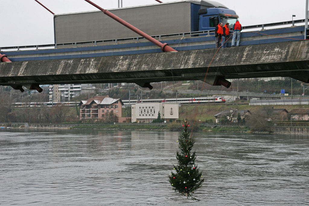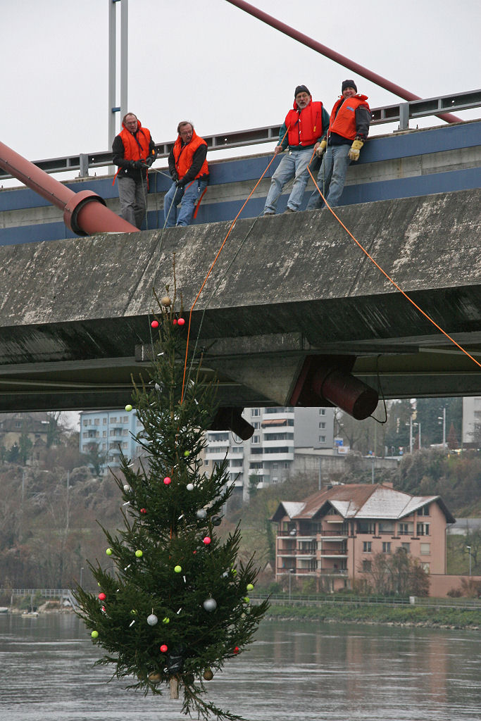 Ausgerüstet mit Schwimmwesten (man weiss ja nie) ziehen die Stärksten der Starken den geschmückten Baum ausserhalb der Brücke in die Mitte des Rheins und wollen ihn gerade am Pfeiler befestigen, als ein «117»-Auto vorfährt, zwei Uniformierte aussteigen und eine Bewilligung sehen wollen.