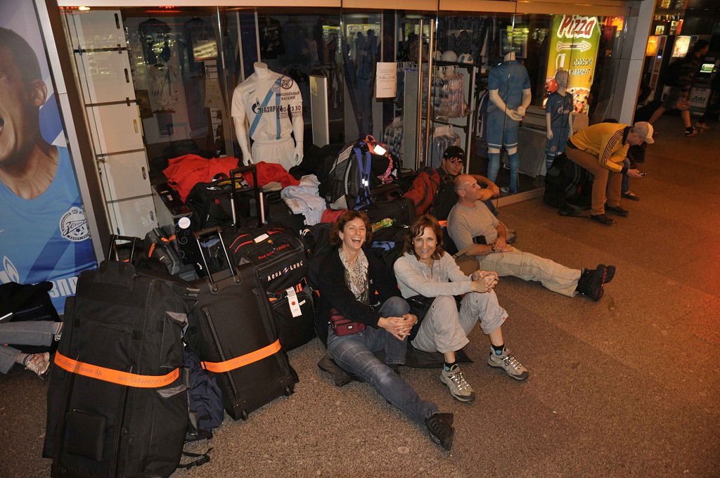 Der Zug mit Schlafwagen nach Chupa sollte eigentlich um 23 Uhr unsere inzwischen müden Häupter aufnehmen. Doch es kommt anders. Durch ein Missverständnis fährt «unser» Zug von einem anderen Bahnhof ab – leider am anderen Ende der Stadt. So ist es uns unmöglich, den Zug noch rechtzeitig zu erreichen. Jetzt sitzen, stehen, liegen und schlafen wir die ganze Nacht auf dem Boden des Bahnhofs in St. Petersburg, umringt von Gepäckbergen, auf die wir auch noch aufzupassen haben. Dank stundenlangem nächtlichen Einsatz vom Organisator, welcher sich tapfer und geduldig mit den russischen Ticketverkäufern die Nacht um die Ohren schlägt, geht die Reise jedoch schon am nächsten Morgen weiter. Morgens 6 Uhr beginnt der Run zur U-Bahn, mitten in der Rushhour. Unzählige Menschen zwängen sich die Rolltreppen hinunter in den 90 m tiefen Underground der U-Bahn. Treppen hoch und runter und das alles mit unserer Unmenge von Gepäck. Nach einer Stunde erreichen wir endlich den Bahnhof und den Zug in Richtung Murmansk.