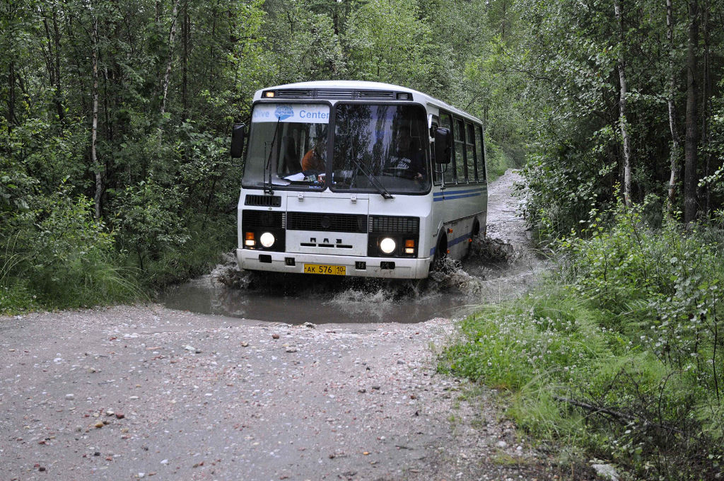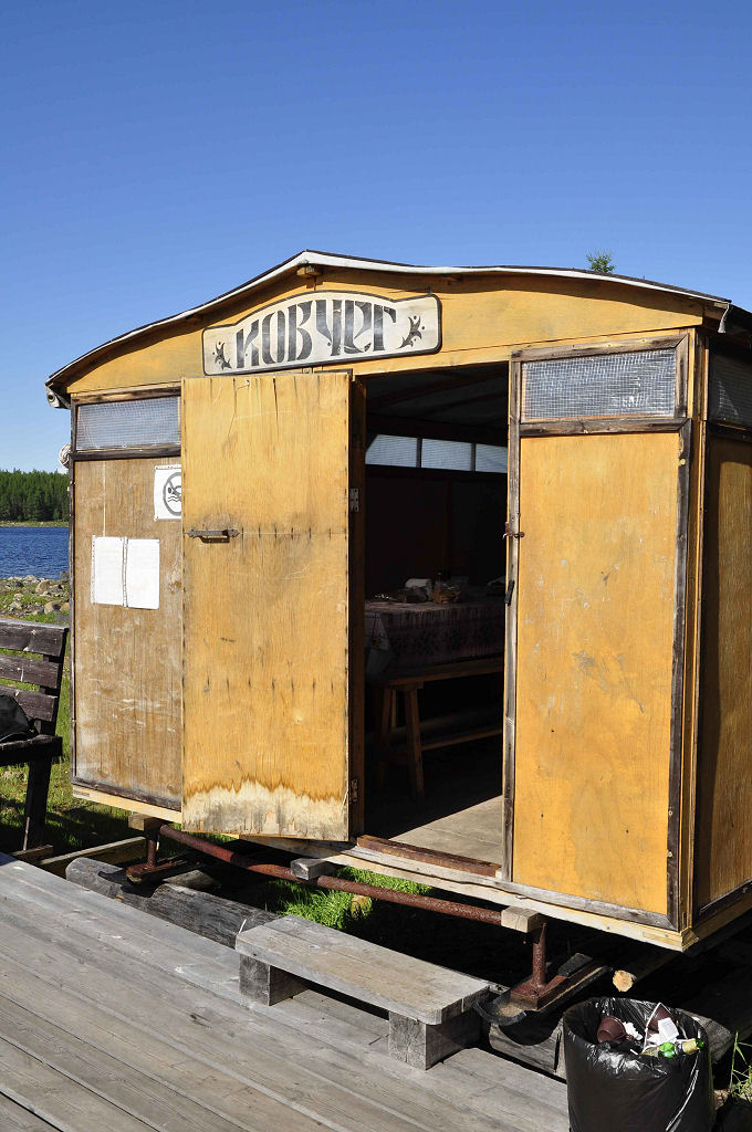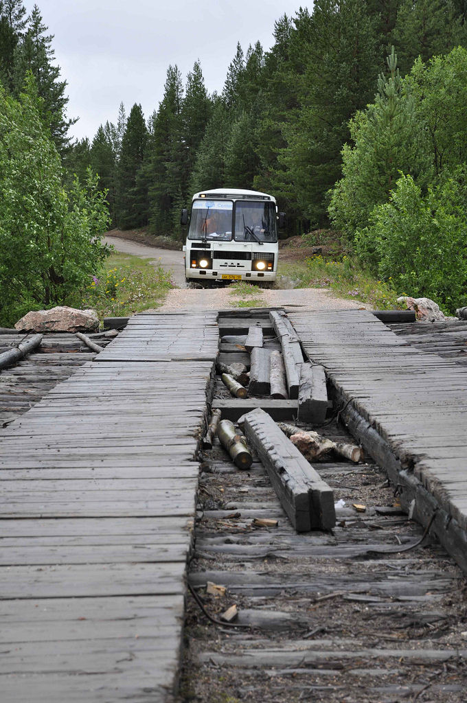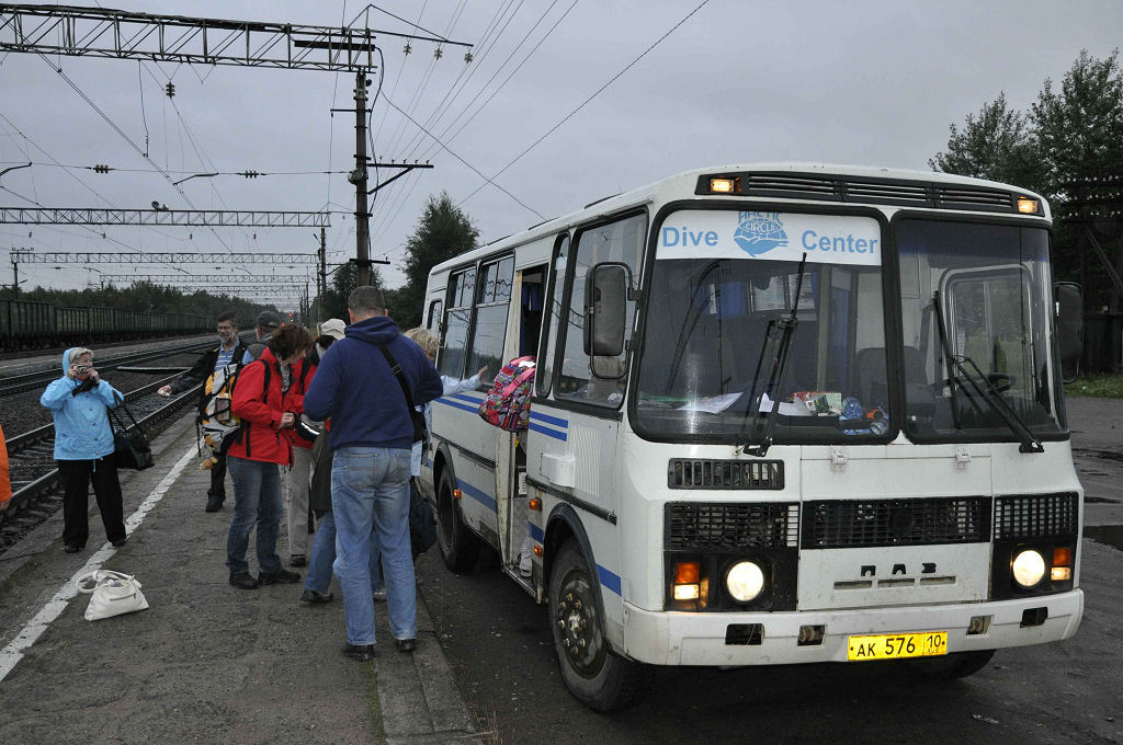 Die 20-stündige Reise in den Norden Russlands führt durch Wälder, endlose Wälder, vorbei an kleinen Dörfern und einer imposanten Seenlandschaft. Dimensionen, die in unserem Lebensraum unvorstellbar sind. Der Service im Zug ist perfekt: jederzeit ist Tee verfügbar, auch warme Mahlzeiten werden serviert. Unterwegs hält der Zug einmal etwas länger, wir können aussteigen und Bäuerinnen bieten frisch gepflückte Heidelbeeren, geräucherte Fische und andere lokale Spezialitäten an. Unser Zielbahnhof in Chupa besteht aus nur zwei Gleisen und einem Perron, sonst nichts. Der Bus vom Arctic Circle Dive Center wartet bereits auf uns. 2 Stunden Schotterpiste, durch wassergefüllte Schlaglöcher und über schmale Holzbrücken in den schier endlosen Wäldern der Taiga sind der letzte Abschnitt unserer Reise.