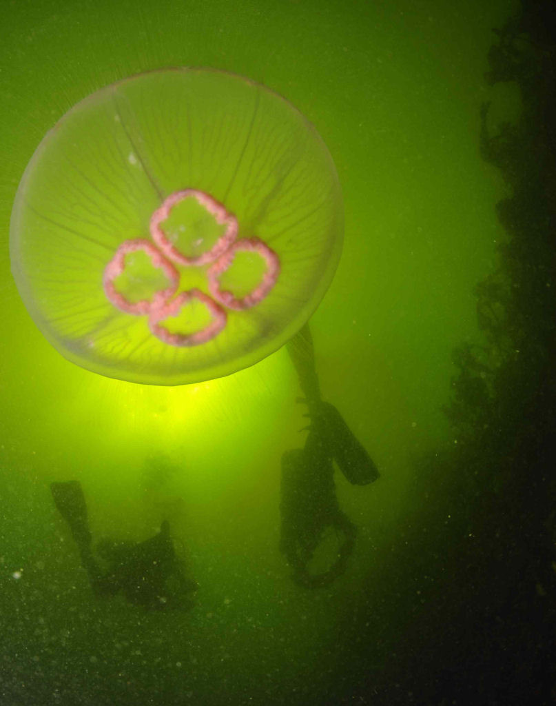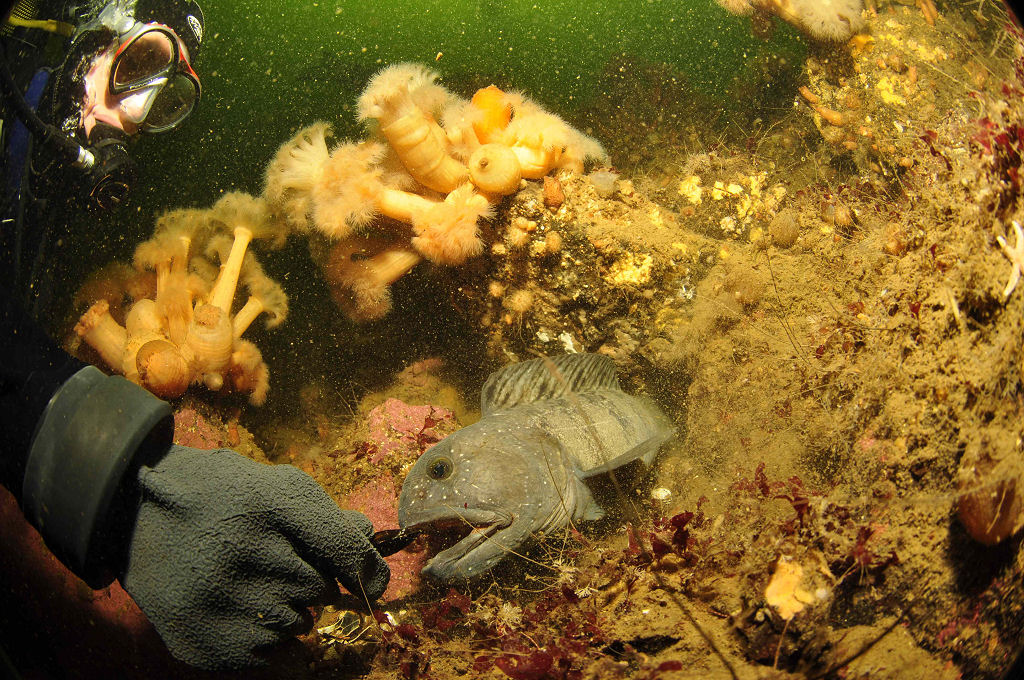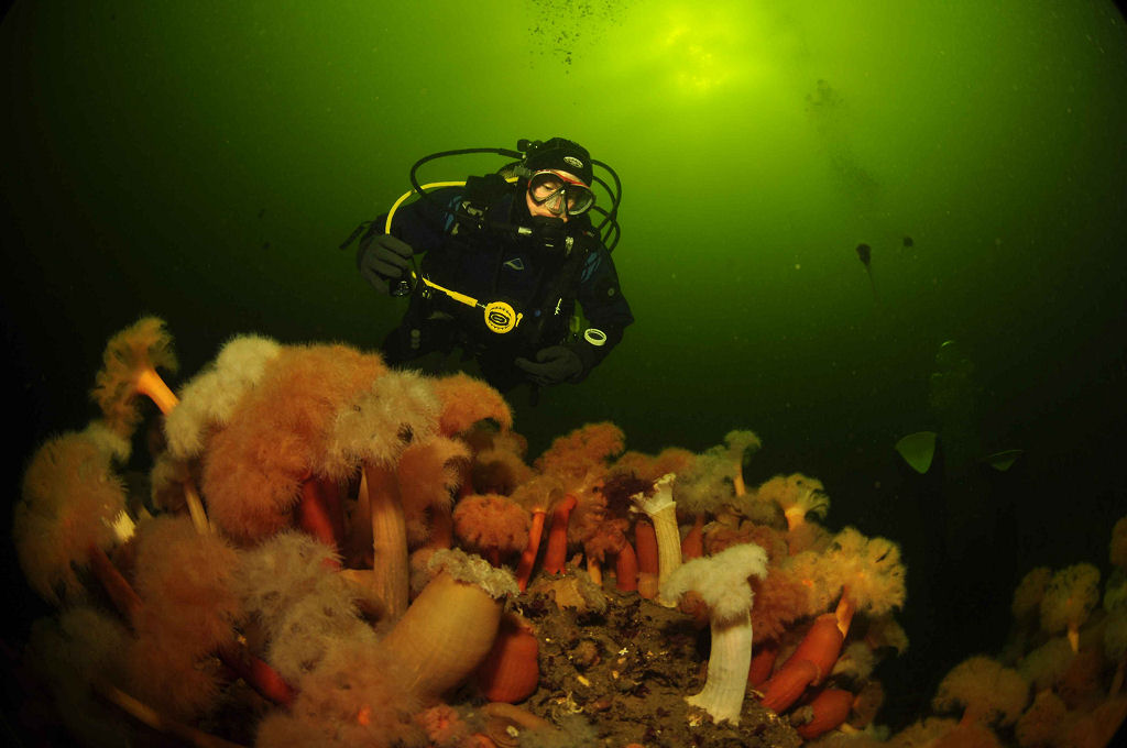 Die Tauchplätze liegen bei Untiefen, in der Nähe kleinerer Inseln oder nahe felsiger Buchten. Zugegeben, mit einem tropischen Meer ist das Weisse Meer nicht zu vergleichen. Doch Felder blühender Anemonen, winzig kleine Garnelen, Seesterne aller Art und vieles mehr begeistern das Herz eines jeden Makro-Liebhabers. Sogar Seewölfe dürfen wir mit mitgebrachten Muscheln füttern. Ebenso kreuzen Drachenköpfe unseren Weg. Ein Wrack bietet jede Menge zu entdecken, lediglich die +0.5 °C Wassertemperatur lassen uns den Tauchgang nach rund 50 Min. abbrechen. Selbst ein Strömungstauchgang hat seinen besonderen Reiz. Im «Affentempo» huscht Fauna und Flora an uns vorbei, bis wir nach einer halben Stunde doch ans Auftauchen denken. Die Sichtweiten sind unterschiedlich. Bis 15 m ca. 3 – 5 m, ab 20 m wird die Sicht zwar besser, aber das Wasser kalt, sehr kalt 4 °C bis 0 °C zeigt der Computer an. An der Oberfläche hingegen laden 13 °C Mutige zum Baden ein.