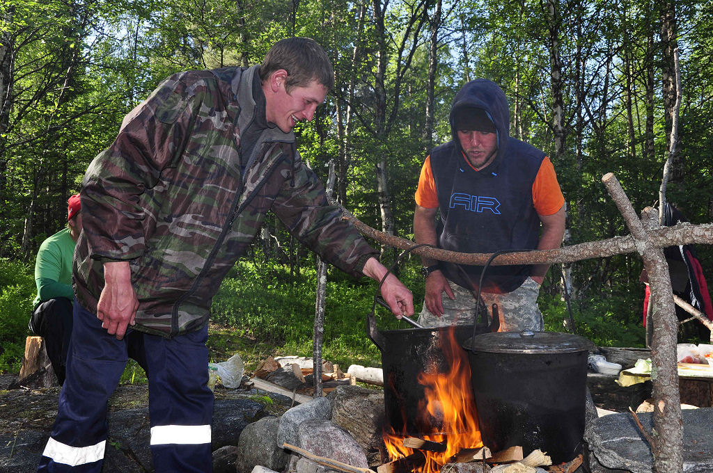 Nach dem Tauchen in polarer Kälte ist die Banja (Russische Sauna-Version) unser bevorzugter Platz zum Aufwärmen und Relaxen. Es ist schon ein besonderes Erlebnis um Mitternacht im Bottich zu sitzen, mit Blick übers spiegelglatte Meer. Die Sonne gibt sich alle Mühe unter zu gehen. Nur, es gelingt ihr nicht. Am Polarkreis wird es um diese Jahreszeit nie ganz dunkel. Nicht nur Tauchen ist am Polarkreis angesagt. Selbst ein Angelausflug steht auf dem Programm. Doch zunächst müssen Würmer am Strand herausgegraben werden, um sie den Fischen anzubieten. (Nicht gerade jedermanns Sache). Der Fang wird anschliessend über dem Feuer in einem Kessel zu Fischsuppe verarbeitet – geschmeckt hat es allen.