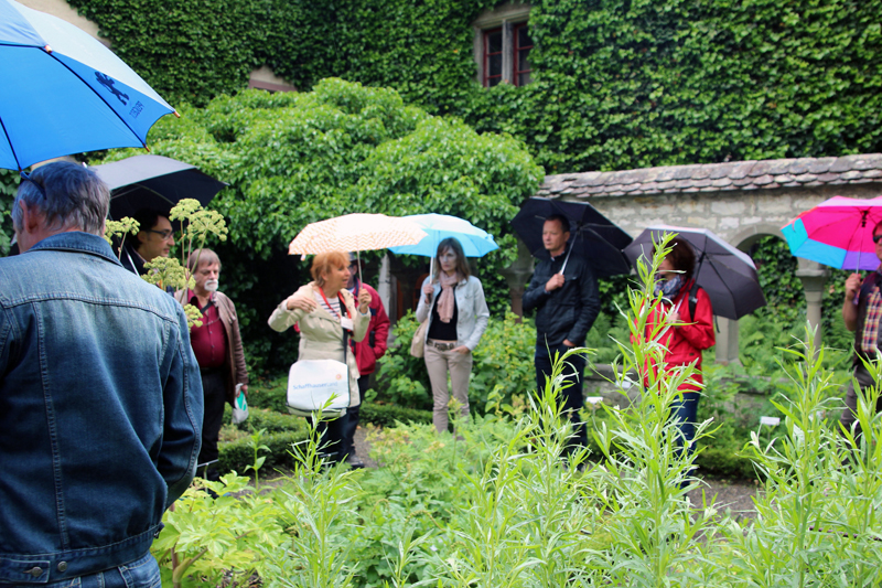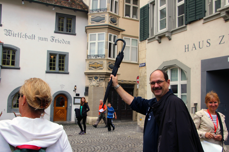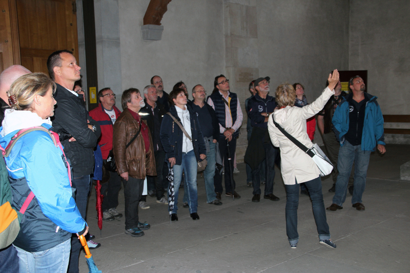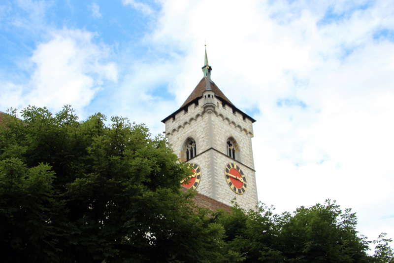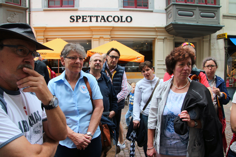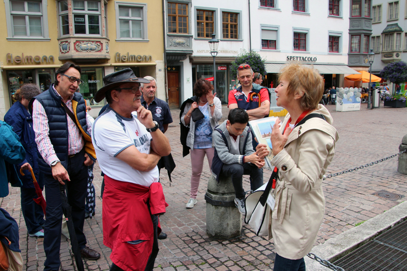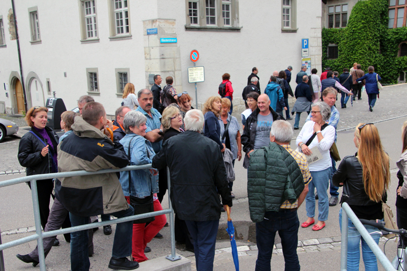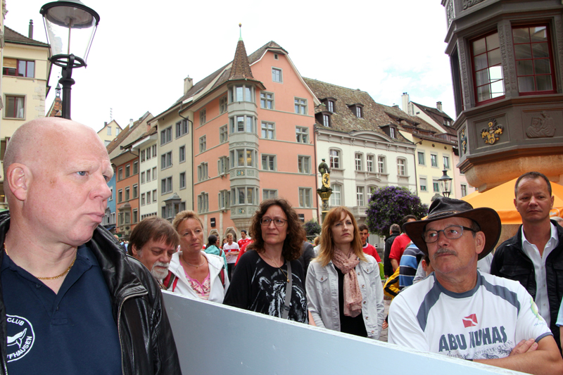 Wir lernen die Vergangenheit des Fronwagplatzes kennen, der früher als Warenumschlagplatz galt. Vorbei am Mohrenbrunnen, der bereits seit 1535 seinen Platz innehat. Das Haus zum Ritter zieht täglich Heerscharen von Touristen an und auch wir stehen mit dem Blick nach oben vor diesem imposanten Gebäude (1492).  Nach einer Stunde – teils mit, teils ohne Regenschirm – gibt’s den verdienten Drink im Ristorante La Piazza, bevor wir zum zweiten Teil der Altstadtführung aufbrechen. Münster und Kreuzgang zu Allerheiligen sowie die Rekonstruktion eines mittelalterlichen Kräutergartens mit duftenden Kräutern finden reges Interesse. Ebenso beeindruckt die 4,5 t schwere Schillerglocke, gegossen 1486, die bis 1895 als grösste Glocke des Münsters ihre Dienste tat. Die Führung ist durchaus interessant, doch wäre es für uns sicher ein Erlebnis gewesen, einmal einen Blick «hinter die Mauern» – z.B. auf einen Turm oder in das alte Rathaus – werfen zu können.
