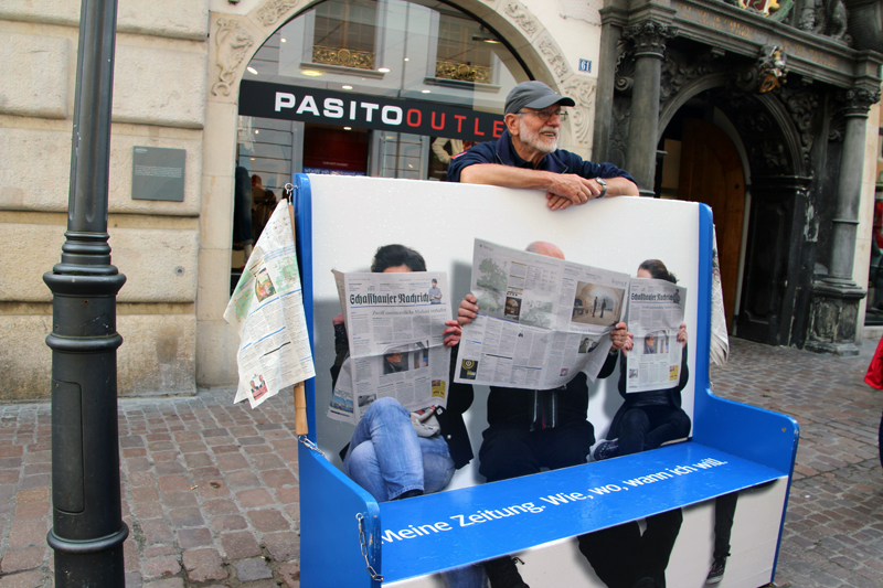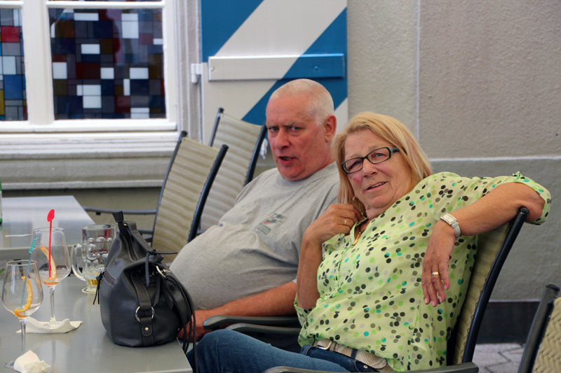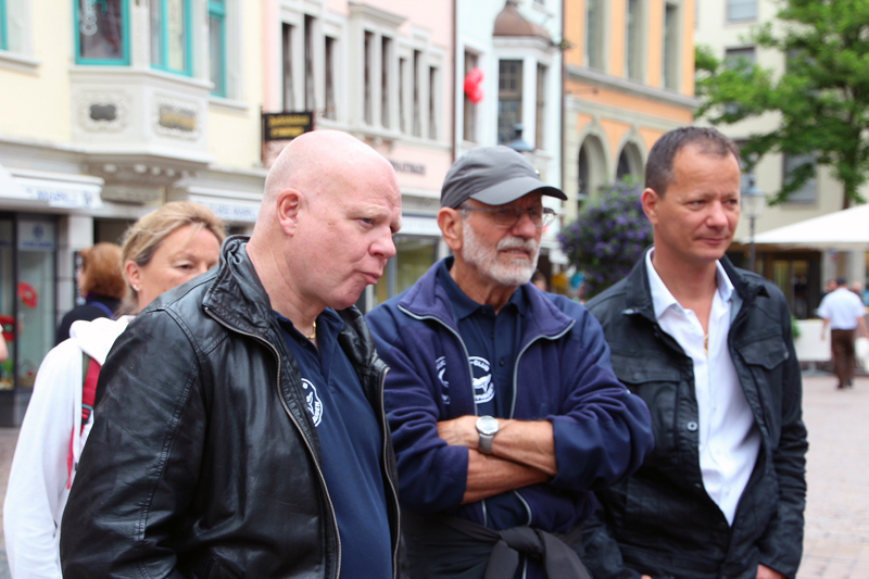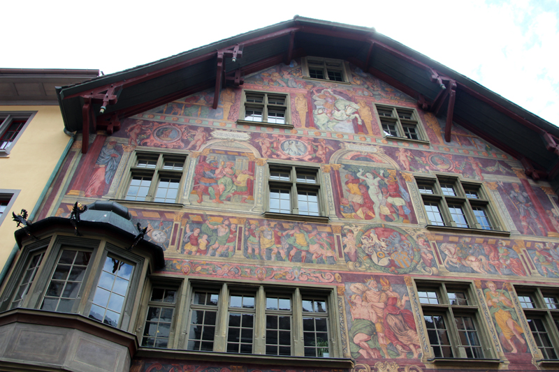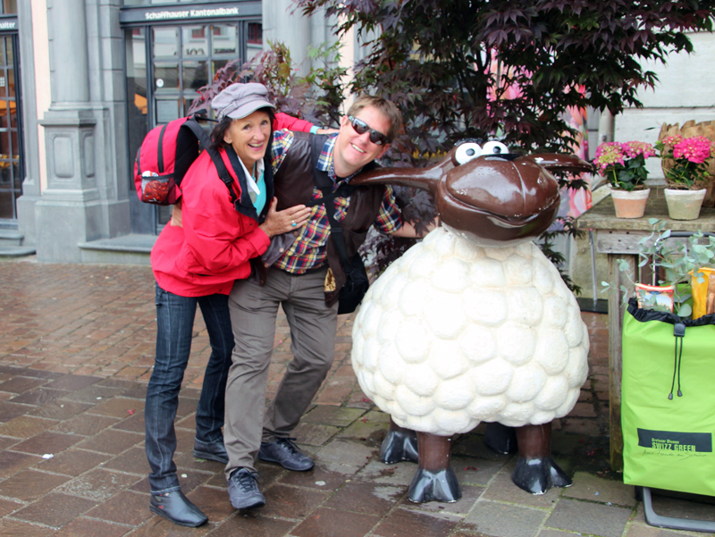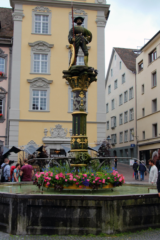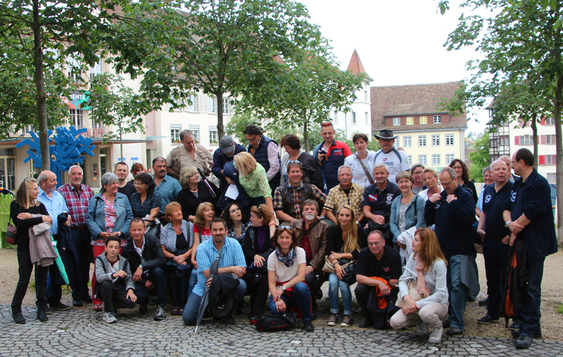 Wir lernen die Vergangenheit des Fronwagplatzes kennen, der früher als Warenumschlagplatz galt. Vorbei am Mohrenbrunnen, der bereits seit 1535 seinen Platz innehat. Das Haus zum Ritter zieht täglich Heerscharen von Touristen an und auch wir stehen mit dem Blick nach oben vor diesem imposanten Gebäude (1492).  Nach einer Stunde – teils mit, teils ohne Regenschirm – gibt’s den verdienten Drink im Ristorante La Piazza, bevor wir zum zweiten Teil der Altstadtführung aufbrechen. Münster und Kreuzgang zu Allerheiligen sowie die Rekonstruktion eines mittelalterlichen Kräutergartens mit duftenden Kräutern finden reges Interesse. Ebenso beeindruckt die 4,5 t schwere Schillerglocke, gegossen 1486, die bis 1895 als grösste Glocke des Münsters ihre Dienste tat. Die Führung ist durchaus interessant, doch wäre es für uns sicher ein Erlebnis gewesen, einmal einen Blick «hinter die Mauern» – z.B. auf einen Turm oder in das alte Rathaus – werfen zu können.
