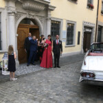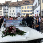 Ein paar Delphine, die Feuerwehr Beringen, Schulkinder, Freunde und Familie füllten die gesperrte Safrangasse, als Nadja und Paul vom Standesamt kamen. Der erste Tag ohne Masken, dafür Sonne pur! Wir haben dem Brautpaar das Bild ihrer jungen Blutbuche geschenkt, das Bäumchen selbst wurde ihnen während der Hochzeit  direkt zuhause vor die Tür gestellt. Beim anschliessenden Apéro blieb ein bisschen Zeit, um mit dem strahlenden Brautpaar zu plaudern, und die Freude war auch Brigitta und Robert von Weitem anzusehen.