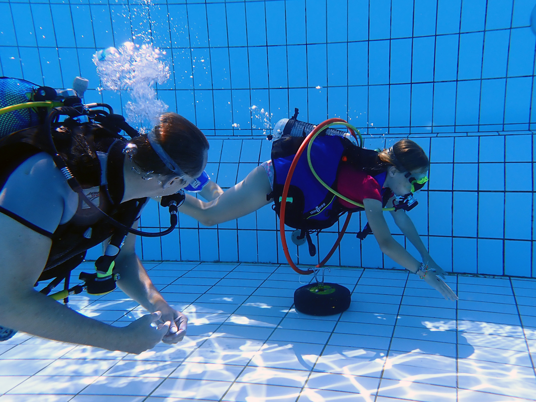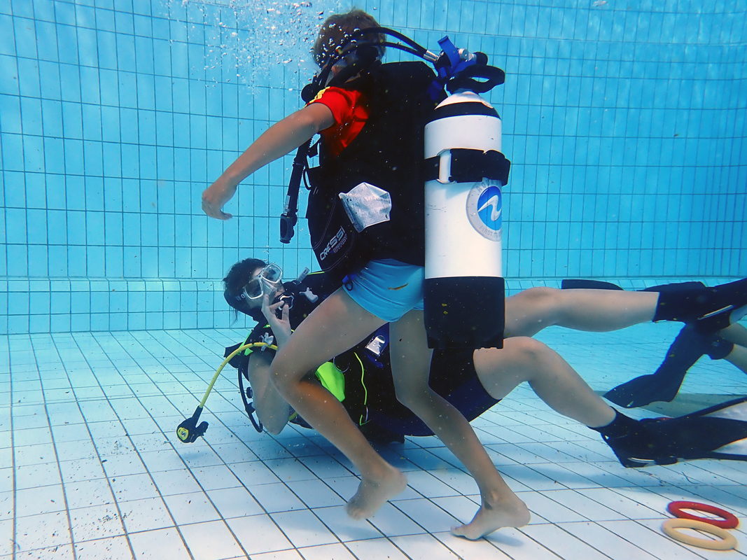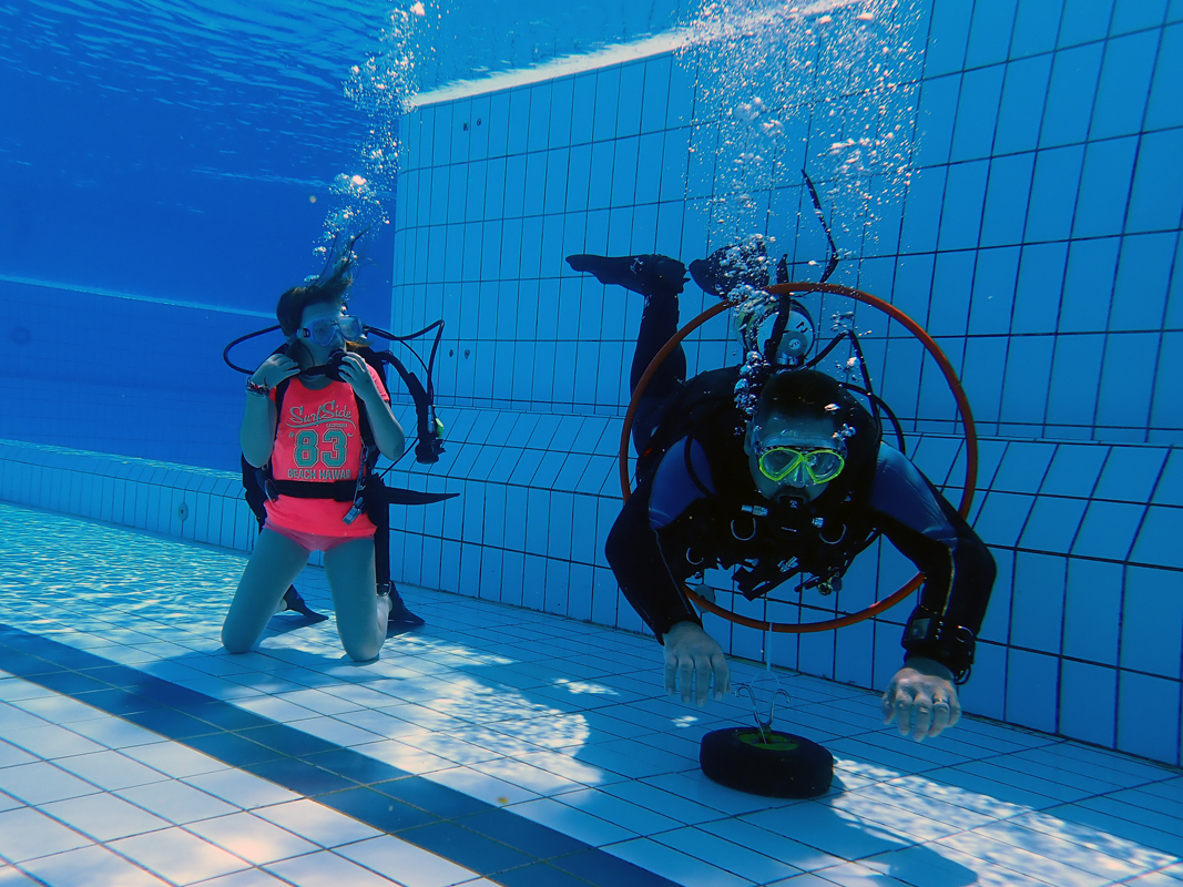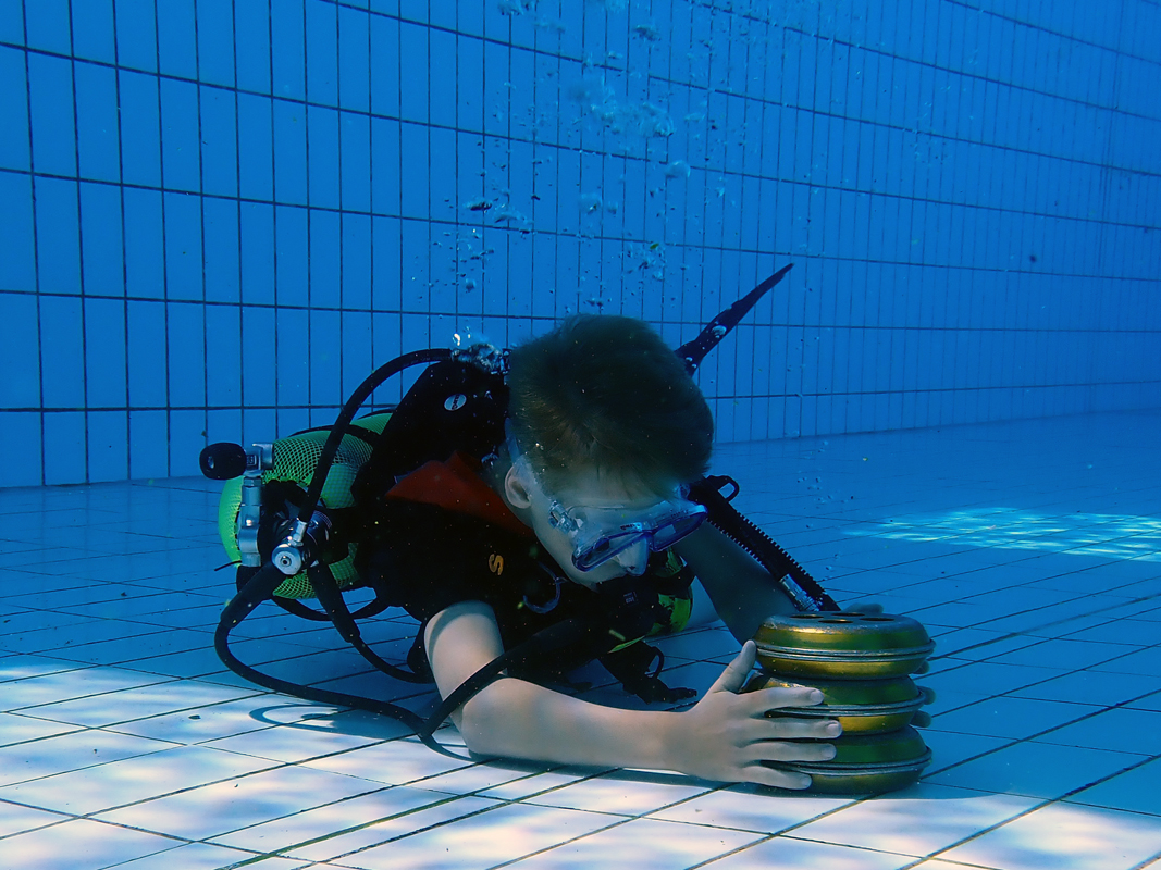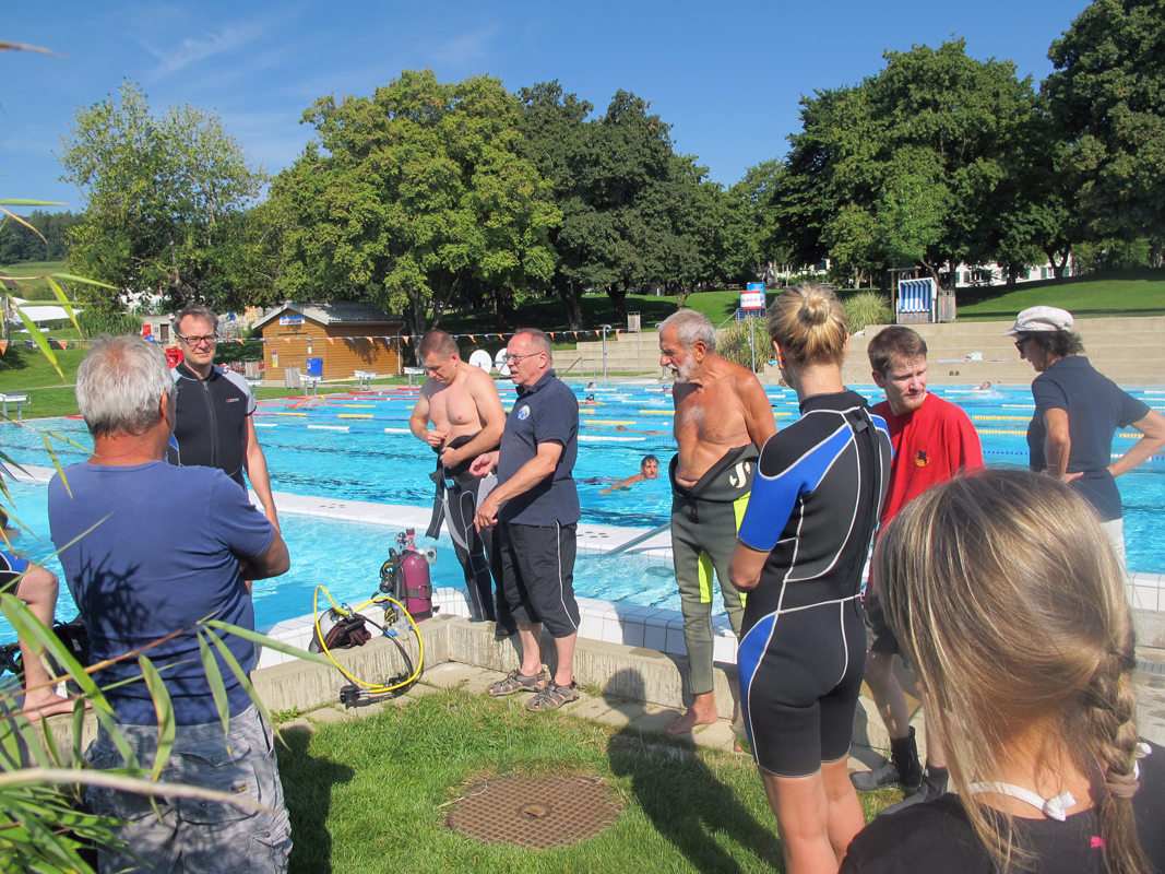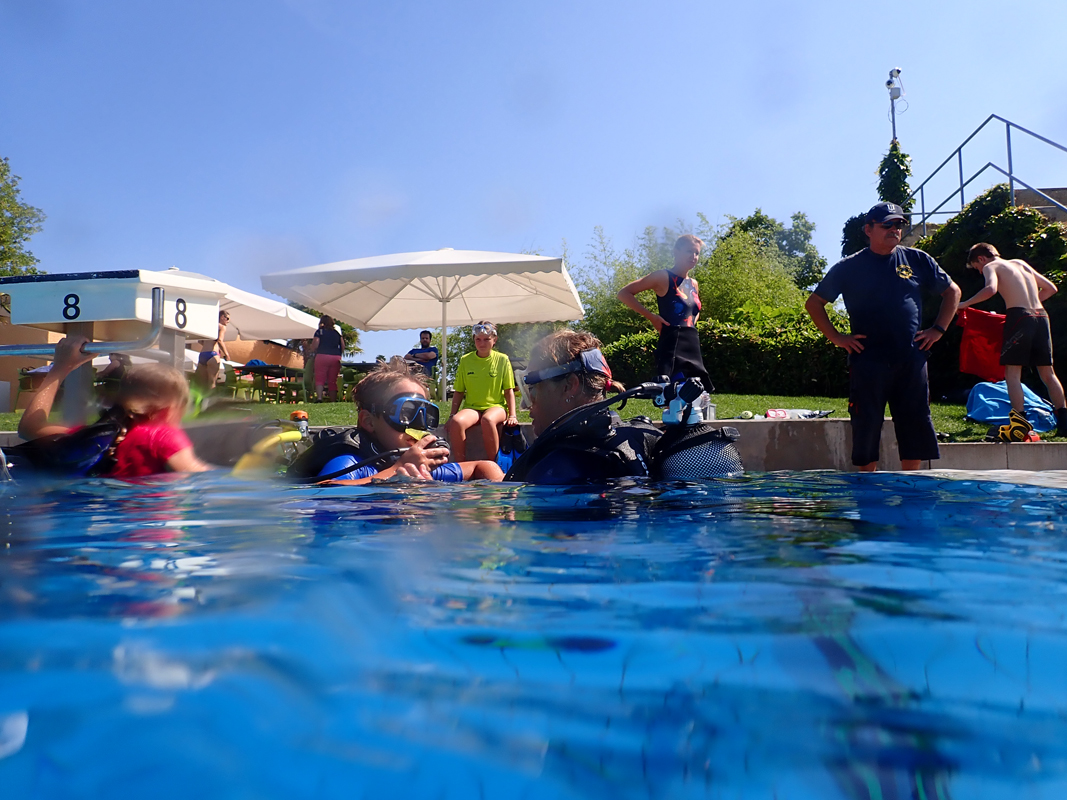 Durch die grosse Beliebtheit dieser Veranstaltung des Ferienpass, bei dem die Kinder die Möglichkeit haben in organisiertem Rahmen, einmal ins Tauchen hinein zu schnuppern, gab es dieses Jahr wieder 2 Gruppen. Eine am Vormittag und eine am Nachmittag. Danke an die Organisatoren/Innen des Ferienpass. Nach kurzem theoretischem Teil und einer «Einführung» ins praktische Tauchen im warmen Ausschwimm-Becken, wobei jedes Kind jeweils mit einem Taucher durchs grosse Schwimmbecken der KSS das Tauchen und im tiefen Bereich unter den abgesperrten Sprungtürmen einige Unterwasserspiele erleben durfte.