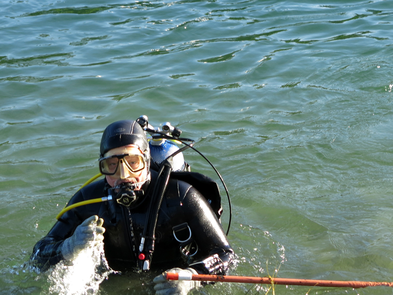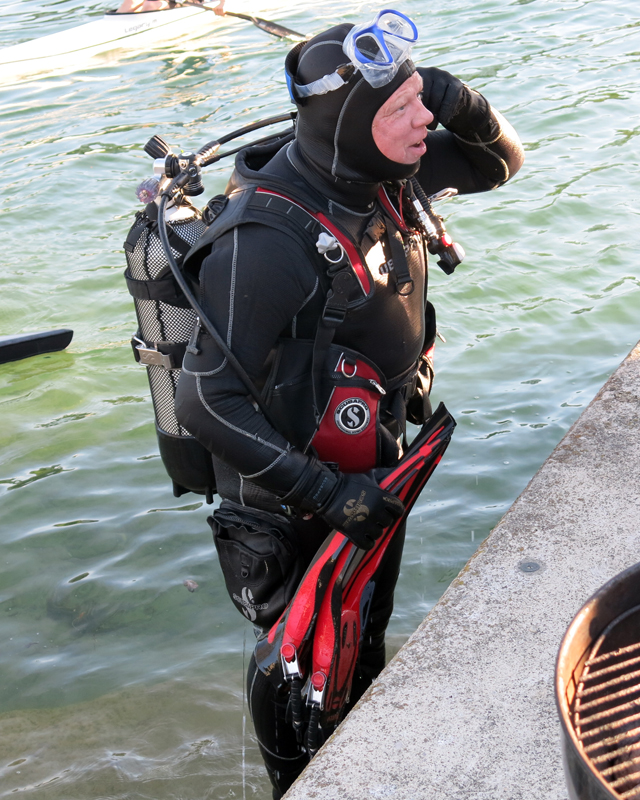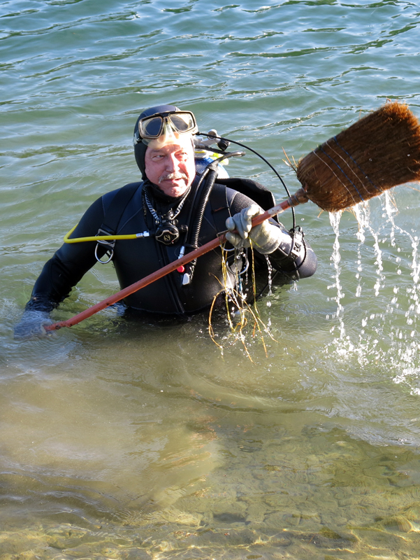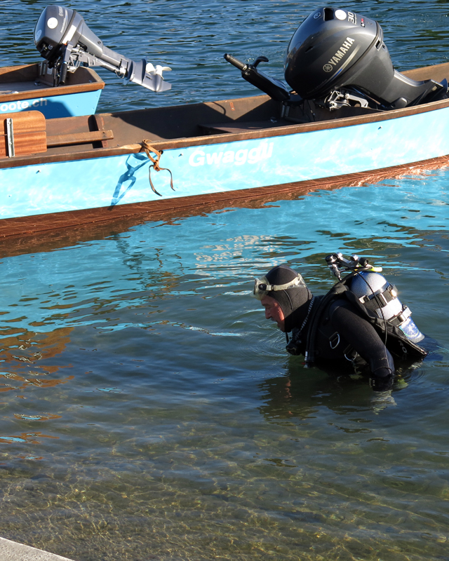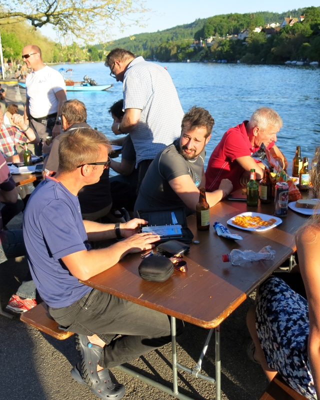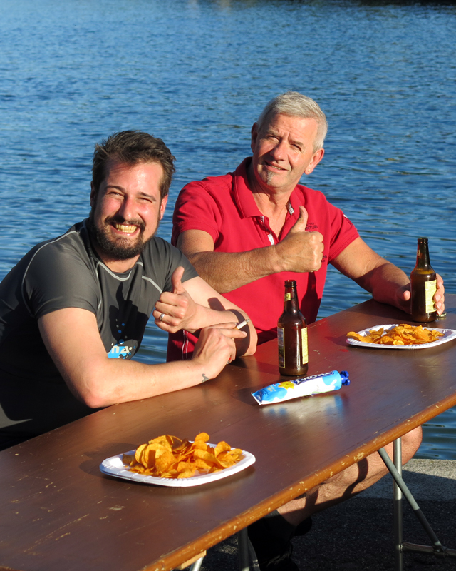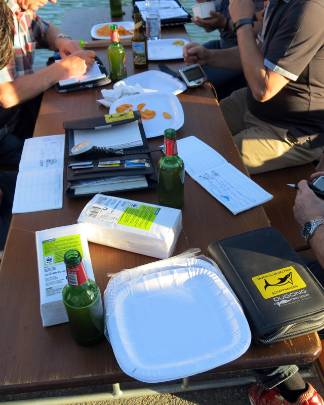 Der Unrat wurde dann vom Bootsclub fachgerecht entsorgt. Zum Ausklang servierte der gastgebende Bootsclub viel Bier, noch mehr Wasser, dann auch Wurst vom Grill mit Brot und Chips. Bei schöner Abendsonne bedankten sich Tauchleiter Kilian und der Bootsclub-Präsident Sigi bei Allen für die geleistete Arbeit, die tolle Zusammenarbeit und die Freundschaft.