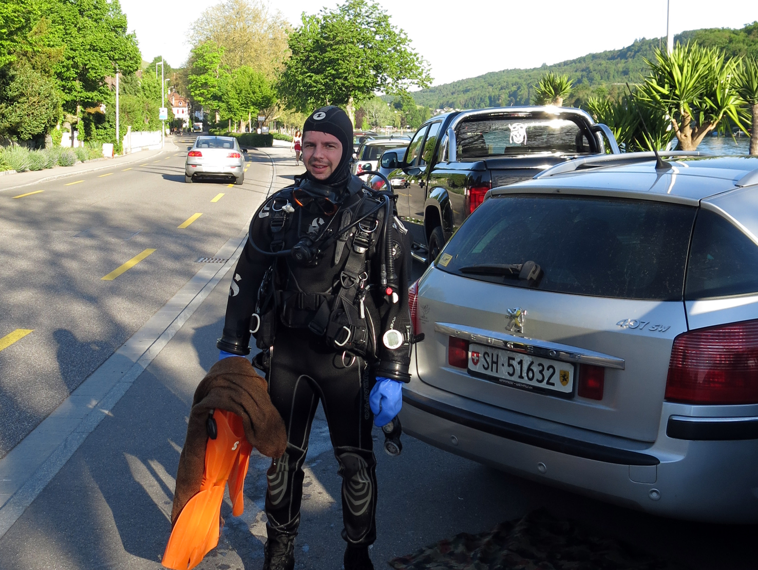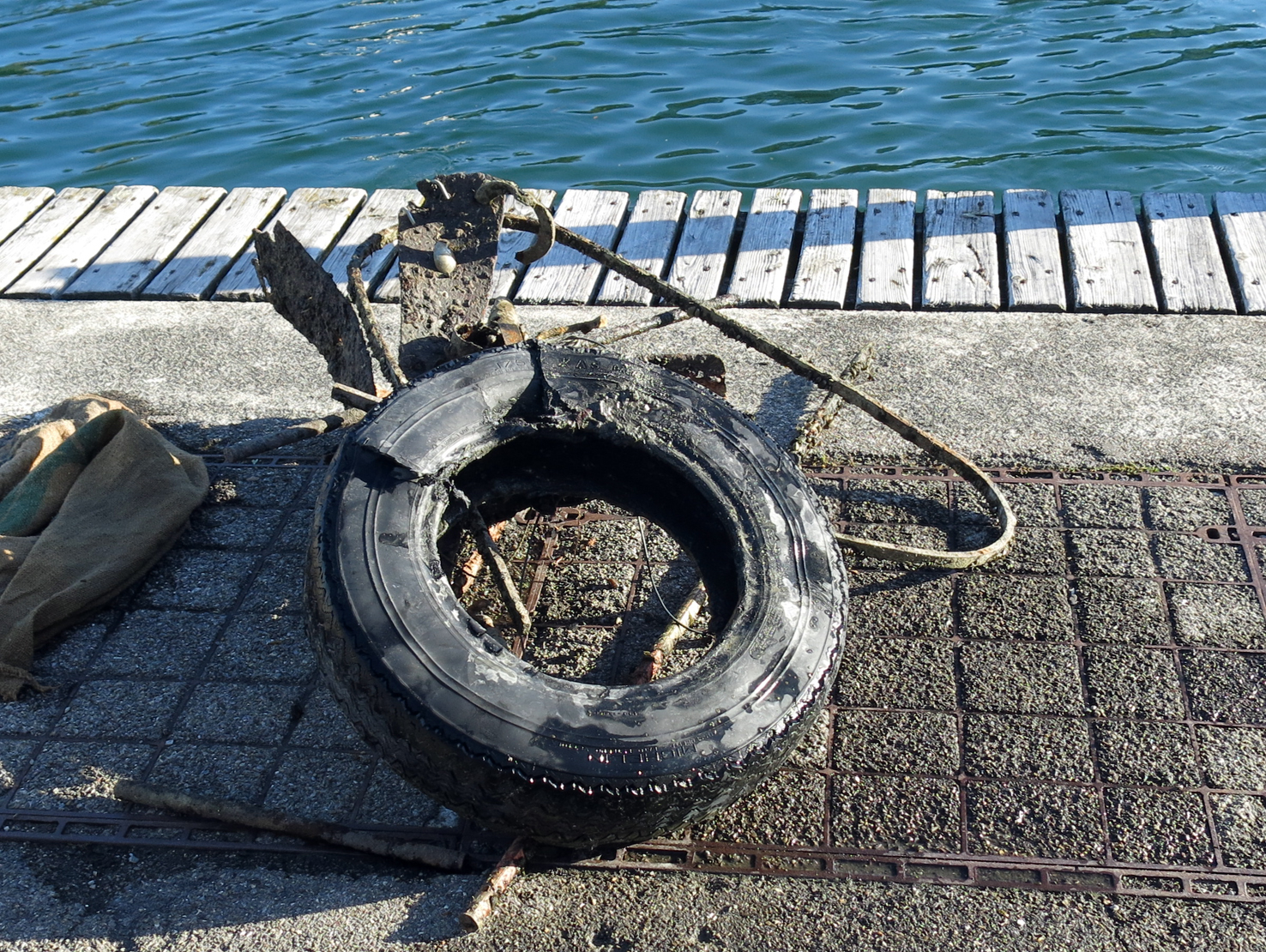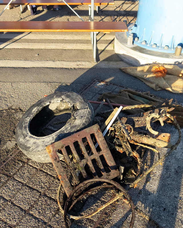 Schon bald kamen Dutzende Flaschen, Flaschendeckel und anderes Gerümpel zum Vorschein. Die Highlights waren aber sicher der sehr schwere Rammschuh mit Wiederhacken, der Abwasser Gully-Deckel sowie der Auto Pneu.
