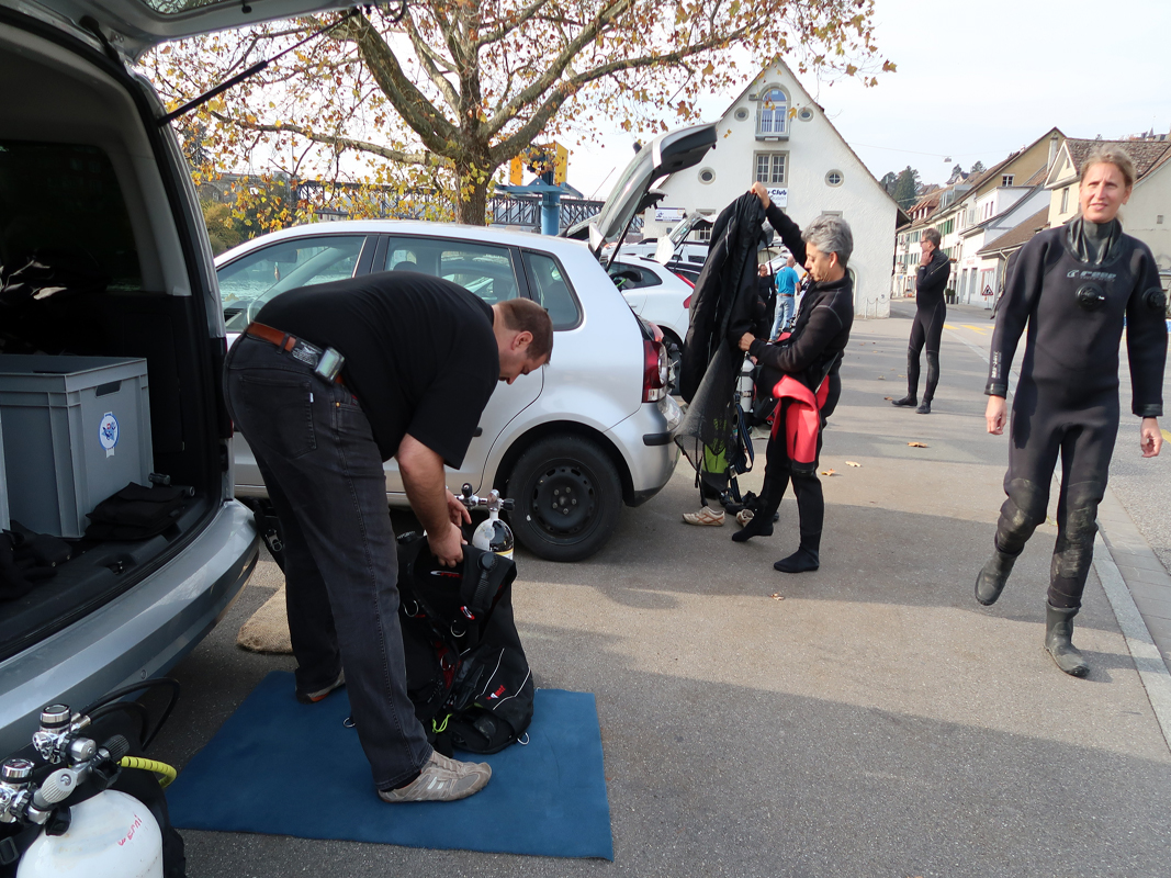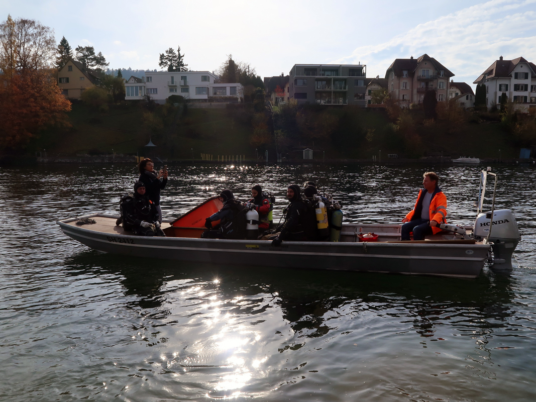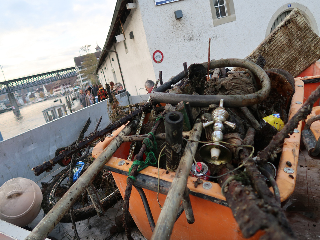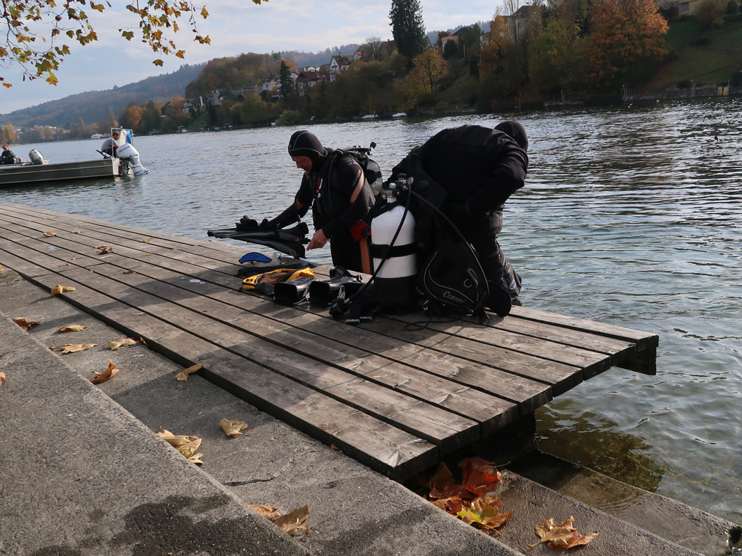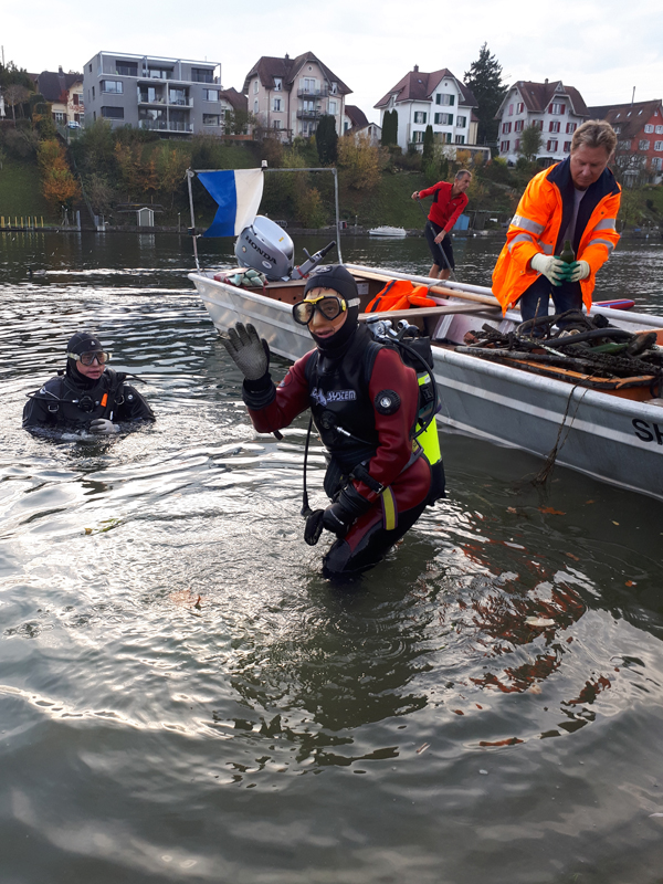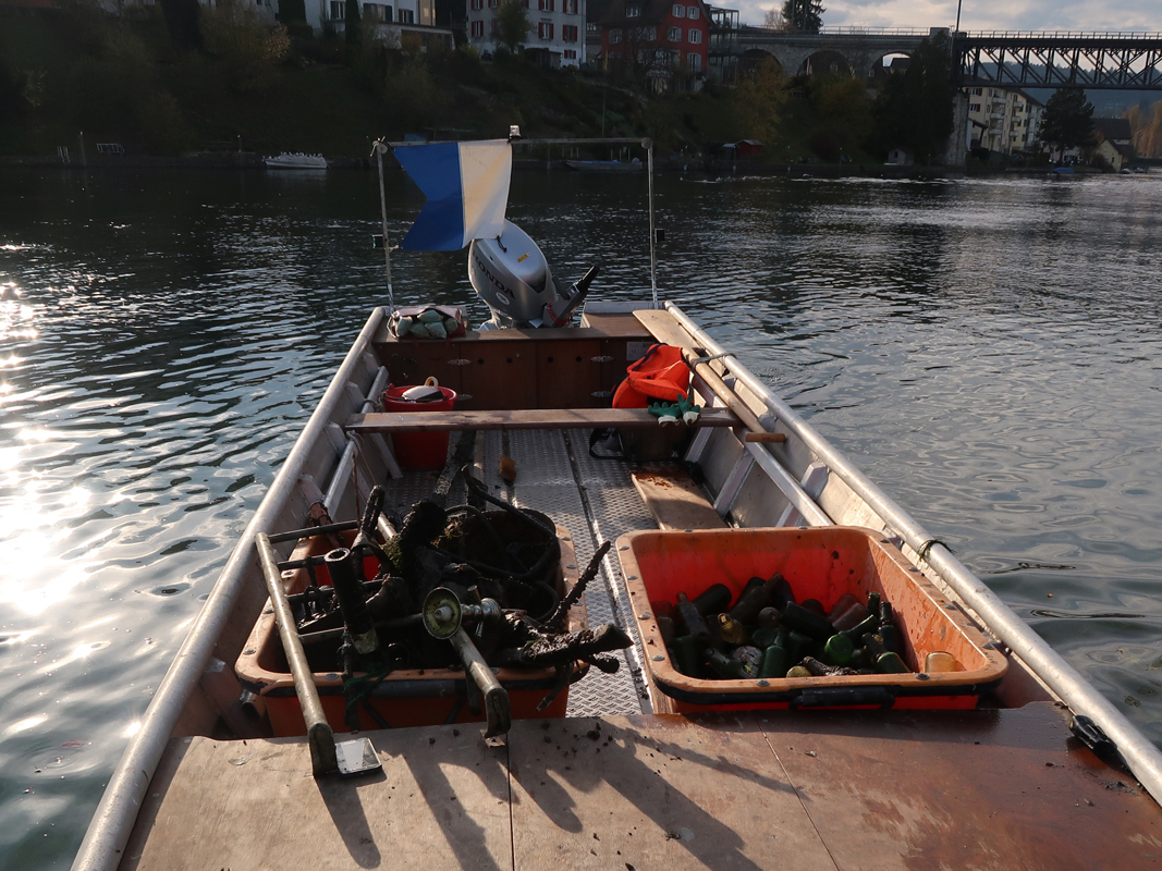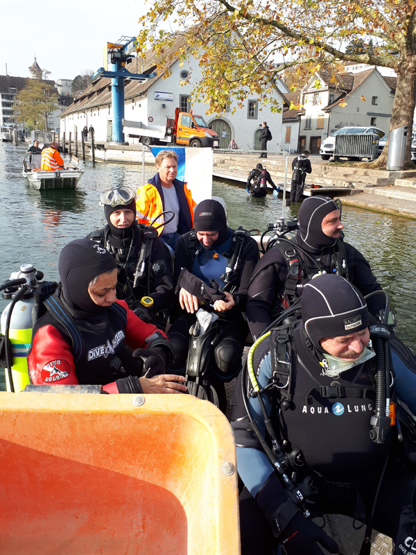 So trafen sich die 14 Taucher und 5 Helfer gutgelaunt beim Clublokal für ein Briefing. Bald ging es dann los an den Salzstadel zum Ausrüsten. Eine Gruppe von Tauchern nahm sich das Ufer in Richtung Schifflände vor, die andere wurde per Boot zur mobilen Crêperie gefahren, von wo sie das Ufer bis zum Salzstadel aufräumten. Die zwei Gruppen wurden von je einem Boot mit zwei Helfern begleitet, welche die Fundstücke von den Tauchern ins Boot hievten. Die flanierenden Spaziergänger staunten nicht schlecht, wenn plötzlich Gestalten aus dem Wasser auftauchten. Nach rund eineinhalb Stunden waren vier Kanister mit Müll gefüllt.