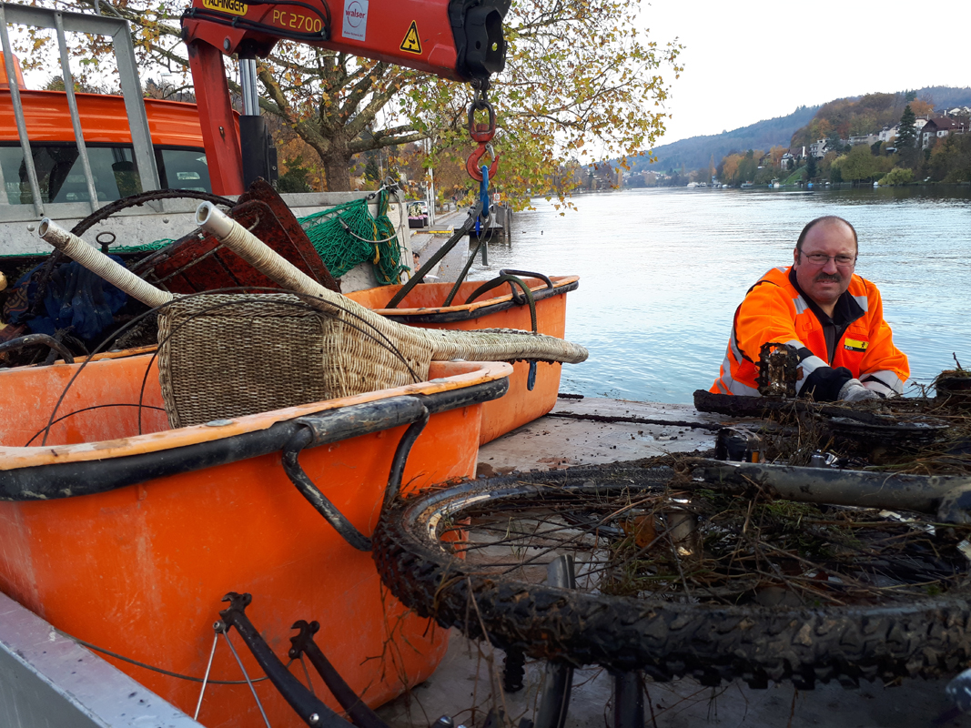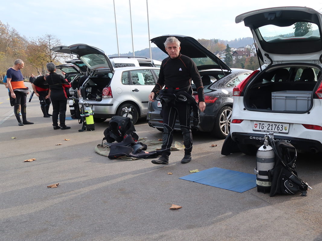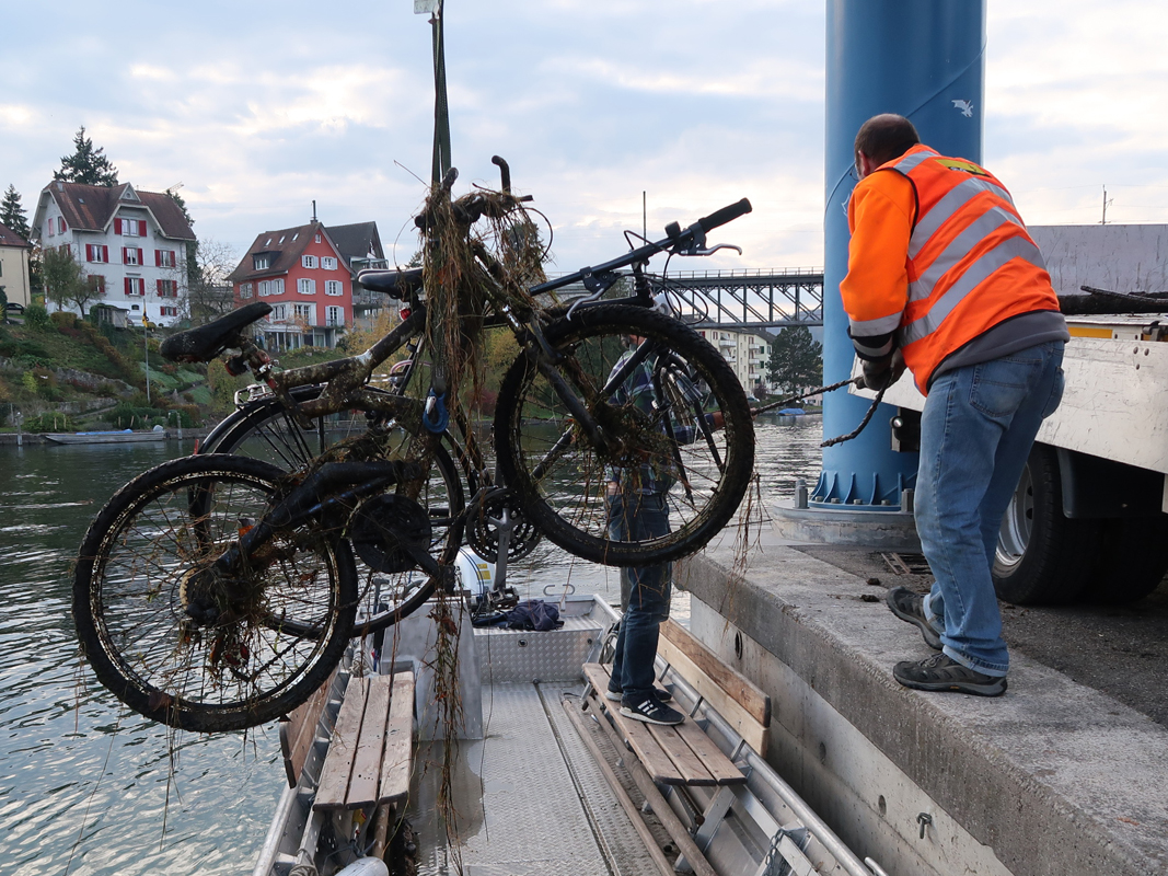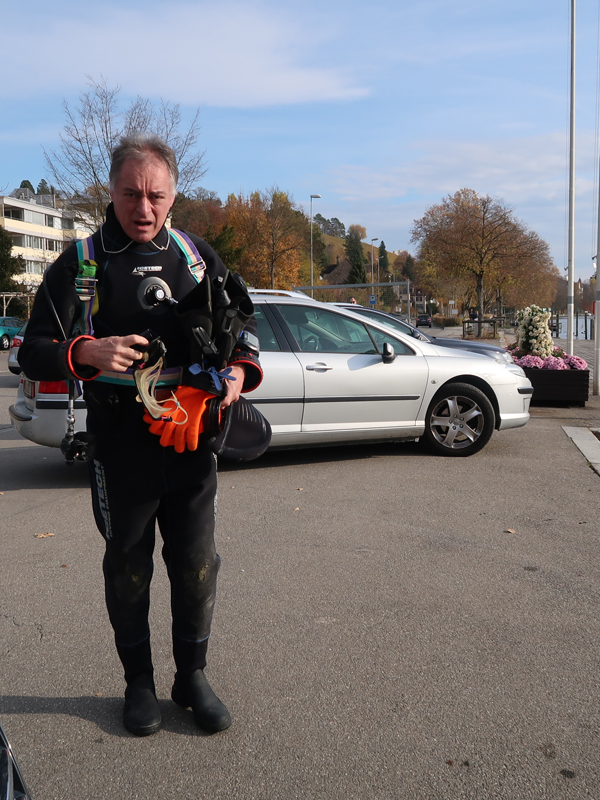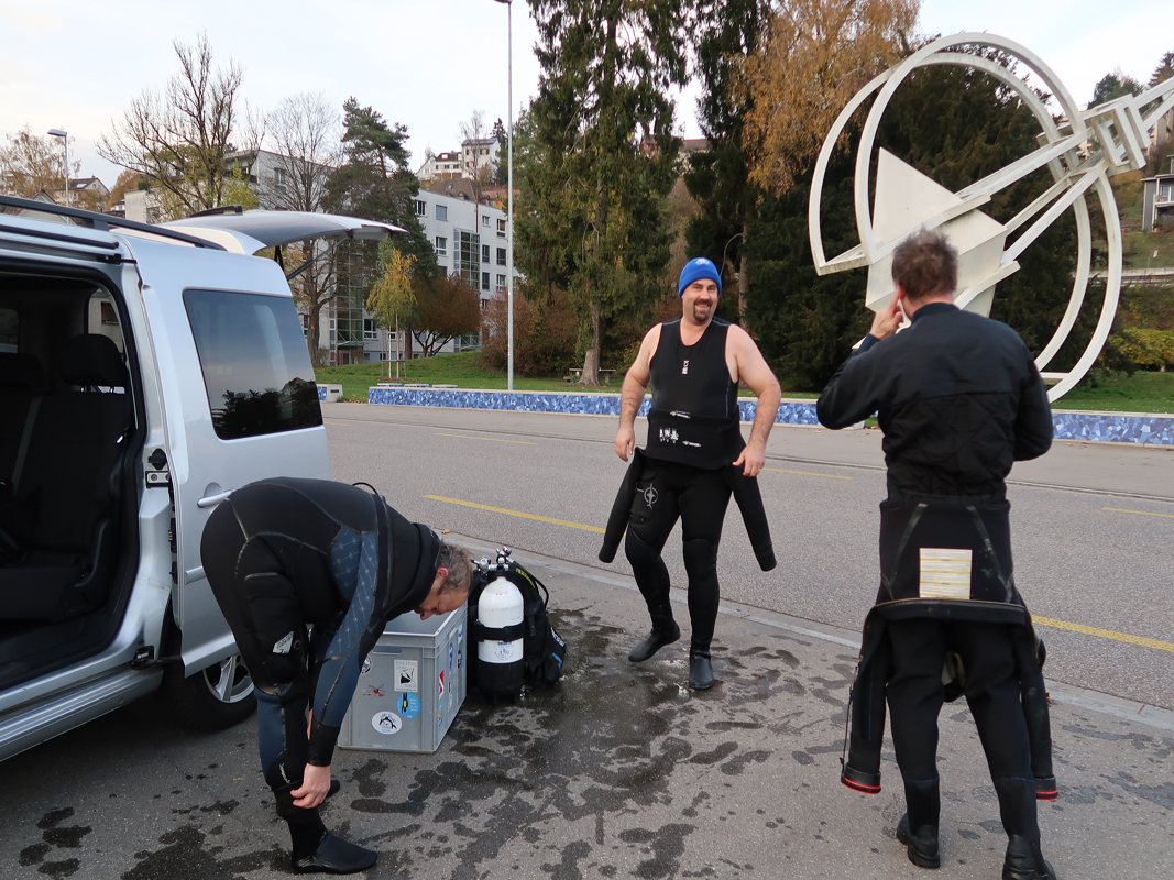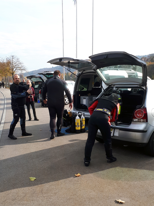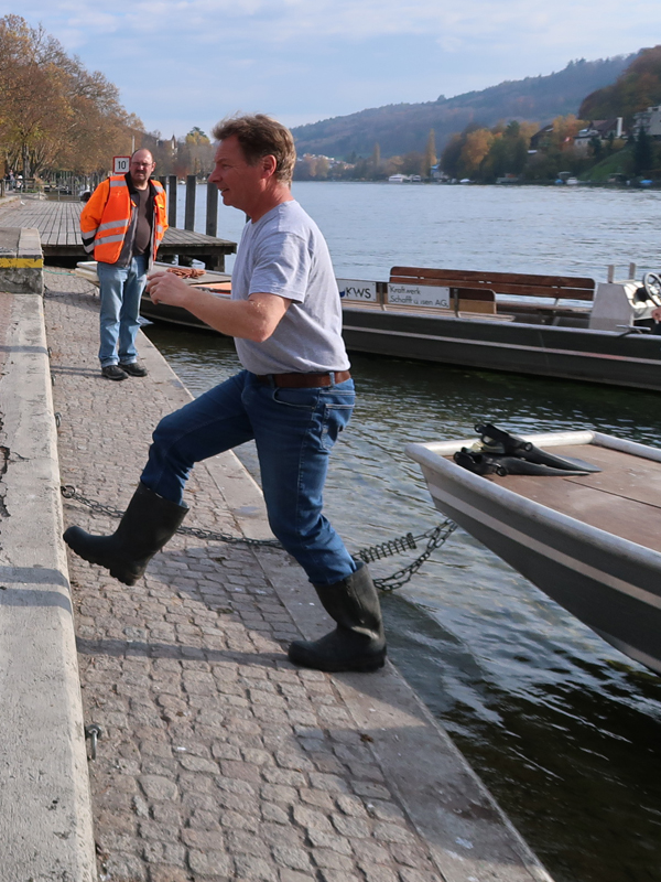 So trafen sich die 14 Taucher und 5 Helfer gutgelaunt beim Clublokal für ein Briefing. Bald ging es dann los an den Salzstadel zum Ausrüsten. Eine Gruppe von Tauchern nahm sich das Ufer in Richtung Schifflände vor, die andere wurde per Boot zur mobilen Crêperie gefahren, von wo sie das Ufer bis zum Salzstadel aufräumten. Die zwei Gruppen wurden von je einem Boot mit zwei Helfern begleitet, welche die Fundstücke von den Tauchern ins Boot hievten. Die flanierenden Spaziergänger staunten nicht schlecht, wenn plötzlich Gestalten aus dem Wasser auftauchten. Nach rund eineinhalb Stunden waren vier Kanister mit Müll gefüllt.