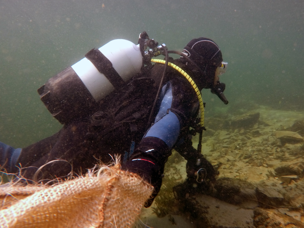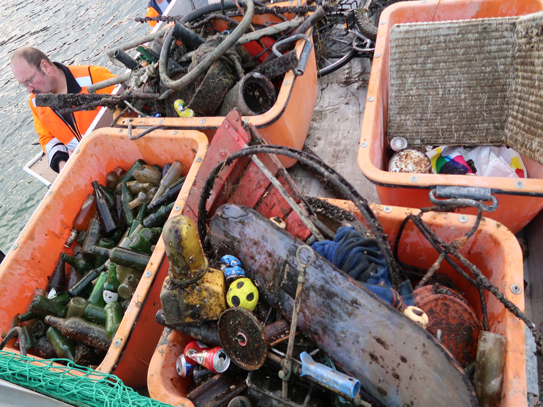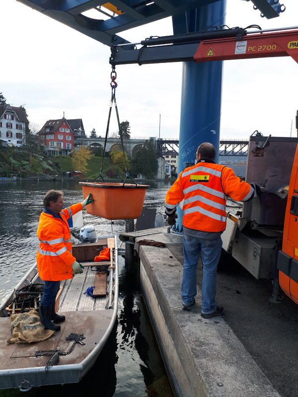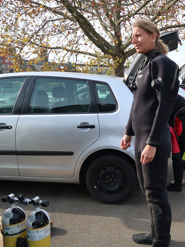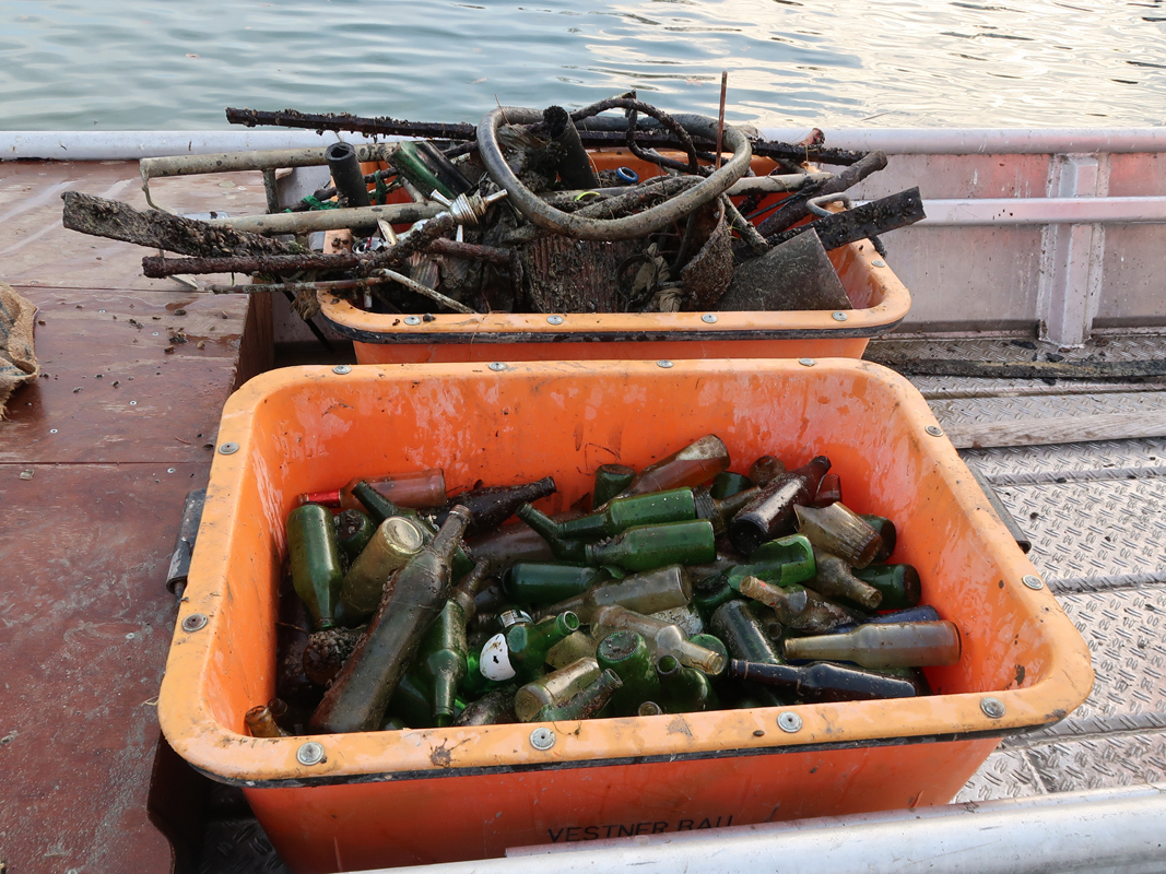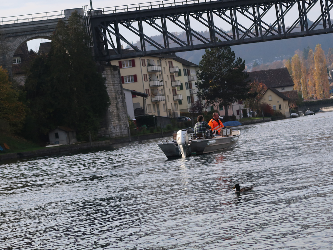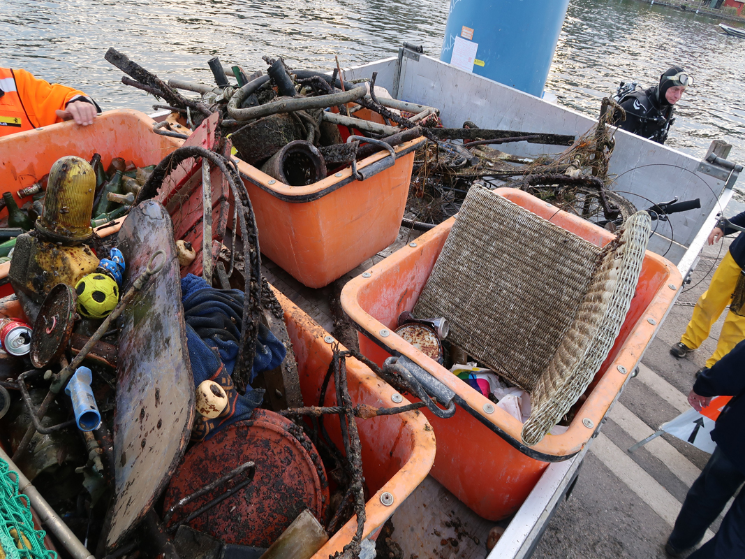 So trafen sich die 14 Taucher und 5 Helfer gutgelaunt beim Clublokal für ein Briefing. Bald ging es dann los an den Salzstadel zum Ausrüsten. Eine Gruppe von Tauchern nahm sich das Ufer in Richtung Schifflände vor, die andere wurde per Boot zur mobilen Crêperie gefahren, von wo sie das Ufer bis zum Salzstadel aufräumten. Die zwei Gruppen wurden von je einem Boot mit zwei Helfern begleitet, welche die Fundstücke von den Tauchern ins Boot hievten. Die flanierenden Spaziergänger staunten nicht schlecht, wenn plötzlich Gestalten aus dem Wasser auftauchten. Nach rund eineinhalb Stunden waren vier Kanister mit Müll gefüllt.