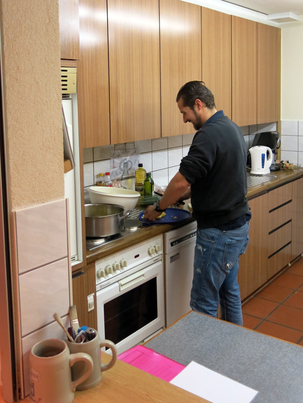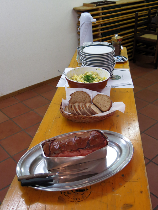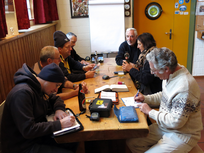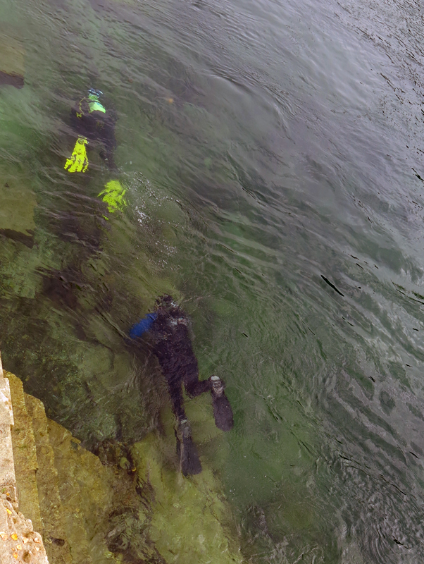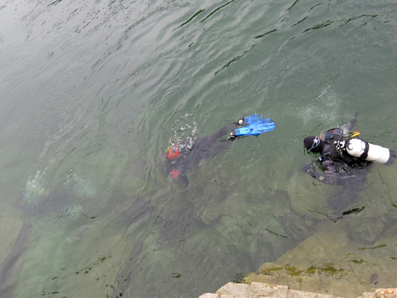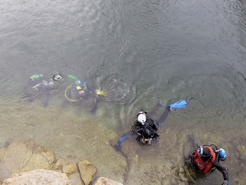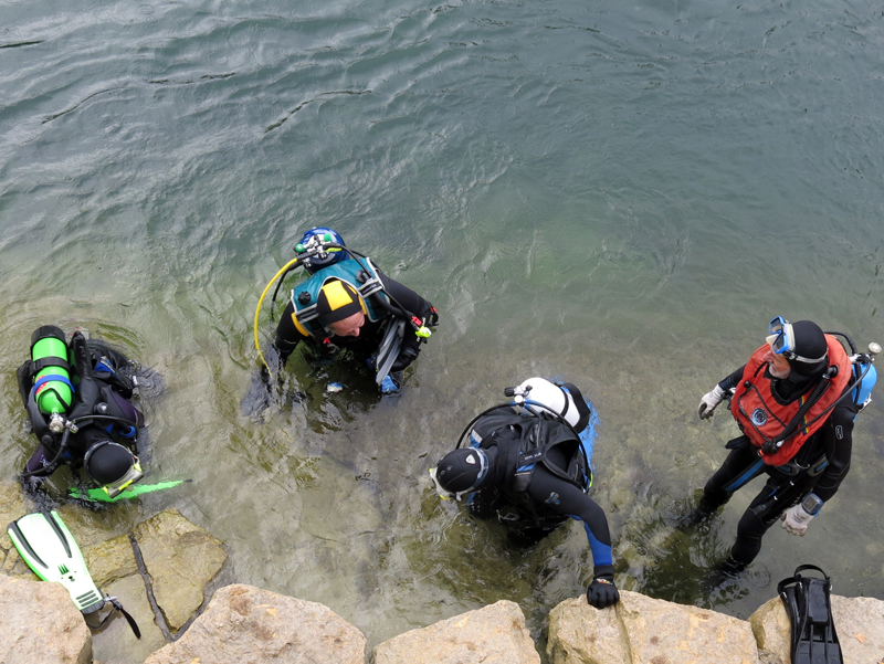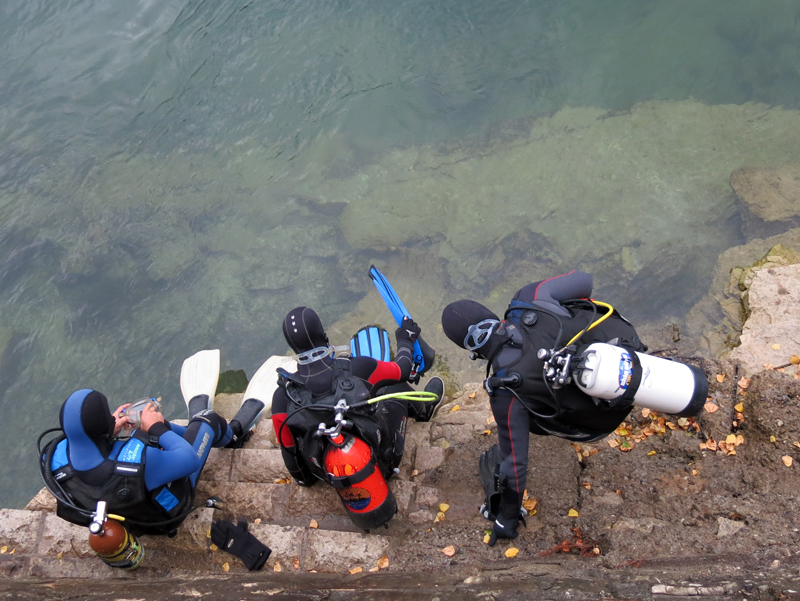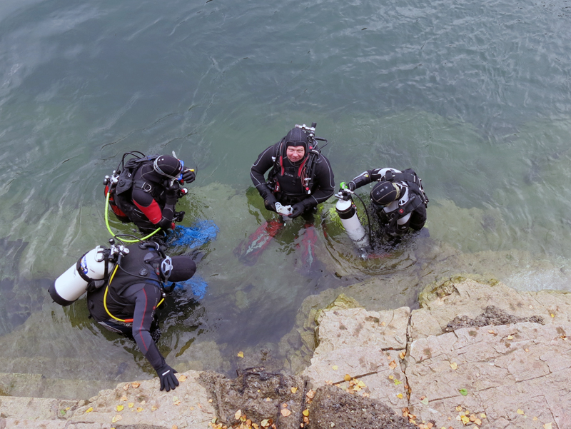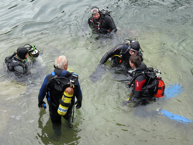 Mit strahlenden Gesichtern und annimierten Gesprächen warteten die Taucher und Helfer nach dem ersten Rheinerlebis auf das vom Tages-Beizer Adrian servierte Essen. Der Fleischkäse und der von Adrian selber gemachte Kartoffelsalat gaben genug Stärkung für den Nachmittagstauchgang. Dieser wurde auf Grund des einsetzenden Regens auch am Hausriff abgehalten. Die Tauchgruppen formierten sich zum Teil neu, und nach dem Briefing begab man sich wieder ins Wasser.