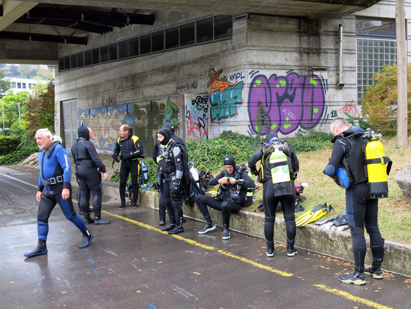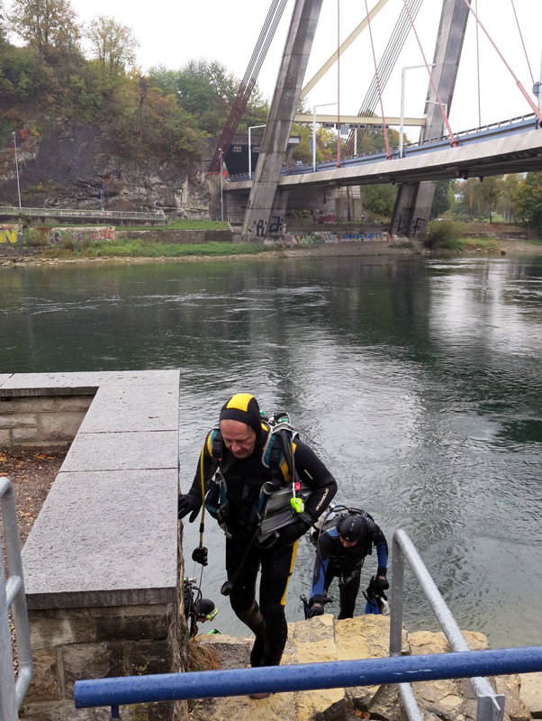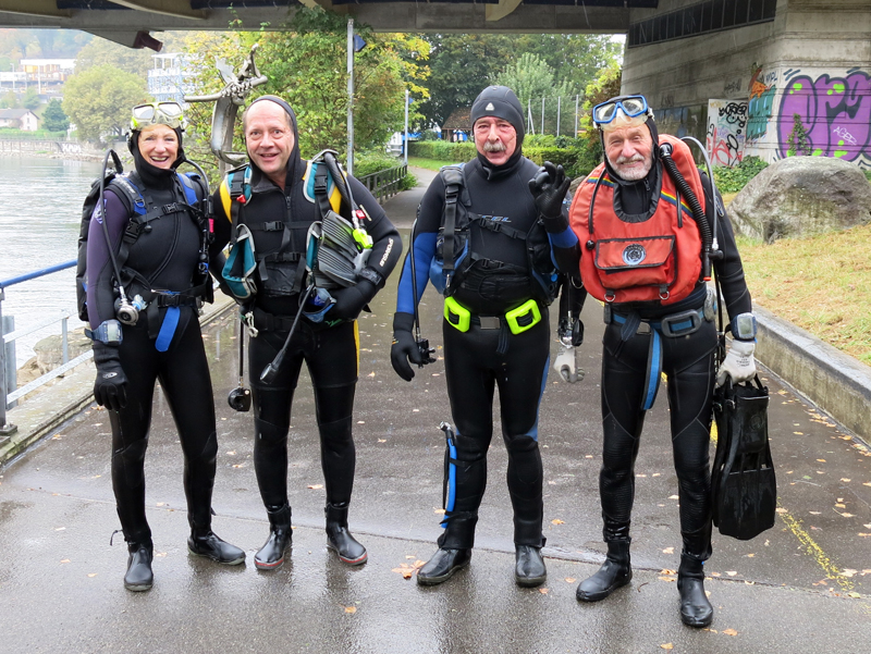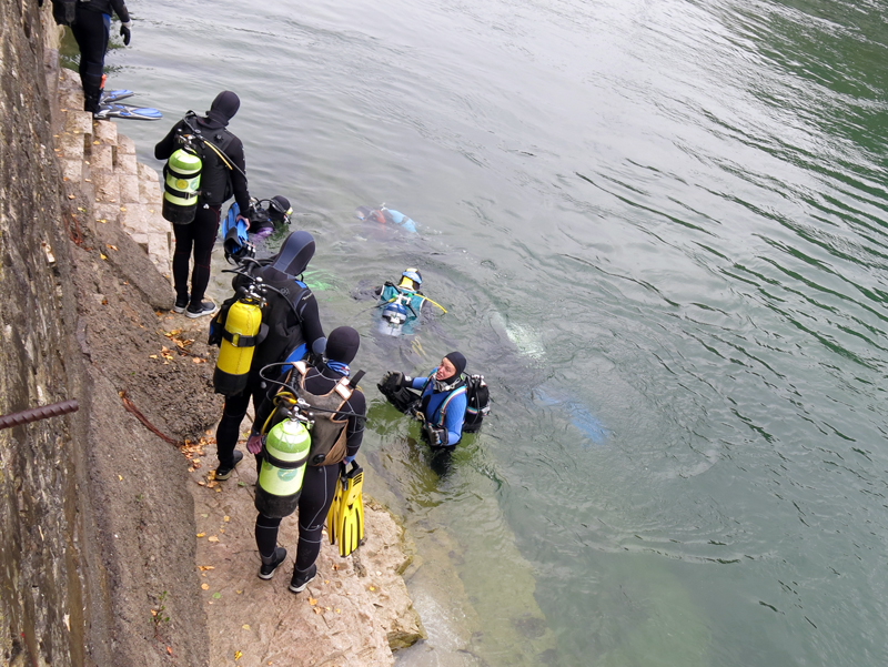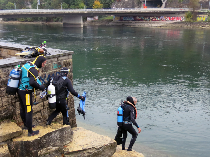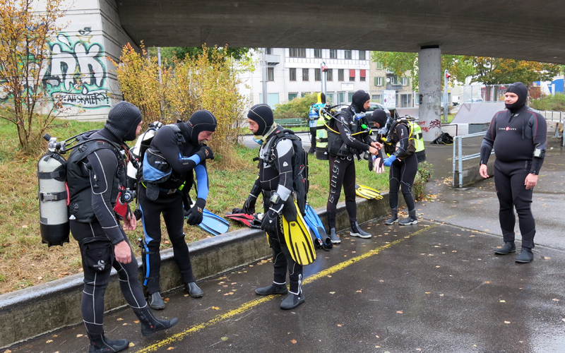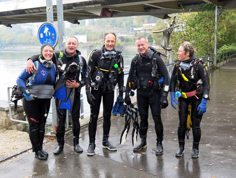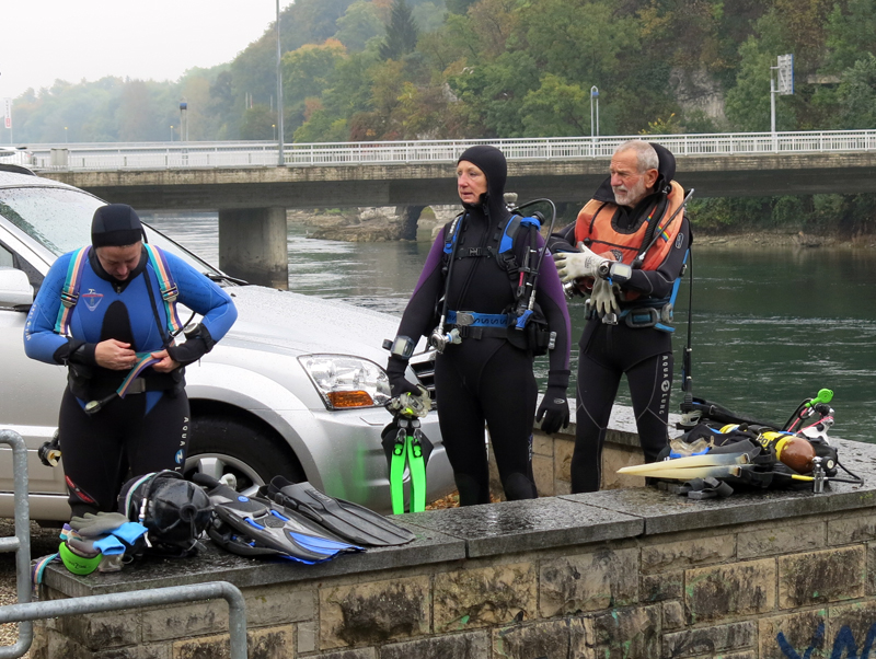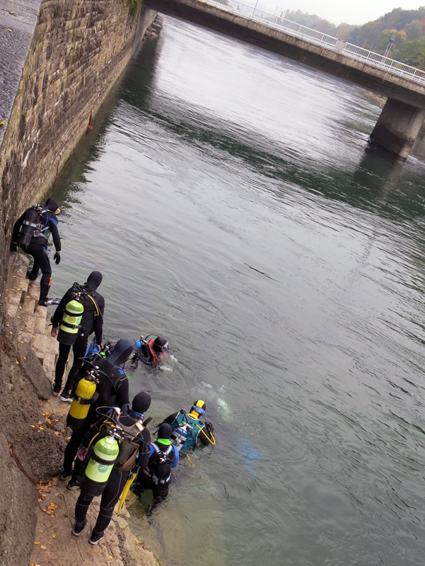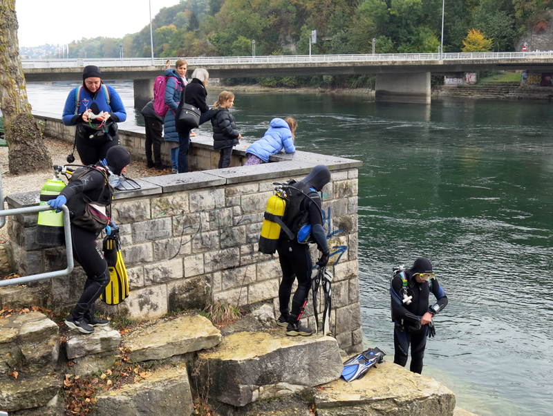 Die neun TC Neptun-Taucher wurden mit den acht Delphin-Tauchern zu homogenen Gruppen zusammengestellt. Die individuellen Gruppen-Briefings regelten die Routen, die Tauchzeit, das Verhalten bei Zwischenfällen und vieles mehr. Mit all diesen Informationen wurden die Ausrüstungen zusammengebaut und auf die Rhein-Tauglichkeit kontrolliert. Dann hiess es GUET LUFT und los ging es los. Der Rhein war für einige Freunde vom TC Neptun als Tauchplatz noch unbekannt und zollte den einen oder anderen Respekt.