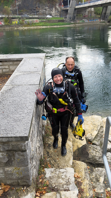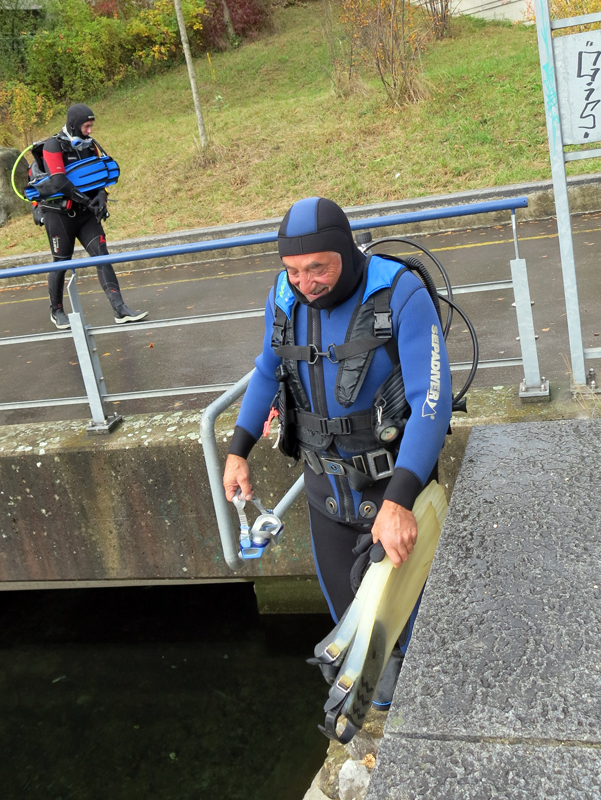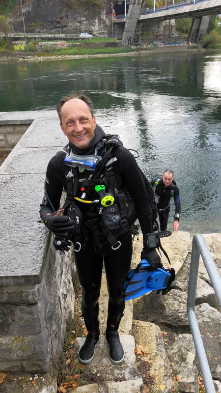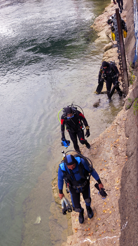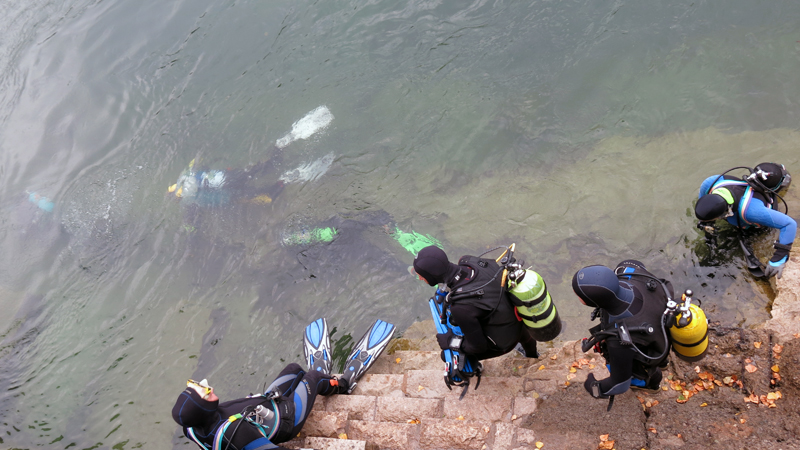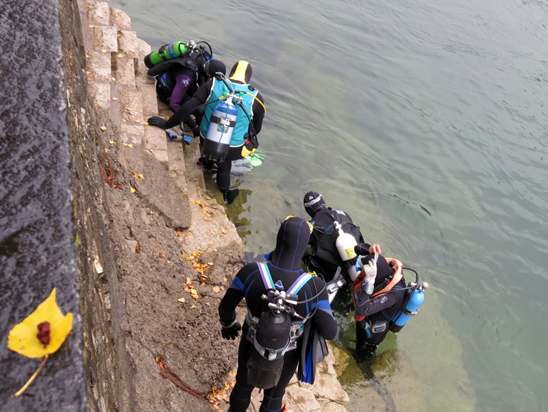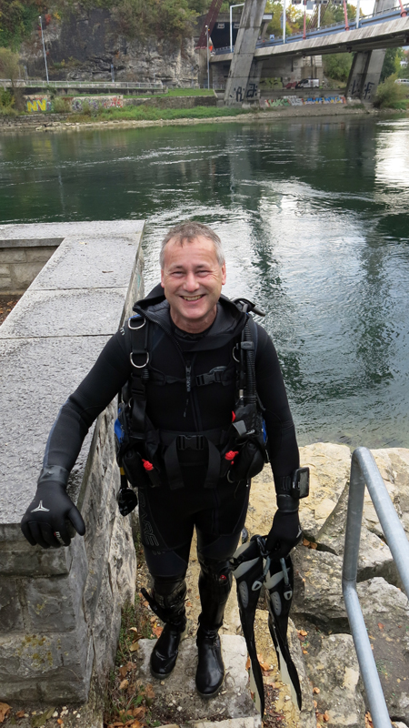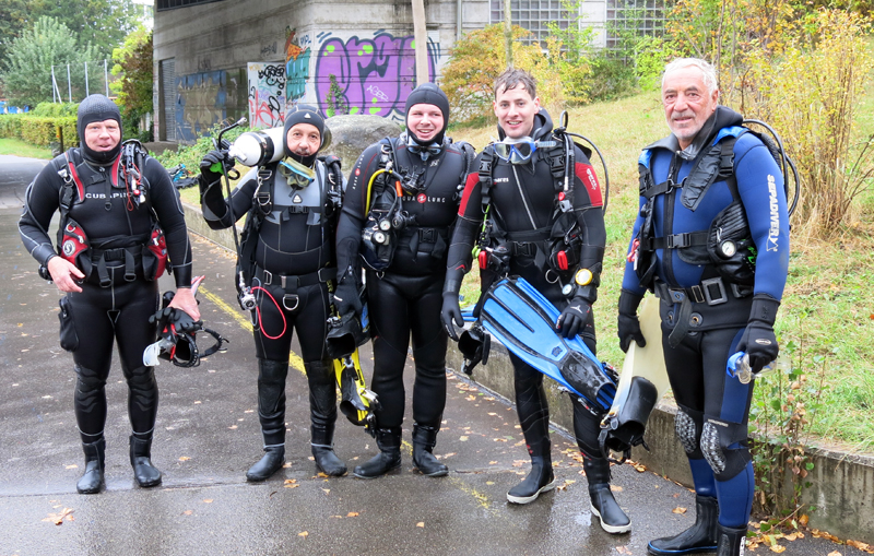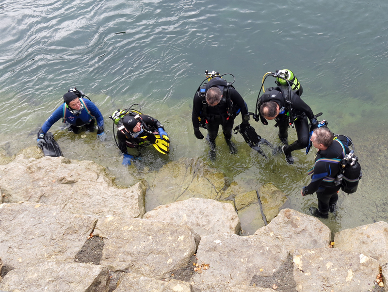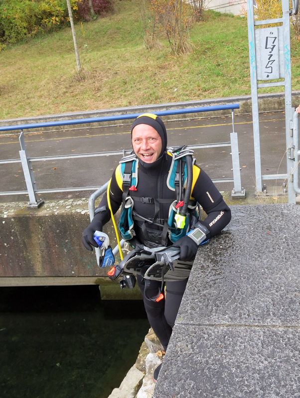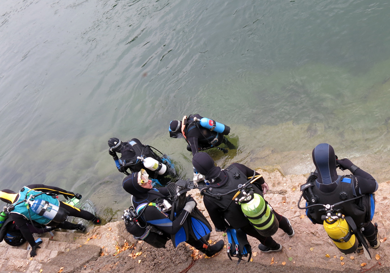 Die neun TC Neptun-Taucher wurden mit den acht Delphin-Tauchern zu homogenen Gruppen zusammengestellt. Die individuellen Gruppen-Briefings regelten die Routen, die Tauchzeit, das Verhalten bei Zwischenfällen und vieles mehr. Mit all diesen Informationen wurden die Ausrüstungen zusammengebaut und auf die Rhein-Tauglichkeit kontrolliert. Dann hiess es GUET LUFT und los ging es los. Der Rhein war für einige Freunde vom TC Neptun als Tauchplatz noch unbekannt und zollte den einen oder anderen Respekt.
