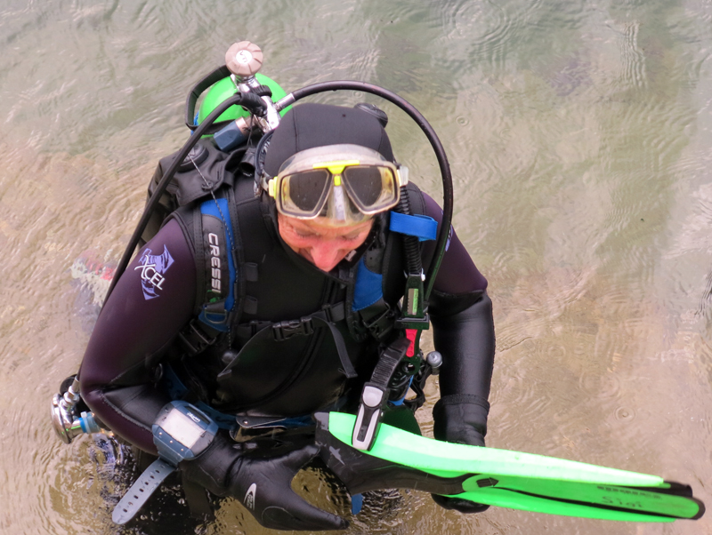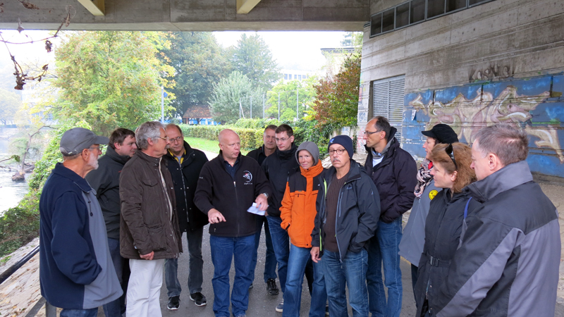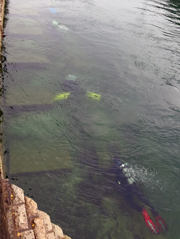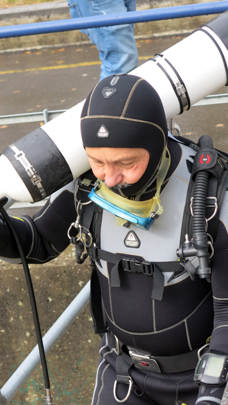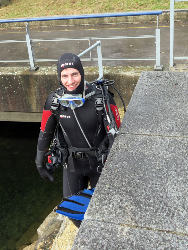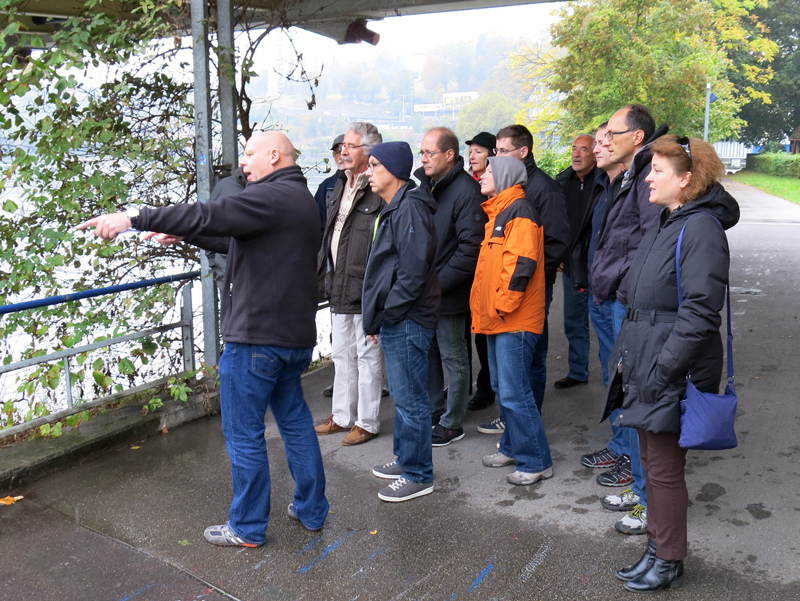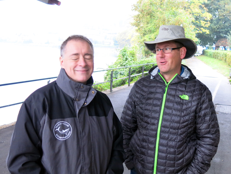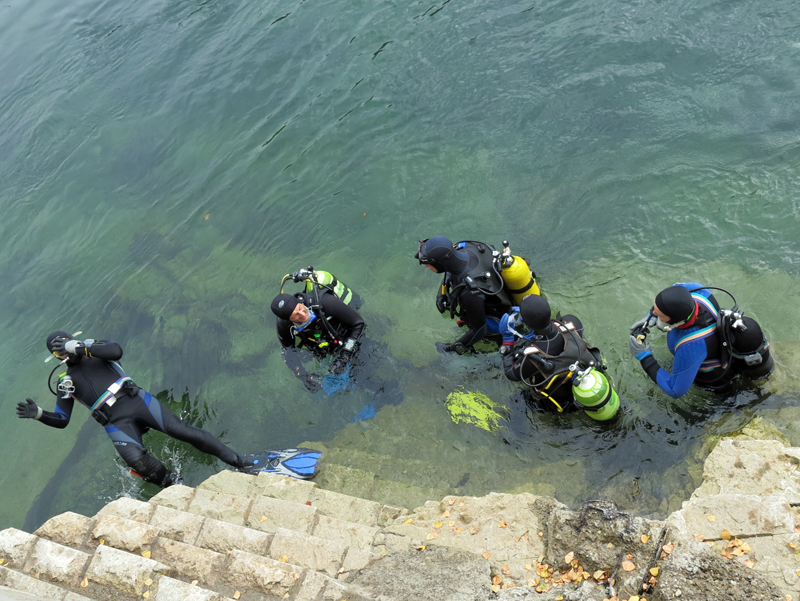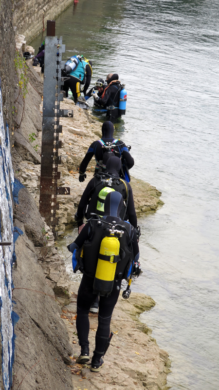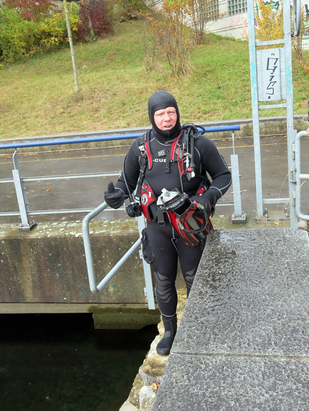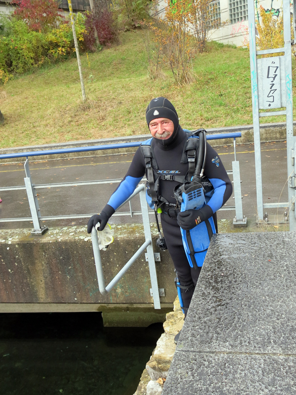 Die neun TC Neptun-Taucher wurden mit den acht Delphin-Tauchern zu homogenen Gruppen zusammengestellt. Die individuellen Gruppen-Briefings regelten die Routen, die Tauchzeit, das Verhalten bei Zwischenfällen und vieles mehr. Mit all diesen Informationen wurden die Ausrüstungen zusammengebaut und auf die Rhein-Tauglichkeit kontrolliert. Dann hiess es GUET LUFT und los ging es los. Der Rhein war für einige Freunde vom TC Neptun als Tauchplatz noch unbekannt und zollte den einen oder anderen Respekt.