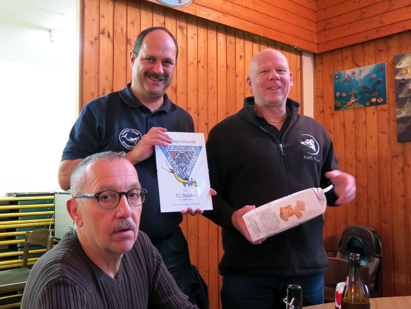 Der anschliessende Kaffee rundete bei einigen zusammen mit einer warmen Dusche und dem Loggbuchschreiben die Rheinerfahrungen ab. Der TC Neptun Muttenz Präsident Maurice Jeanguenin verdankte dem Tauchclub Delphin die Organisation, die Gastfreundschaft und das tolle Essen, und überreichte den Delphinen ein eingerahmtes Dankeschön mit dem TC Neptun-Logo (hängt seither im Clublokal). Der Delphin Präsident Martin, wünschte anschliessend allen anwesenden Tauchern, Helfern und Begleiterinnen eine gute, zwischenfalllose und gesunde Heimreise.