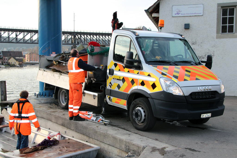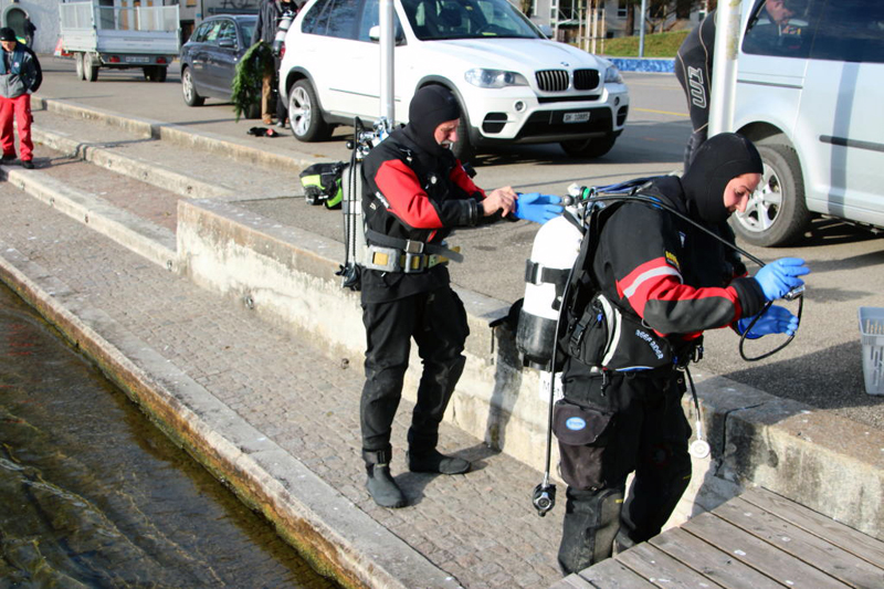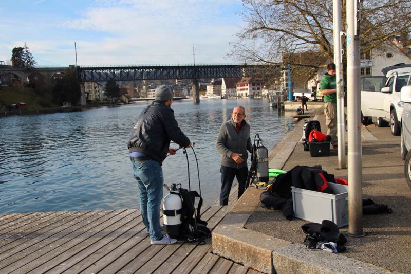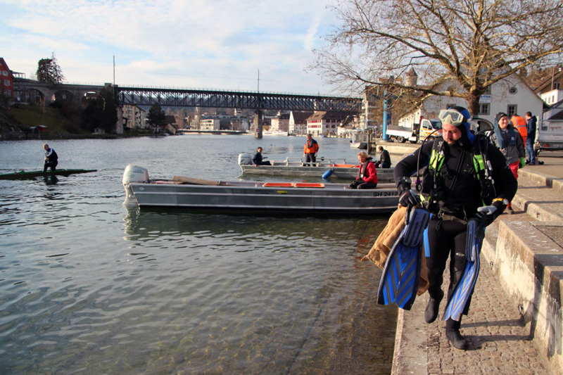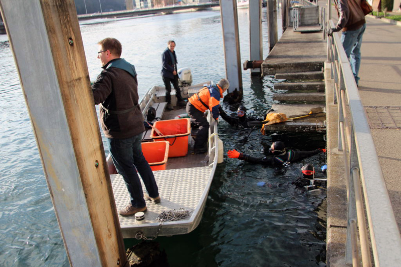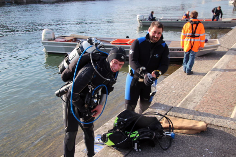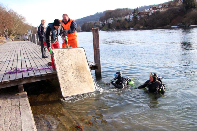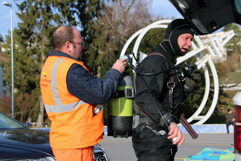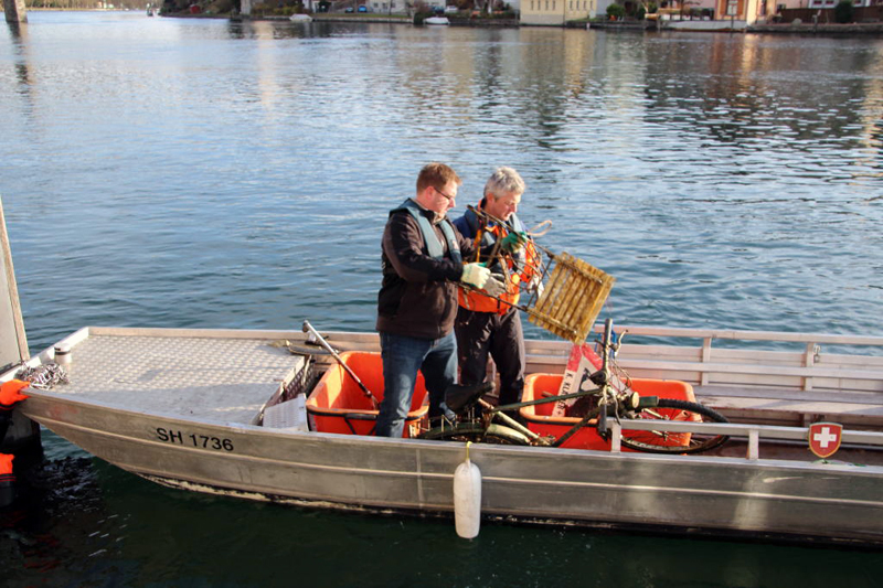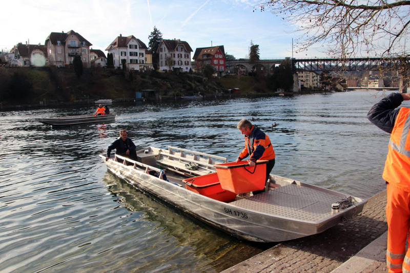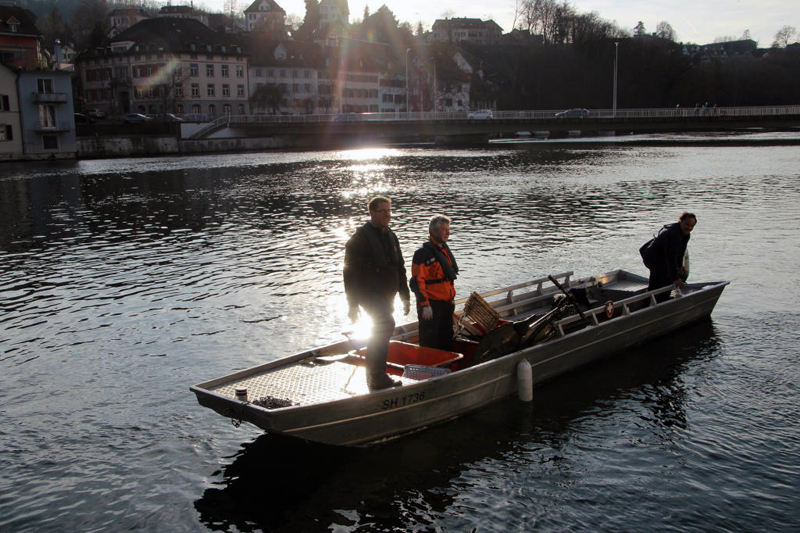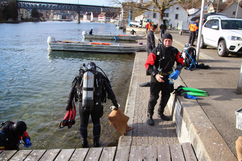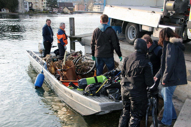 Organisiert vom Tiefbauamt des Kantons Schaffhausen finden sich am Samstagnachmittag 10 Taucher des Tauchclubs Delphin Schaffhausen zu einer Rhyputzte am Salzstadel ein. Schön warm eingepackt in Trockentauchanzüge und ausgerüstet mit Säcken verschwinden sie über 1 Std. lang in dem 8 °C kalten Wasser und bringen die unmöglichsten Gegenstände an die Oberfläche, die die Besatzung zweier Weidlinge entgegennimmt. Ausser dem «gewöhnlichen Unrat» wie Flaschen und Dosen werden mehrere Velos, Tafeln, Reifen, Molankegel, Paddel, ein Tisch, ein Schlauchboot, Kickboards, ein Bügelbrett, Stühle, ein Kinderbett u. v. m. an Land gebracht. Verladen wird der Müll auf den LKW des Tiefbauamtes und fachgerecht entsorgt.
