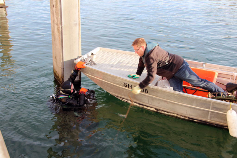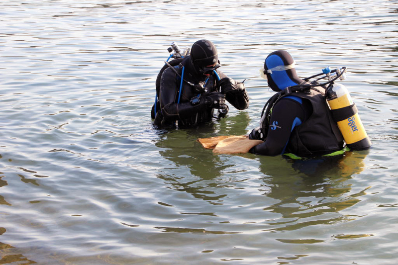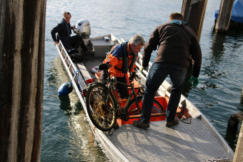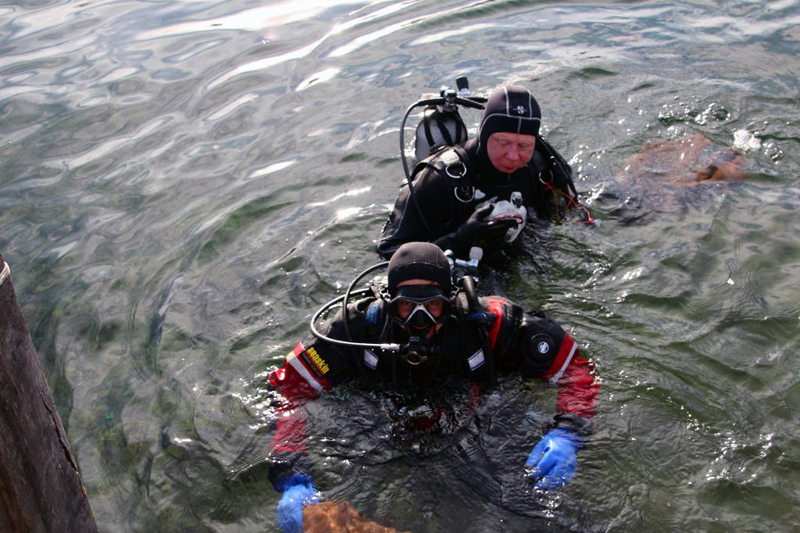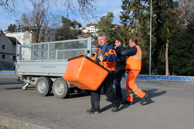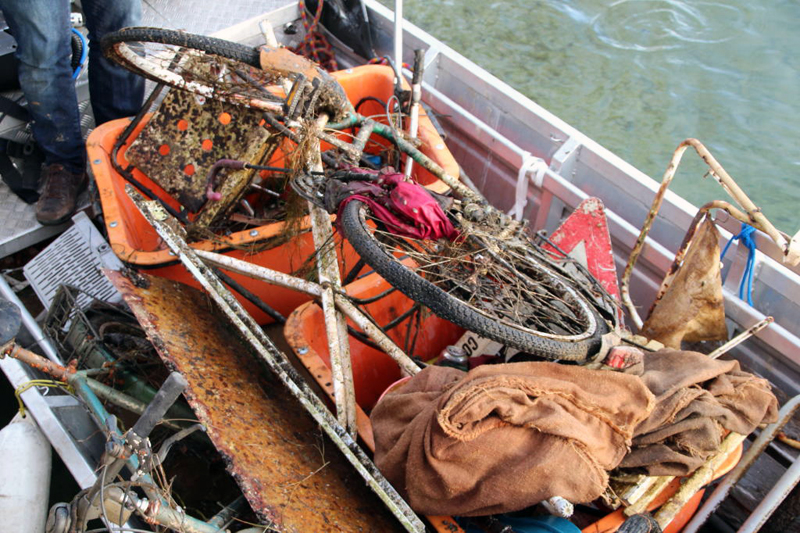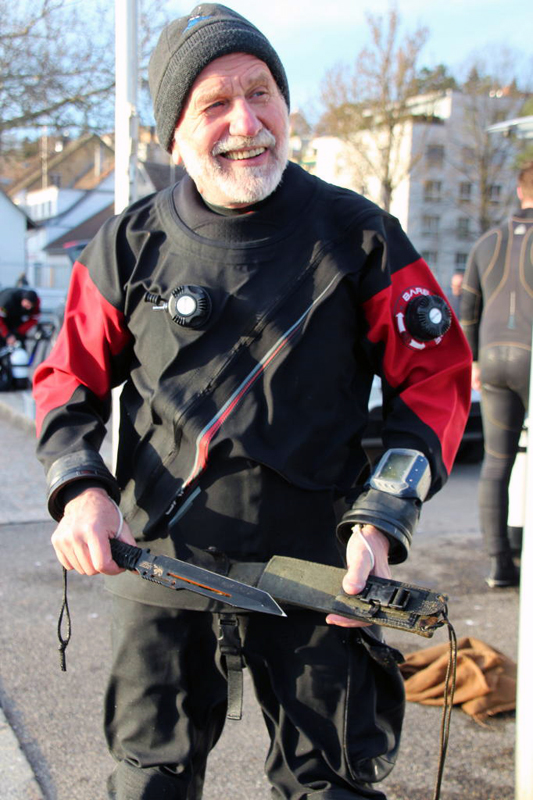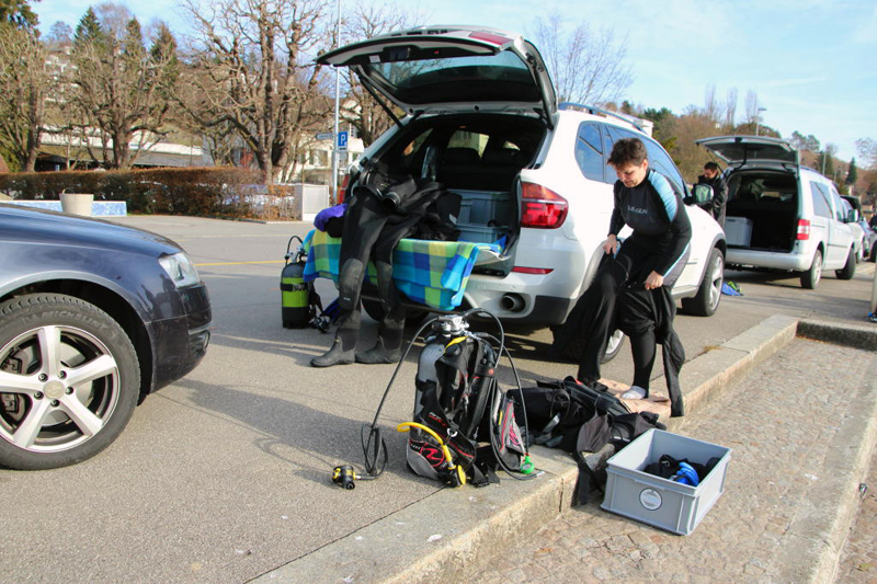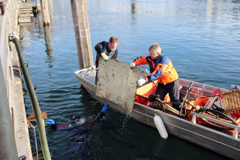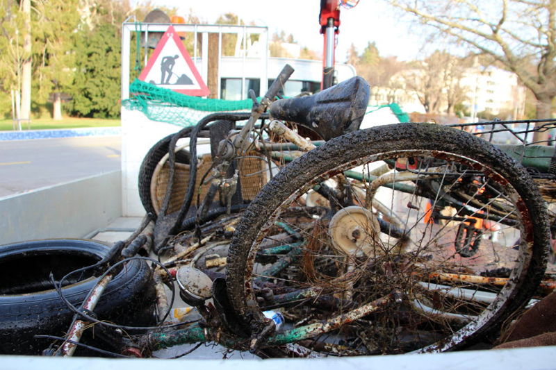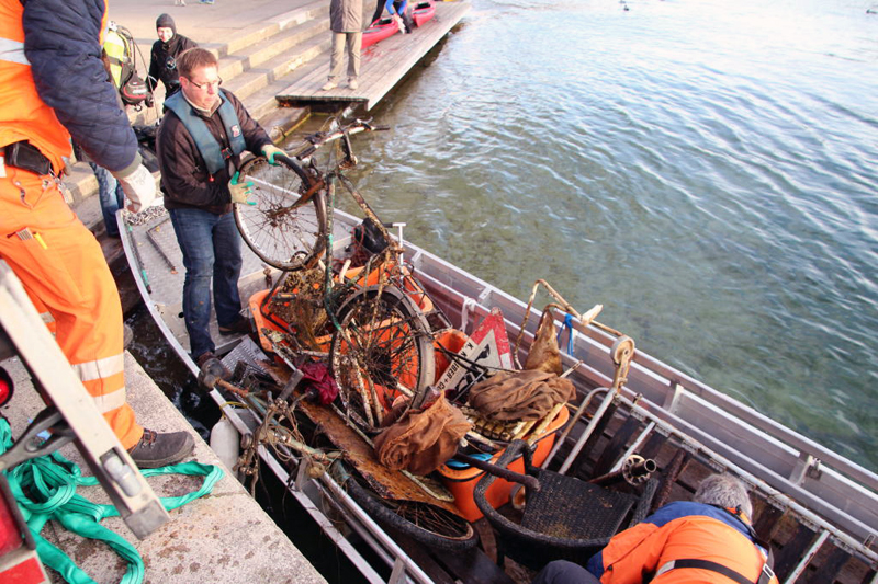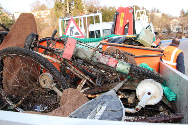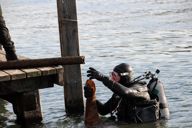 Organisiert vom Tiefbauamt des Kantons Schaffhausen finden sich am Samstagnachmittag 10 Taucher des Tauchclubs Delphin Schaffhausen zu einer Rhyputzte am Salzstadel ein. Schön warm eingepackt in Trockentauchanzüge und ausgerüstet mit Säcken verschwinden sie über 1 Std. lang in dem 8 °C kalten Wasser und bringen die unmöglichsten Gegenstände an die Oberfläche, die die Besatzung zweier Weidlinge entgegennimmt. Ausser dem «gewöhnlichen Unrat» wie Flaschen und Dosen werden mehrere Velos, Tafeln, Reifen, Molankegel, Paddel, ein Tisch, ein Schlauchboot, Kickboards, ein Bügelbrett, Stühle, ein Kinderbett u. v. m. an Land gebracht. Verladen wird der Müll auf den LKW des Tiefbauamtes und fachgerecht entsorgt.