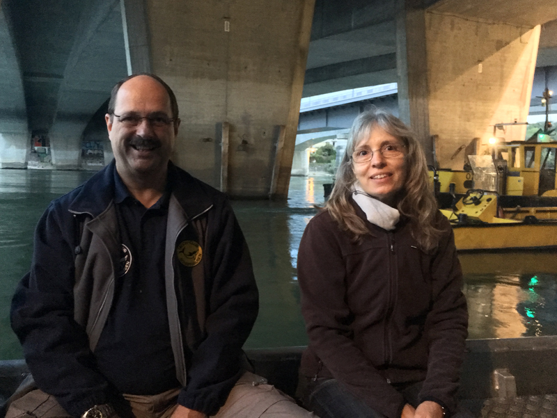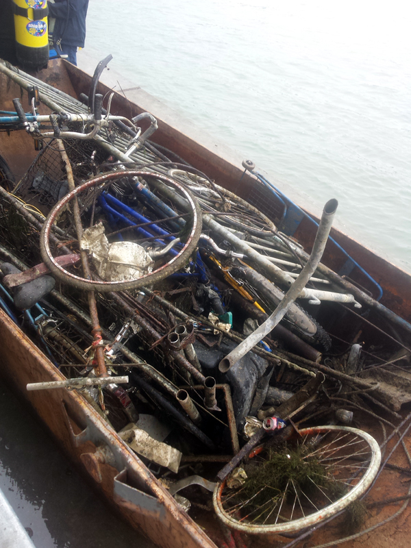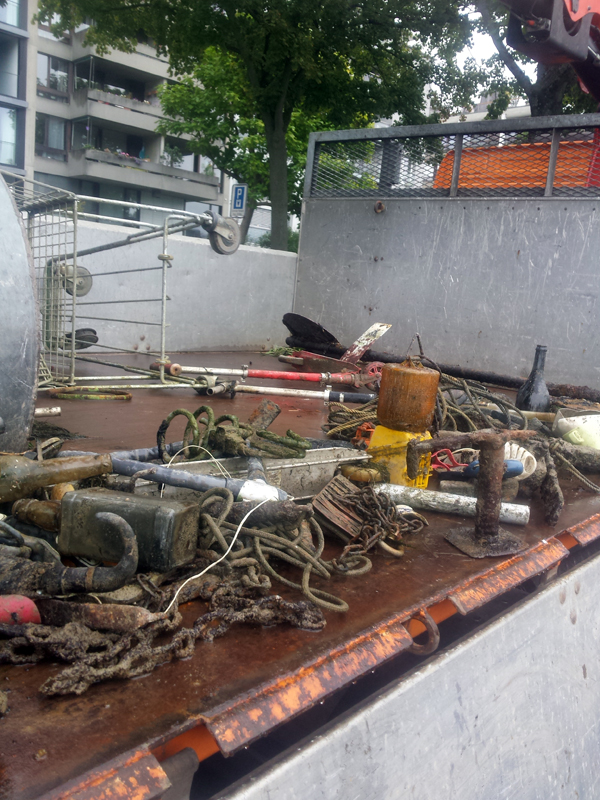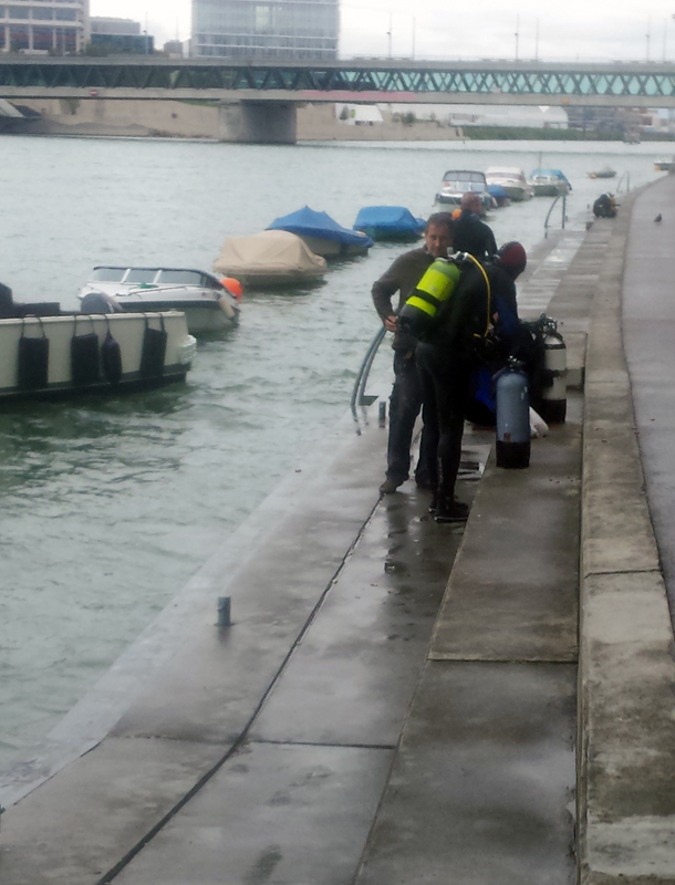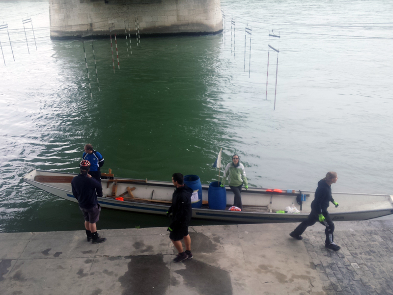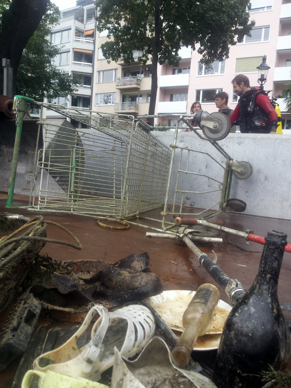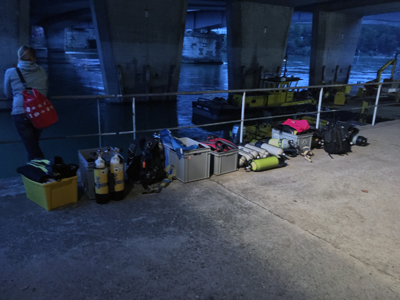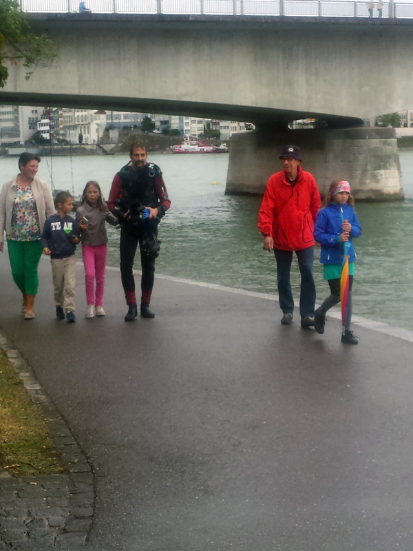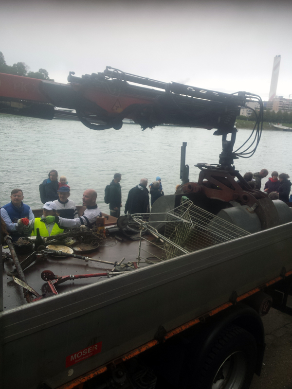 Um 06.30 Uhr stärkten wir uns beim Frühstücksbuffet. Beim Birskopfweglein konnten wir beim WALO Ponton parkieren und um 07.15 Uhr die wartenden Boote mit Sack und Pack beladen. In der Morgendämmerung fuhren wir dann bei kühlen Temperaturen auf dem Rhein zum Sammelplatz. Dort wurde gerödelt was das Zeugs hält. Die einzelnen Gruppen räumten dann ihren zugeteilten Rheinsektor sehr gründlich auf. Insgesamt haben die ca. 70 Taucher (aus diversen Tauch-Clubs aus der Schweiz und Deutschland) die beachtliche Menge von ca. 9 Tonnen Unrat aus dem Rhein geborgen. Leider war der Wettergott kein «Basler». Zwischendurch schüttete es aus Kübeln, so dass einige Land-Helfer auch nass wurden (solidarisch, zu den Tauchern).