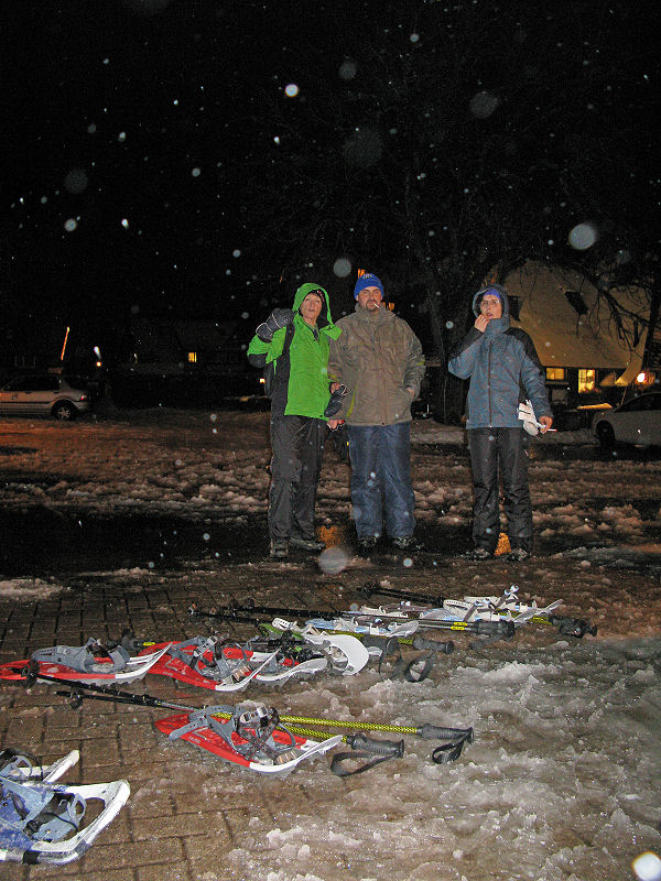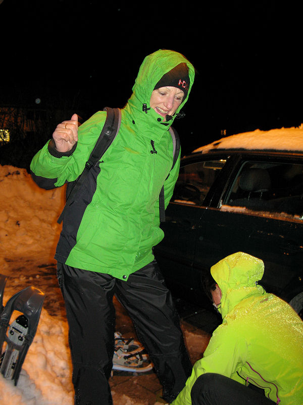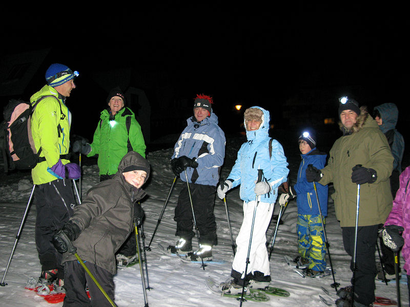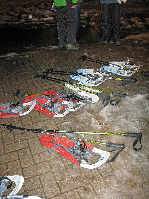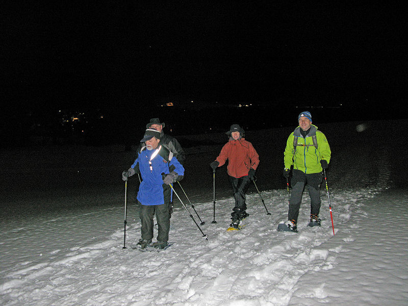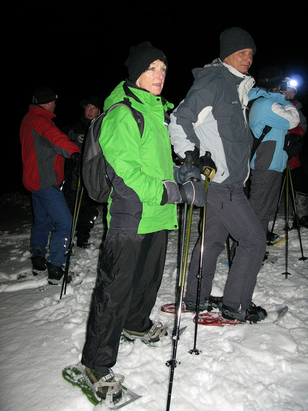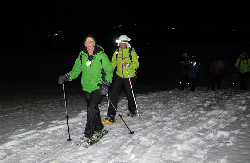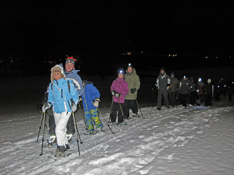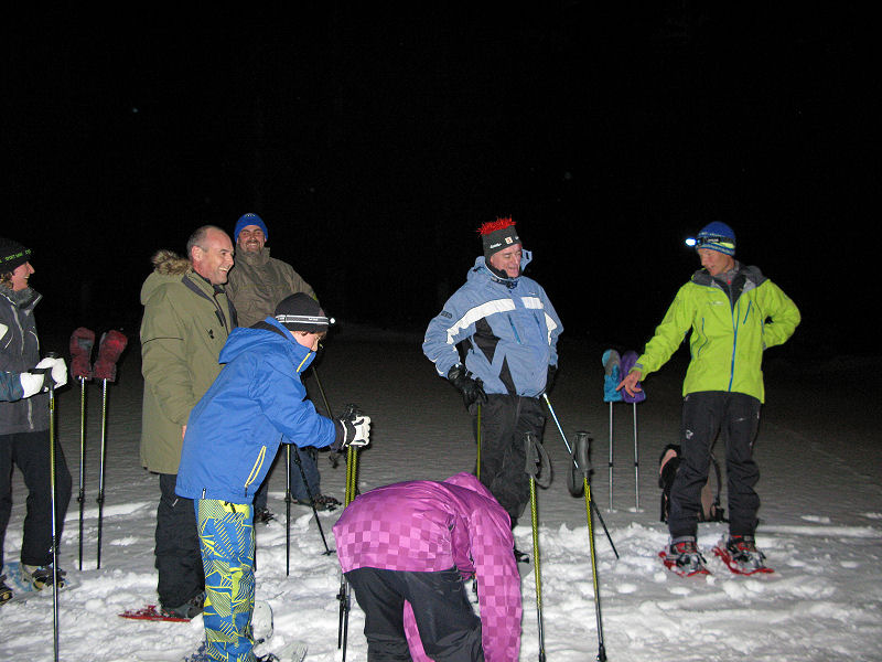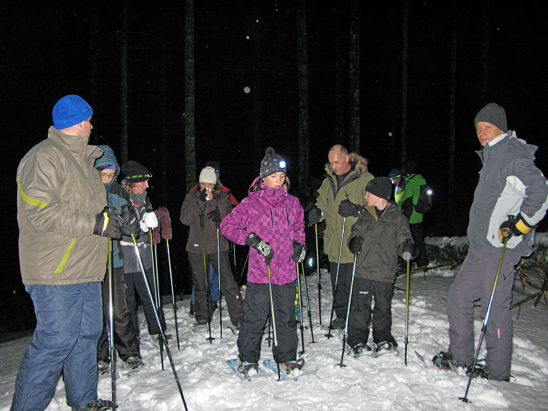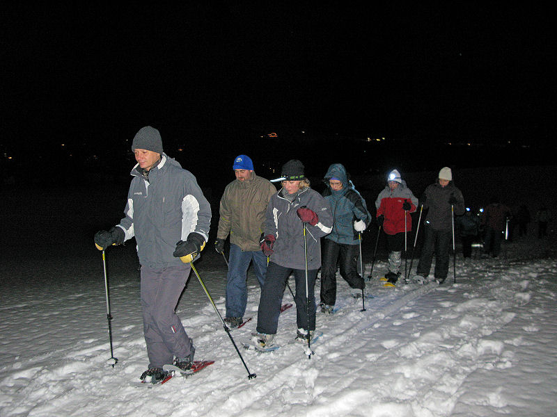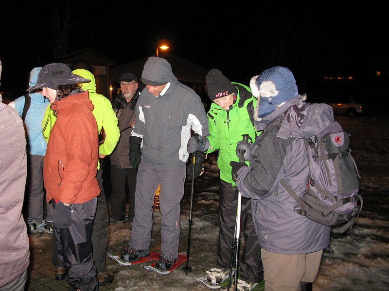 Super organisiert von Brigitte Zanon treffen sich 20 bewegungswillige Delphine am 7. Januar 2012 in Hinterzarten im Schwarzwald zur Mondschein-Schneeschuh-Wanderung. Erfahrung in dieser relativ neuen Sportart fehlt allgemein. Und so lassen wir uns von den drei Guides der „Schneeschuh-Akademie Hinterzarten“ mit Schneeschuhen, zwei Stöcken und einer Stirnlampe ausrüsten.