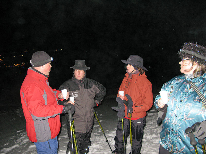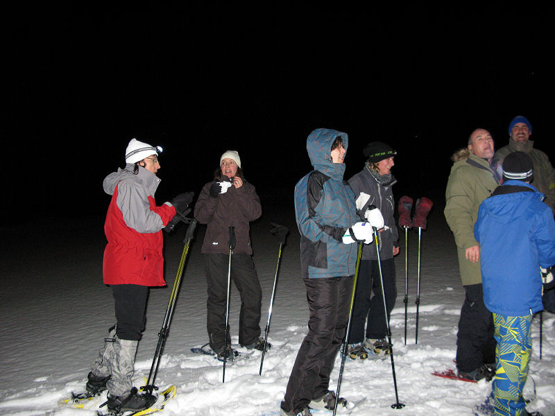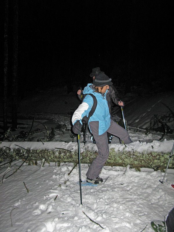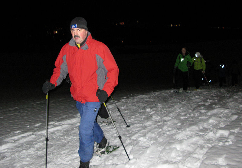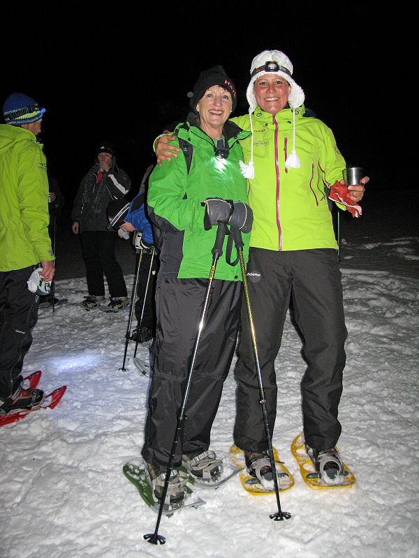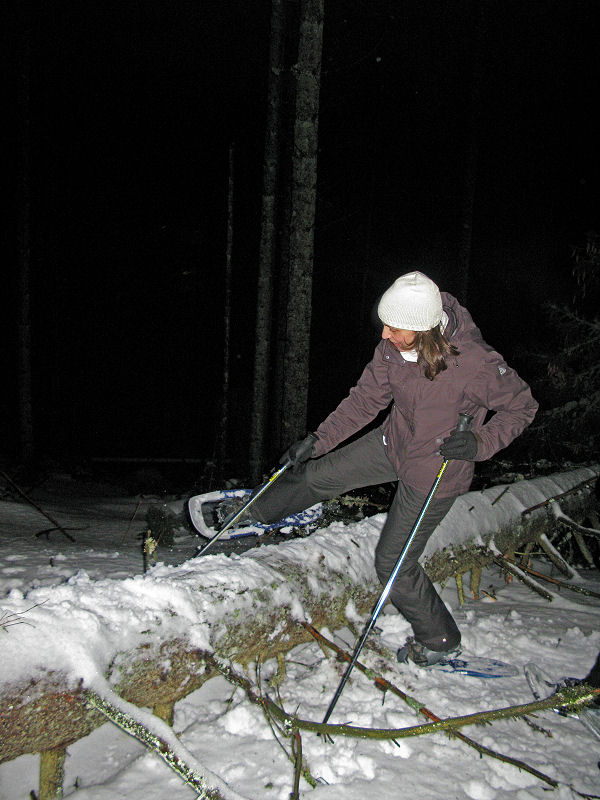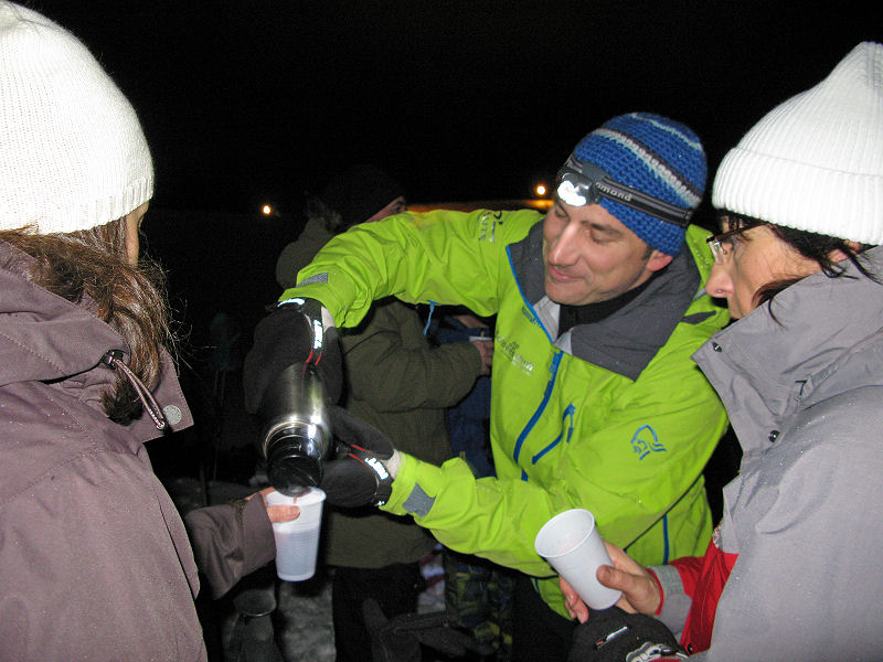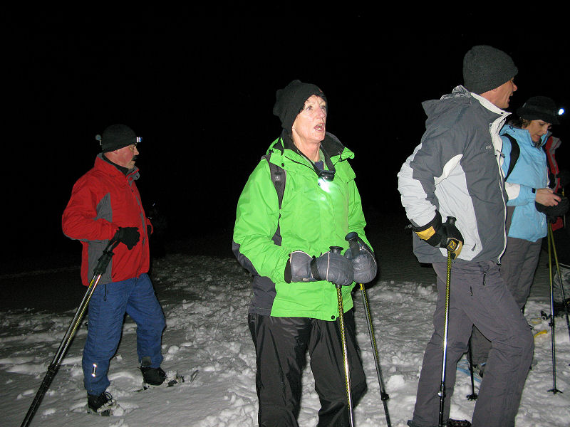 Und dann geht’s los! Dass es mitunter regnet, stört eigentlich niemanden. Der Mond will sich auch nicht blicken lassen. Trotzdem sorgt der Schnee – wenn auch etwas nass – für gute Sicht. Unsere Tour ist als leicht eingestuft, doch der Berg ruft und so gibt jeder sein Bestes, um auf vorgegebener Route die zum Teil ordentlich ansteigende Piste unter die Schneeschuhe zu bringen. Die Kondition der Delphin-Familie ist beachtlich! Eine im Weg liegende, vom Sturm gefällte Tanne überwinden wir locker. Als Lohn winken Glühwein und Stollen, mitgebracht und serviert von unseren Guides.