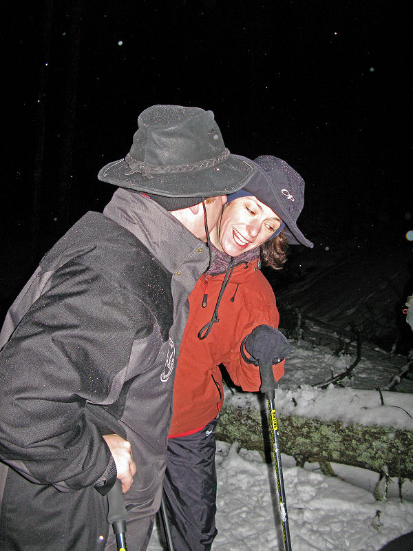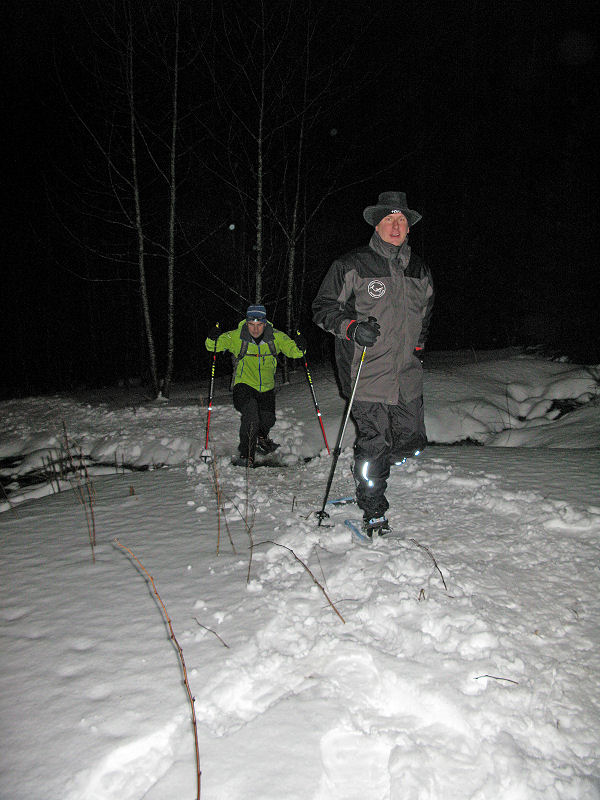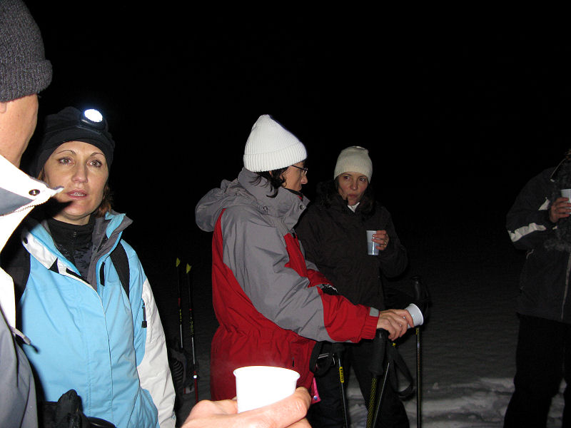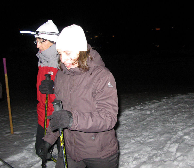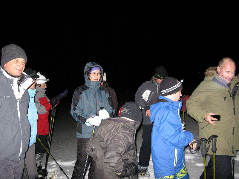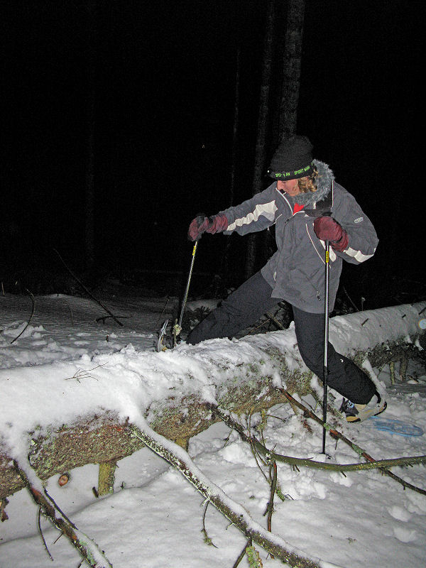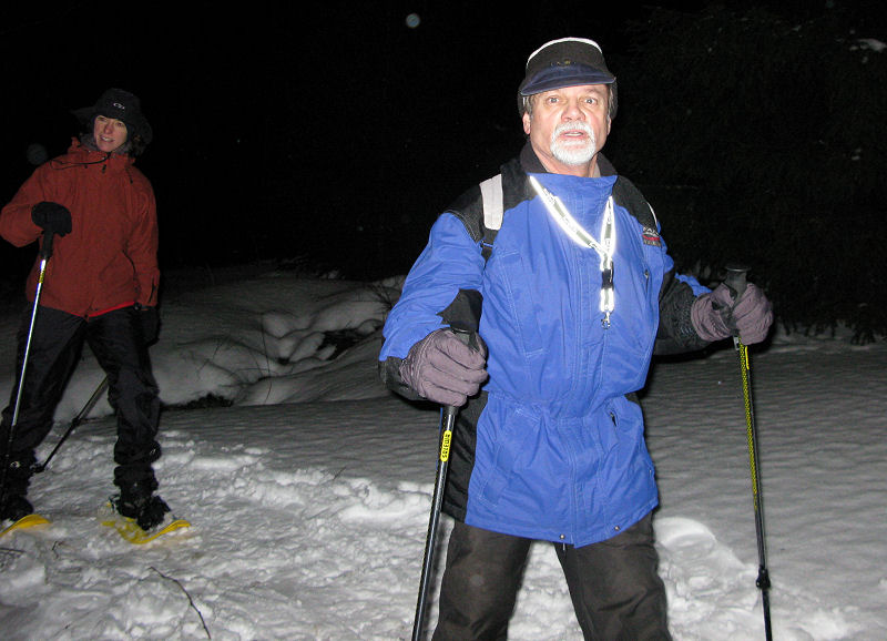 Und dann geht’s los! Dass es mitunter regnet, stört eigentlich niemanden. Der Mond will sich auch nicht blicken lassen. Trotzdem sorgt der Schnee – wenn auch etwas nass – für gute Sicht. Unsere Tour ist als leicht eingestuft, doch der Berg ruft und so gibt jeder sein Bestes, um auf vorgegebener Route die zum Teil ordentlich ansteigende Piste unter die Schneeschuhe zu bringen. Die Kondition der Delphin-Familie ist beachtlich! Eine im Weg liegende, vom Sturm gefällte Tanne überwinden wir locker. Als Lohn winken Glühwein und Stollen, mitgebracht und serviert von unseren Guides.