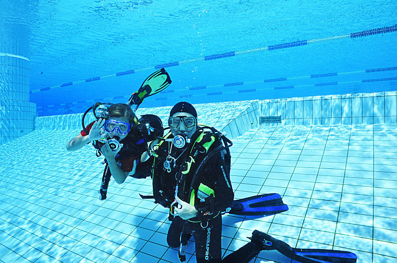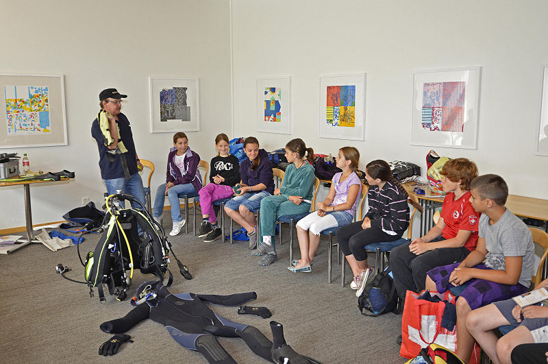 Vor dem Tauchgang gibts erst mal ein wenig Tauchtheorie. Nicht zu viel, doch ohne gehts nicht! Zuerst zeigen wir das Material und wie man es benutzt. Dann etwas gibts etwas Physik (warum schwimmt etwas oder sinkt auf den Boden? Was passiert mit einem Luftballon unter Wasser? …) Dann natürlich ein bisschen Tauchmedizin. (Wann darf man tauchen gehen und wann geht man besser nicht. Z.B. mit Schnupfen geht’s nicht, da klappt der Druckausgleich nicht und gerade Kinderohren sind noch sehr empfindlich). Ganz zum Schluss kommen noch die wichtigsten Unterwasserzeichen. Nur so kann man sich verständigen und zeigen ob man sich wohl fühlt oder lieber zurück an die Oberfläche möchte. (Wir gehen rauf/runter; Druckausgleich machen; Ich fühl mich nicht wohl; Alles OK).