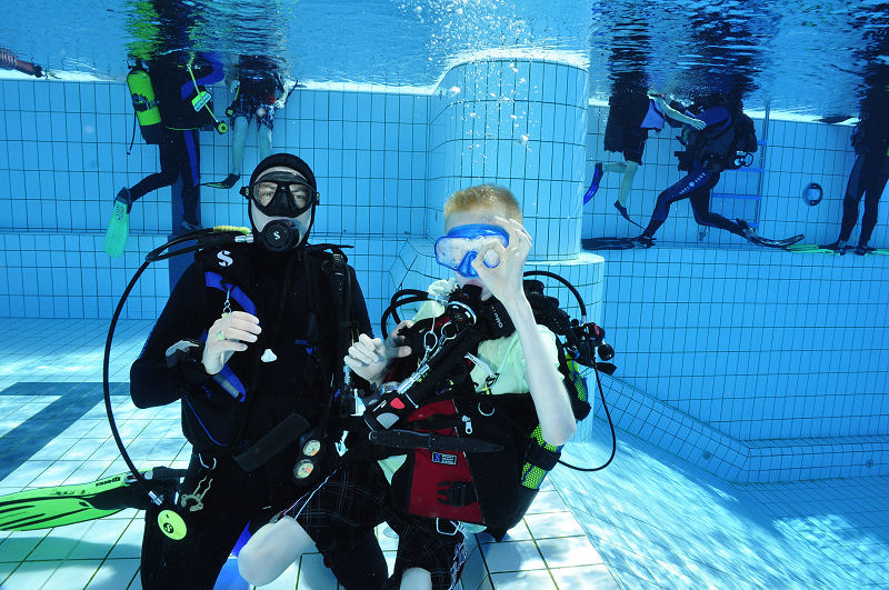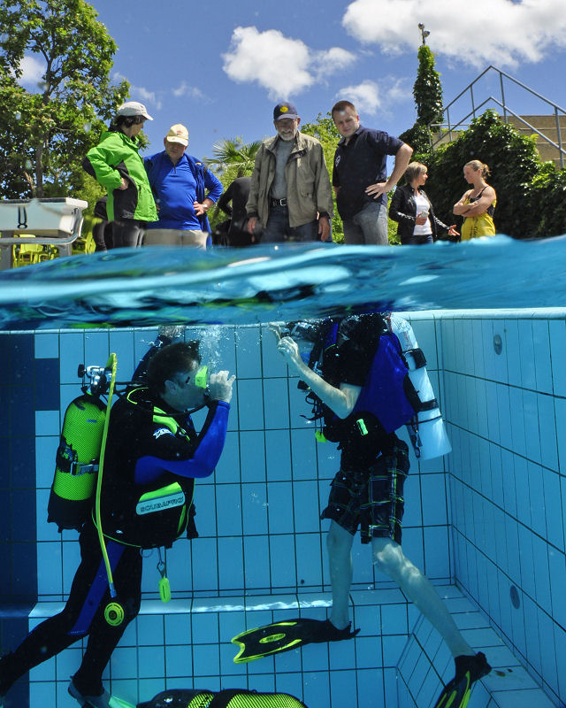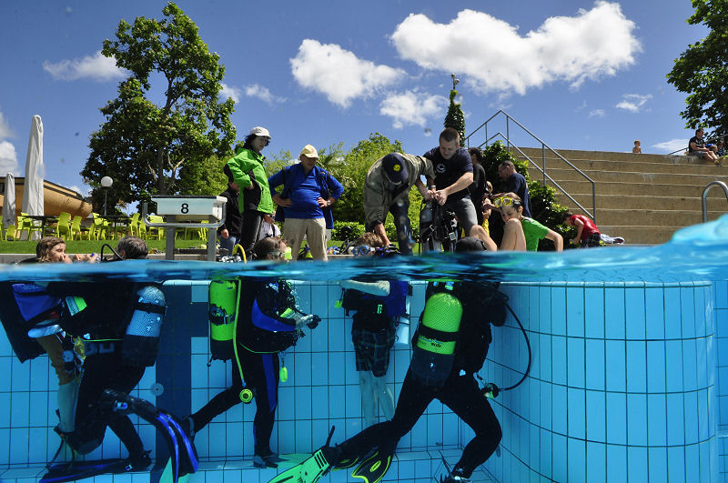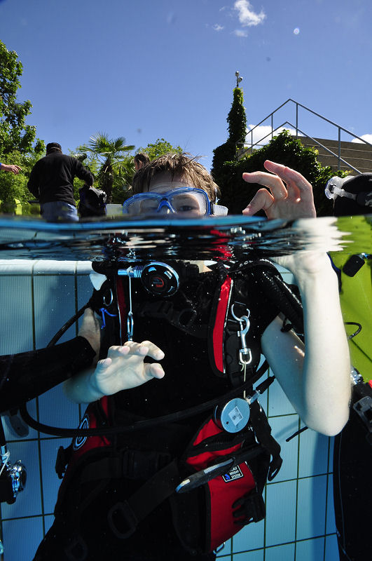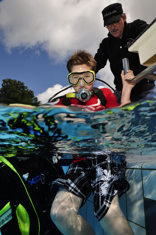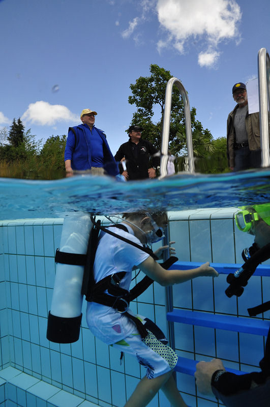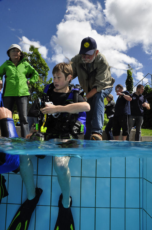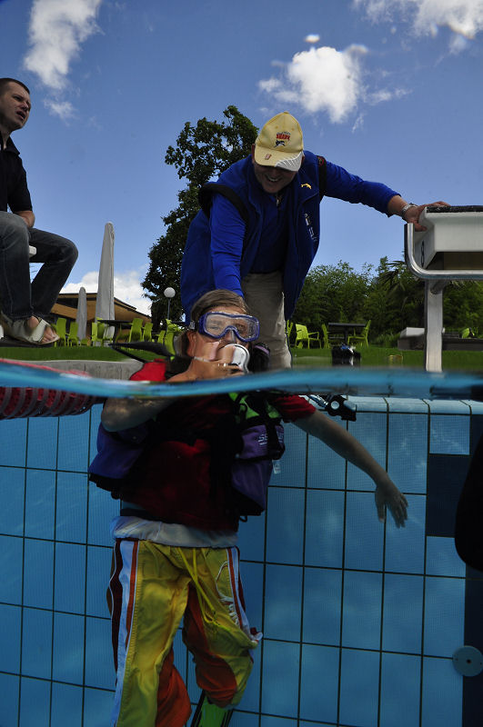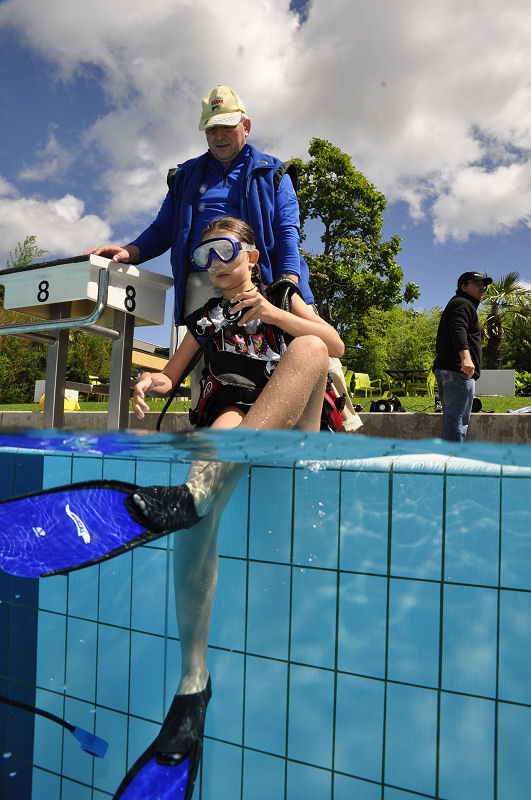 In der Zwischenzeit haben die grossen und kleinen Helfer alles vorbereitet und dann kommt die Praxis. Im Auslaufkanal darf jeder das erste mal unter Wasser atmen. Wenn das klappt gehts in grosse Becken. Fleissige Hände helfen beim Anlegen der Ausrüstung und helfen ins Wasser. Dort wartet auf jedes Kind einer unserer erfahrenen Taucher.