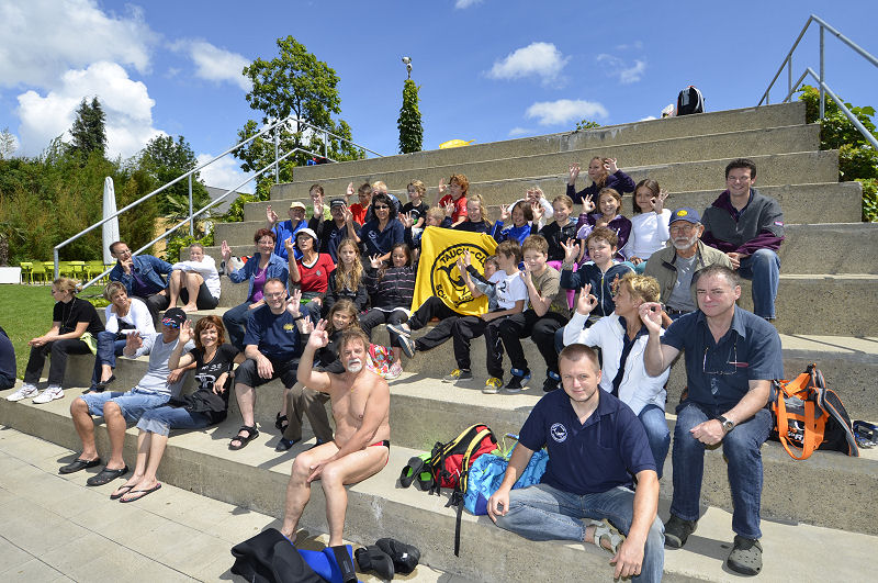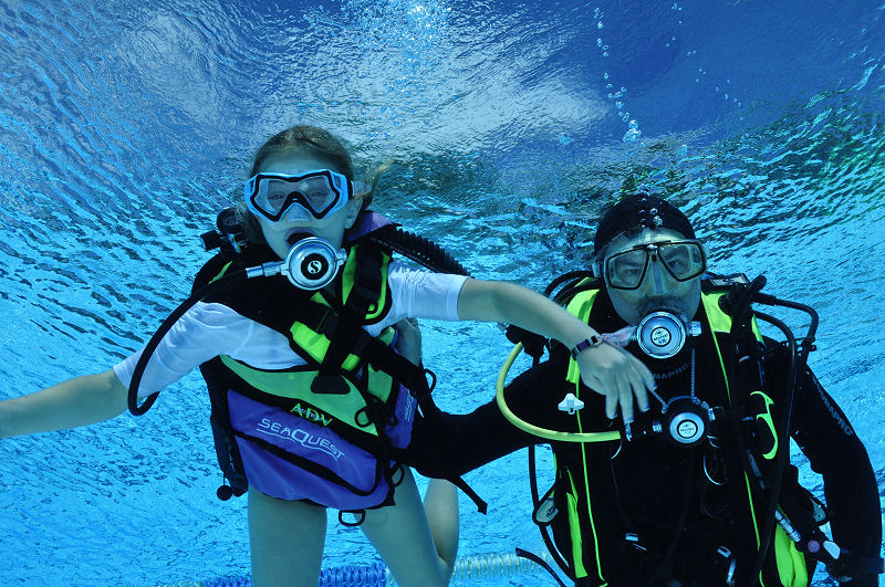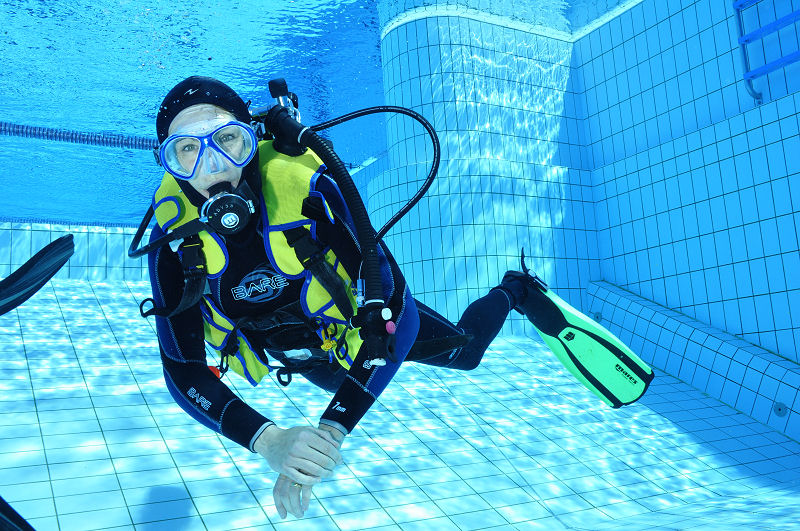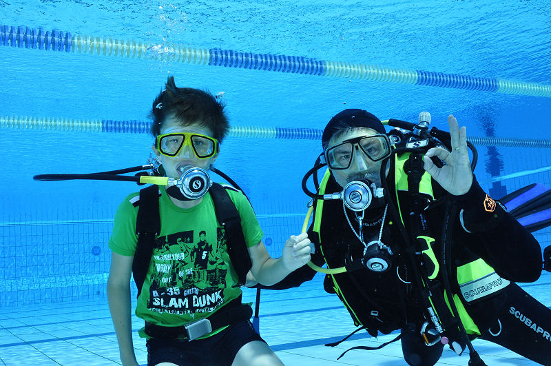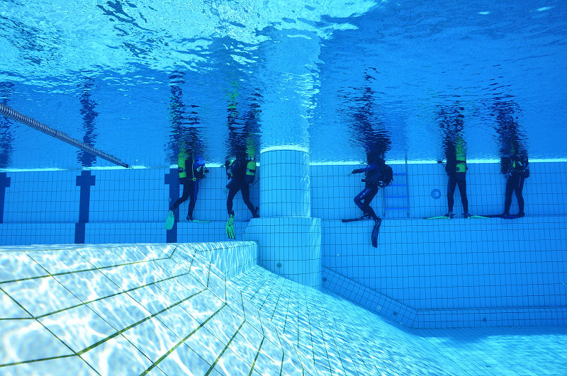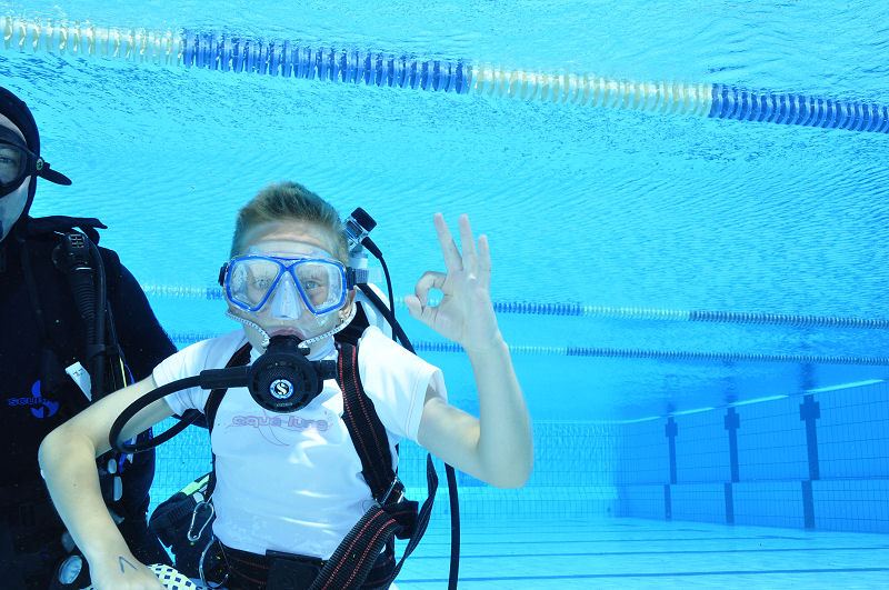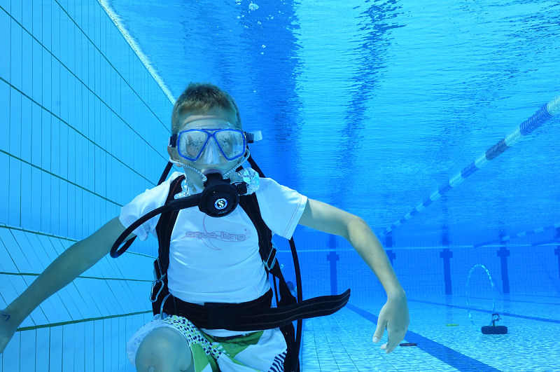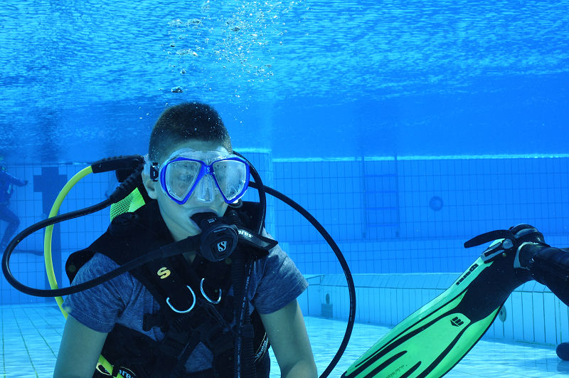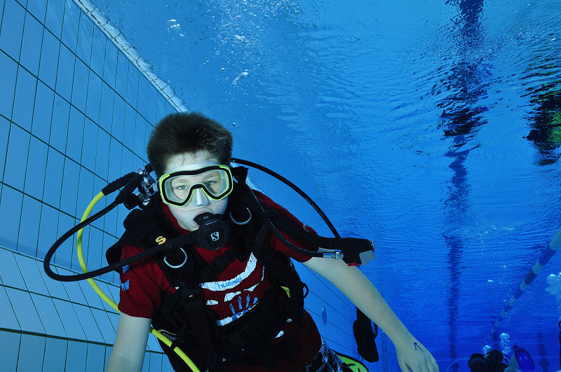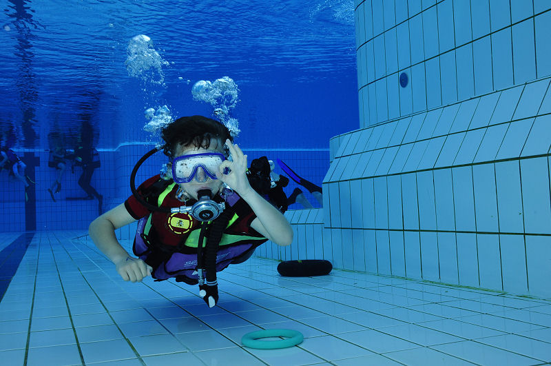 In der Zwischenzeit haben die grossen und kleinen Helfer alles vorbereitet und dann kommt die Praxis. Im Auslaufkanal darf jeder das erste mal unter Wasser atmen. Wenn das klappt gehts in grosse Becken. Fleissige Hände helfen beim Anlegen der Ausrüstung und helfen ins Wasser. Dort wartet auf jedes Kind einer unserer erfahrenen Taucher.