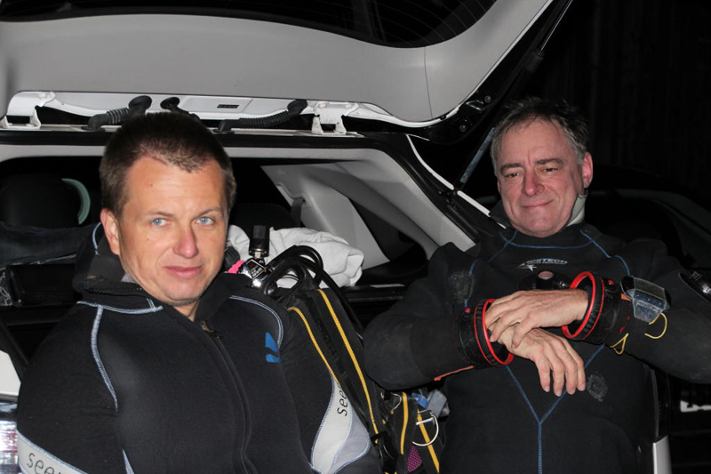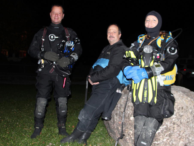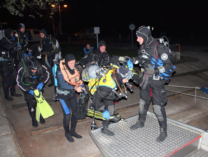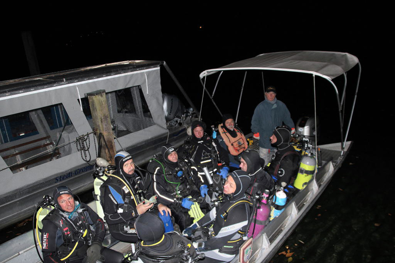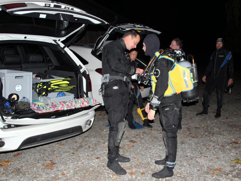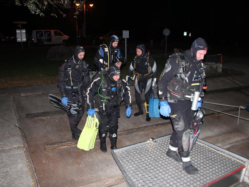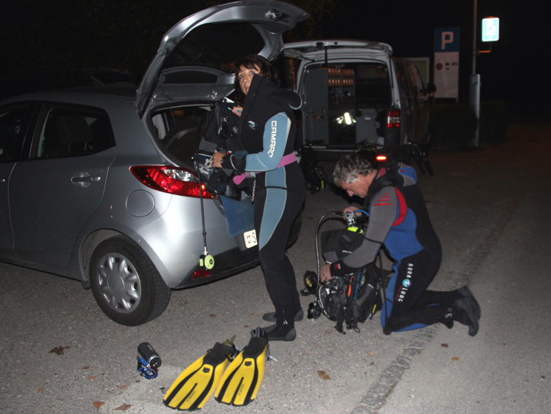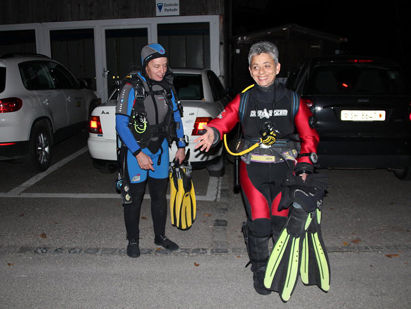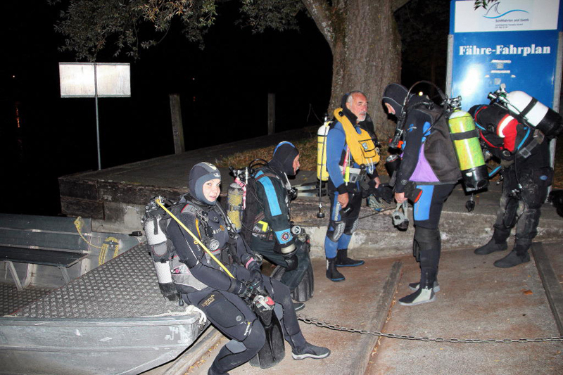 Dieses Jahr treffen sich 27 Taucher (rekordverdächtig) abends beim Gasthaus «Paradies» am Rhein. Bei einer Temperatur von knapp 14 °C wagen sich noch 5 Delphine im Nasstauchanzug ins Wasser. Nach einem kurzen Briefing geht’s unter altbewährter Leitung des Fährbetriebs Roland Walter ca. 1 km den Rhein hinauf. Und dann ist Warten angesagt. Bis zu 45 Minuten sind die Taucher auf dieser Strecke unterwegs, zumal der Rhein wenig Strömung hat. Die Sicht ist gut, auch Fische lassen sich sehen und schlussendlich erreichen alle mehr oder weniger gezielt den Ausstiegspunkt.