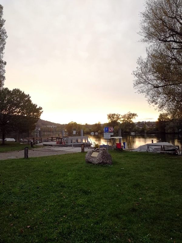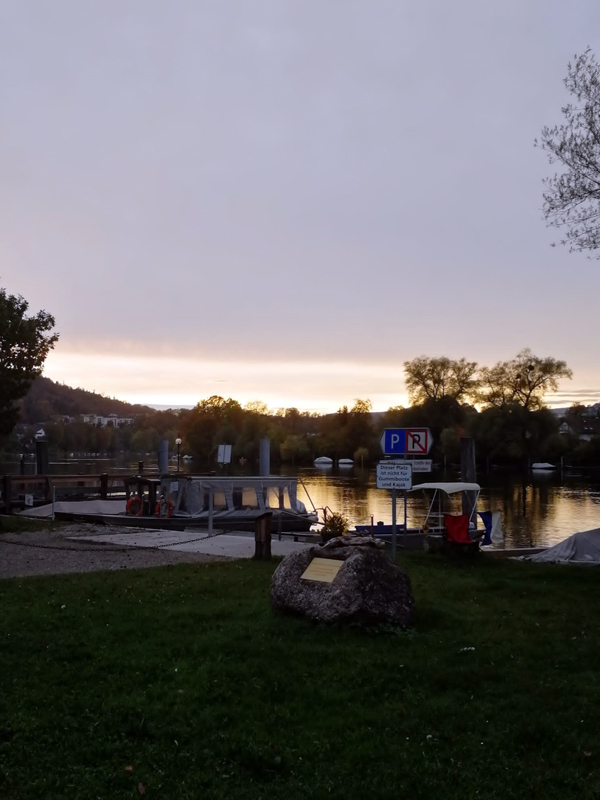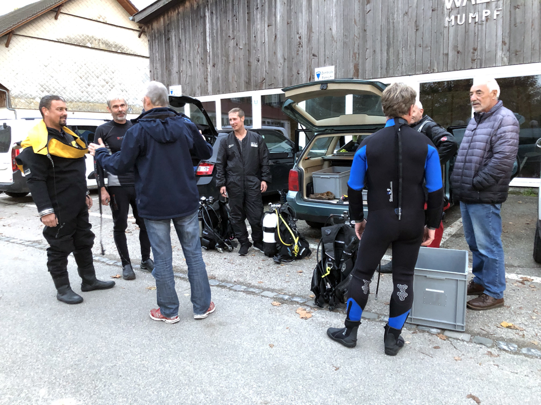 Für Ende Oktober hätte das Wetter nicht besser sein können: Kein Wind, kein Regen und die Luft noch angenehm warm, als 16 Delphine am Paradies mit Elan in ihre Tauchanzüge schlüpften. Das Boot von Roland Walter stand bereit und brachte uns in zwei Fahrten ca. 1 km bis zum Fischerplätzli Rhein aufwärts. Wir tauchten in klares Wasser von 14 °C ab. Nur – man sollte auch eine Taucherbrille dabei haben! Im Eifer des Gefechts war sie Paul abhanden gekommen. Ein kräftiger Fluch und einige Minuten suchen brachten Erfolg – sie ward wieder gefunden!