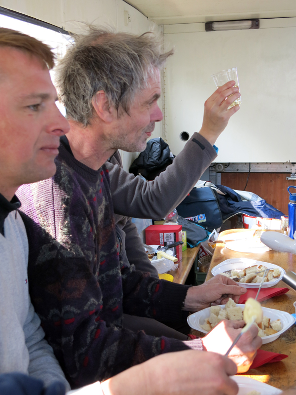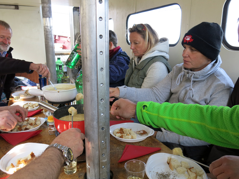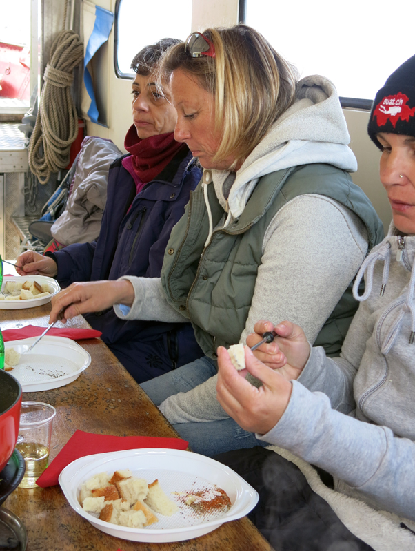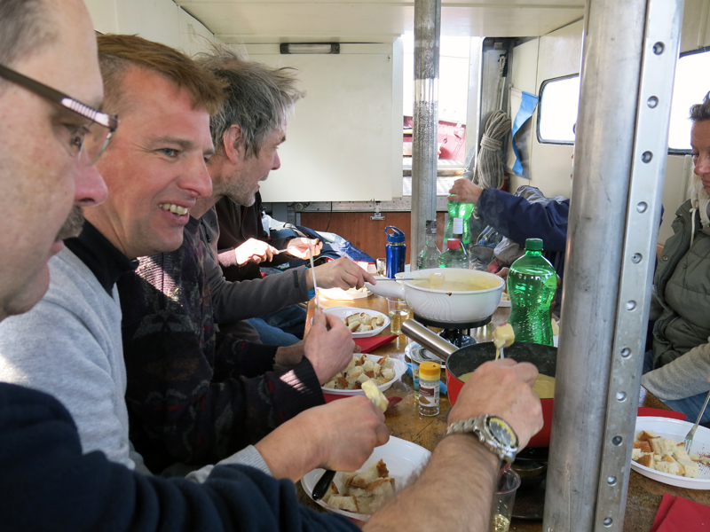 Das traditionelle Fondue begleitet mit Weisswein und einem feinen Coup du Milieu in Form eines feinen Kirschwassers, wurde in rauen Mengen vertilgt. Zum Glück hatte Matthias genug Käsemischung mit dabei!