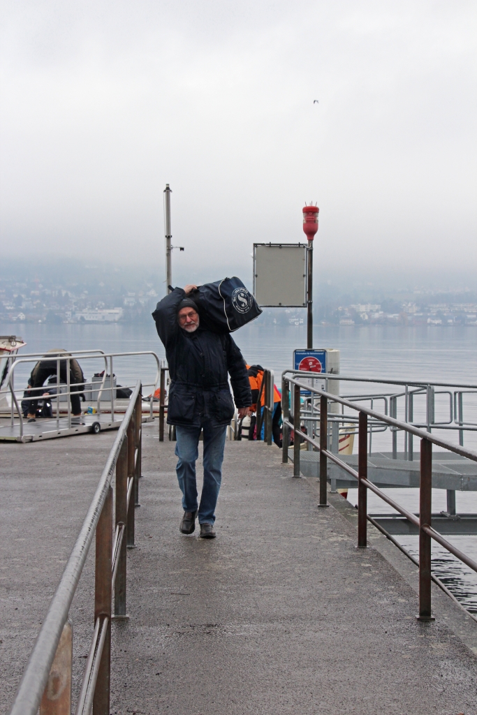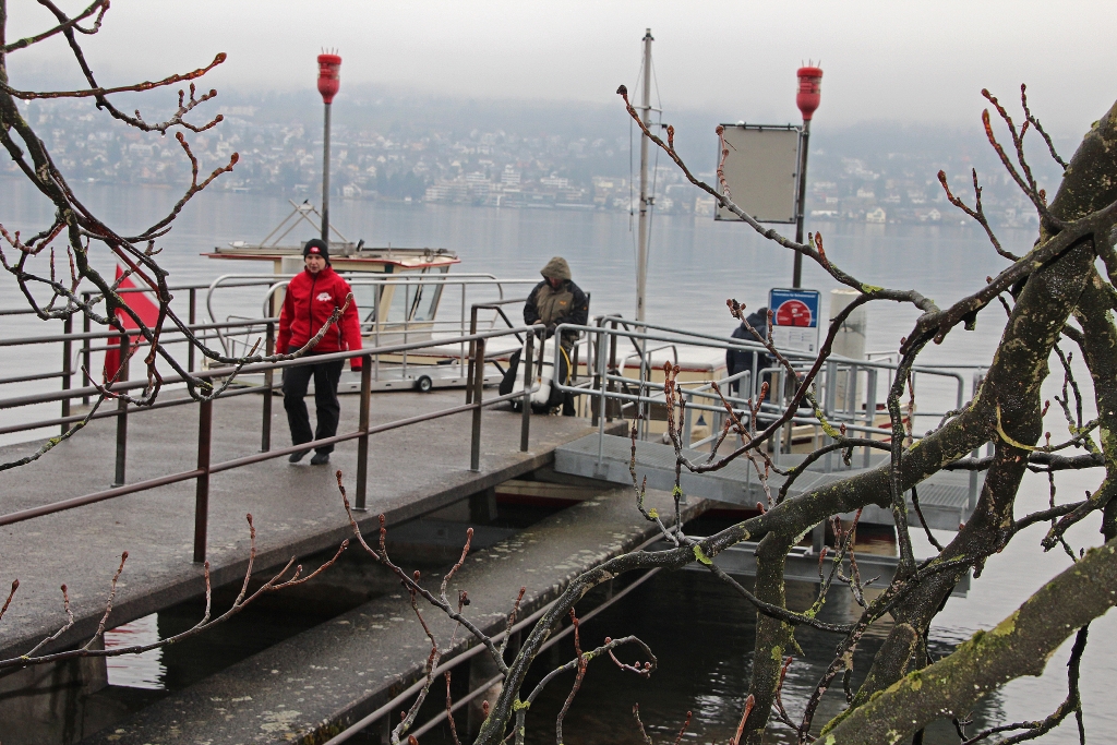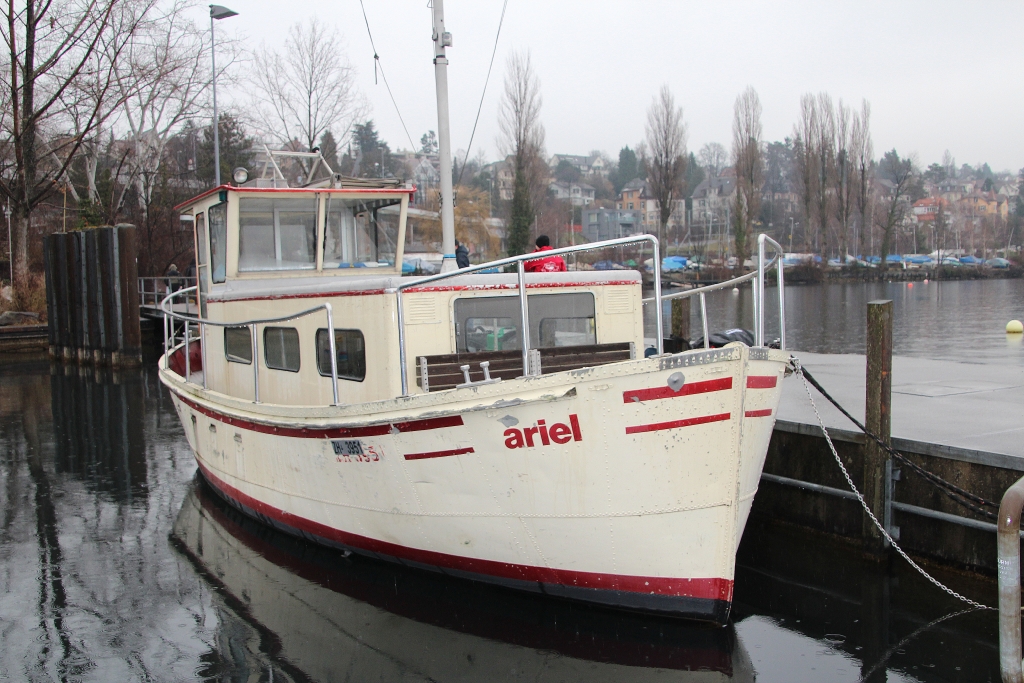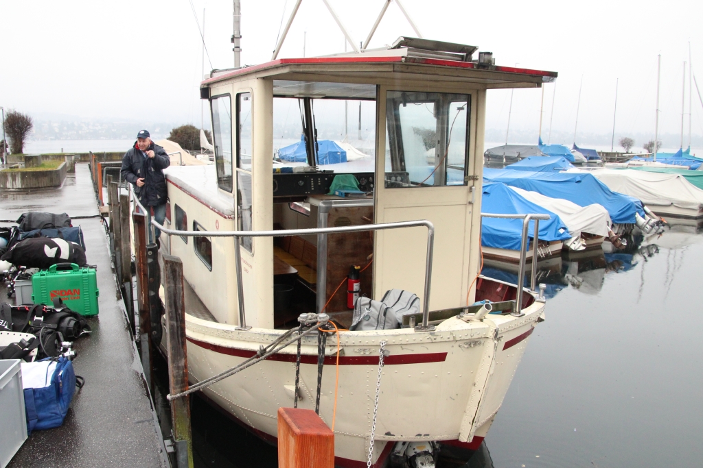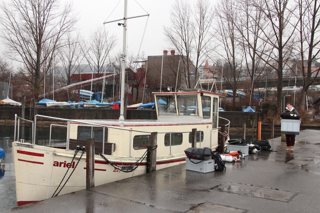 Nebel und leichter Regen begleiten uns am Sonntagmorgen auf dem Weg nach Tiefenbrunnen am Zürich-See. Ein merkwürdiges und ungewohntes Gefühl, frühmorgens fast allein auf den Strassen zu fahren. Am Anlegesteg des Hafens erwarten sie uns bereits: Ariel, unser Schiff, und Kapitän Reini.