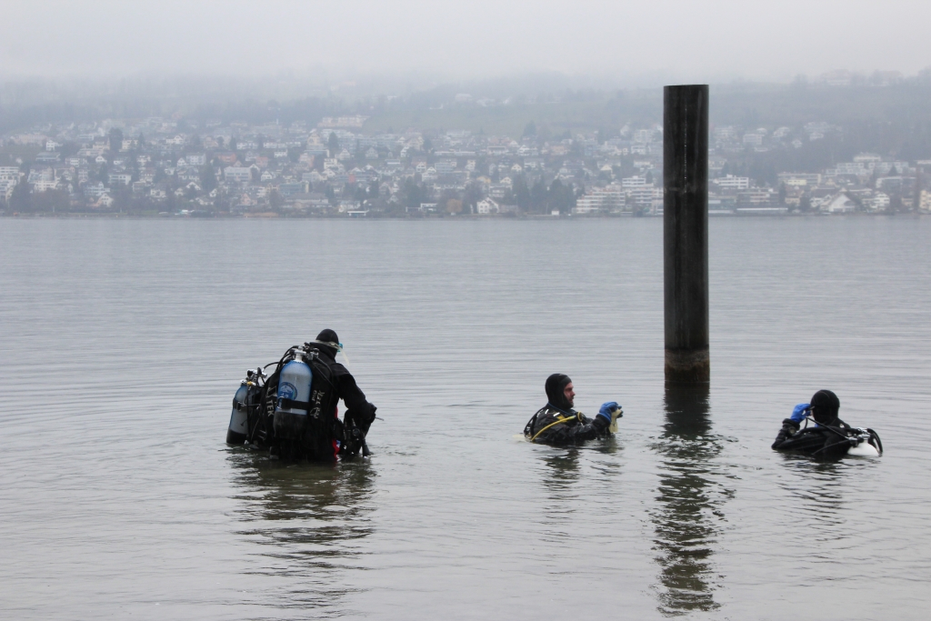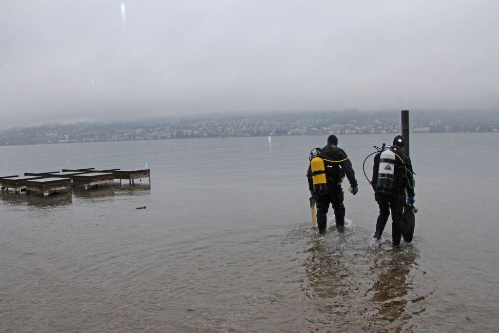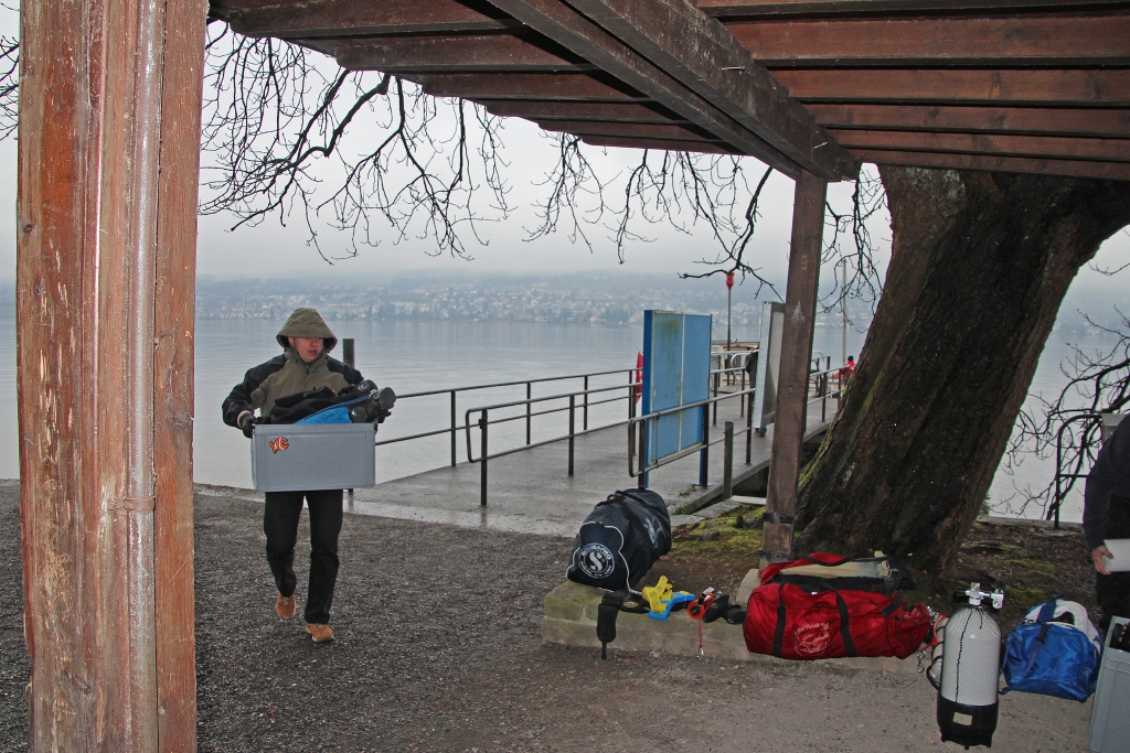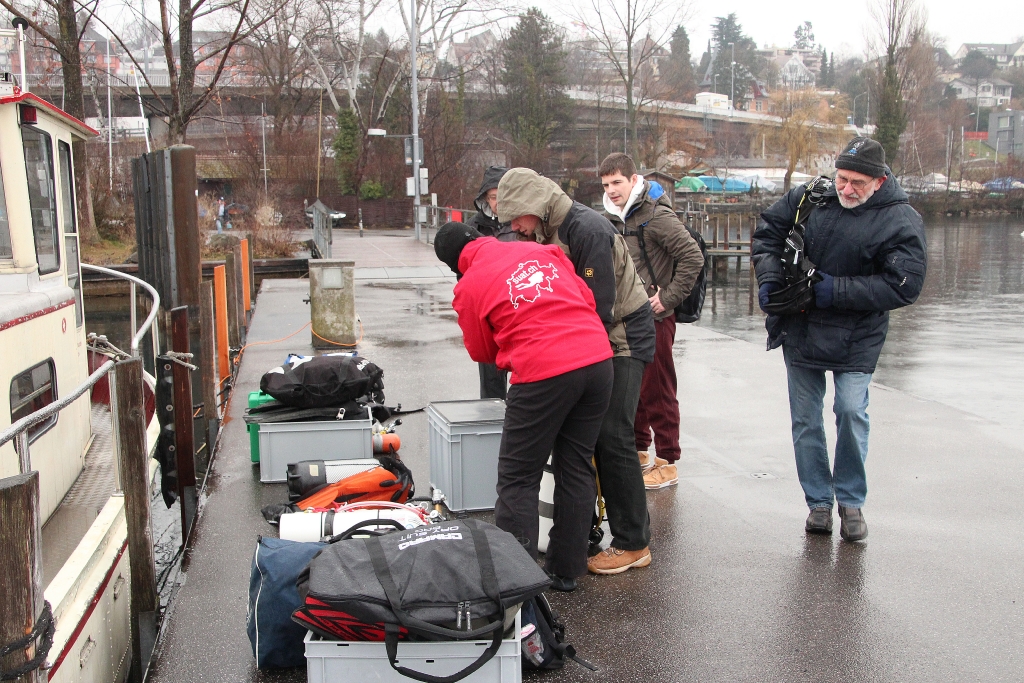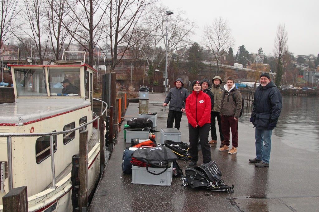 Das „wenige“ Gepäck der 9 Delphine ist schnell umgeladen – die Fahrt kann los gehen. 1 1/4 Std. tuckert die ältere Dame über den leeren Zürich-See, bis die Halbinsel Au in Sicht kommt. Jetzt heisst es, alles wieder ausladen und am Ufer unter einem Vordach deponieren – umziehen. In Zweiergruppen geht’s ins Wasser.