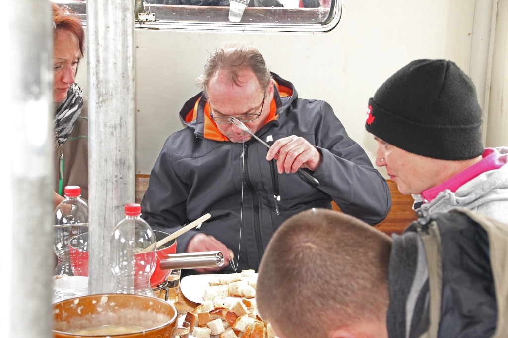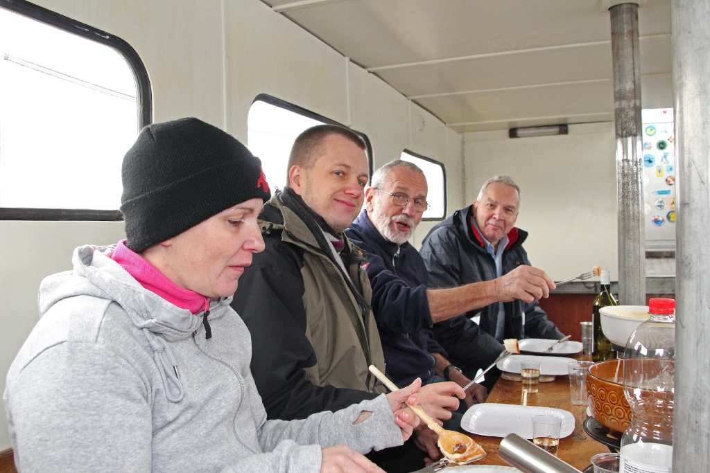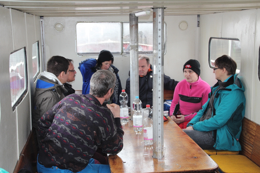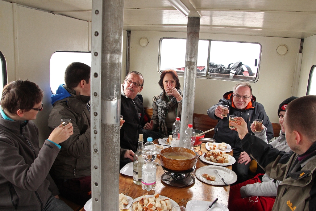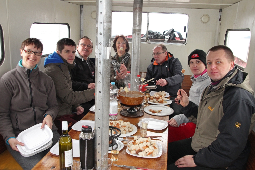 Die Ariel legt ab und wir freuen uns auf die „Käsesuppe“. Weit draussen auf dem ruhigen, nebelverhangenen See stellt Reini den Motor ab. Wir lassen treiben und geniessen unser Fondue bei bester Laune und viel „Pressluftgeschnorre“.