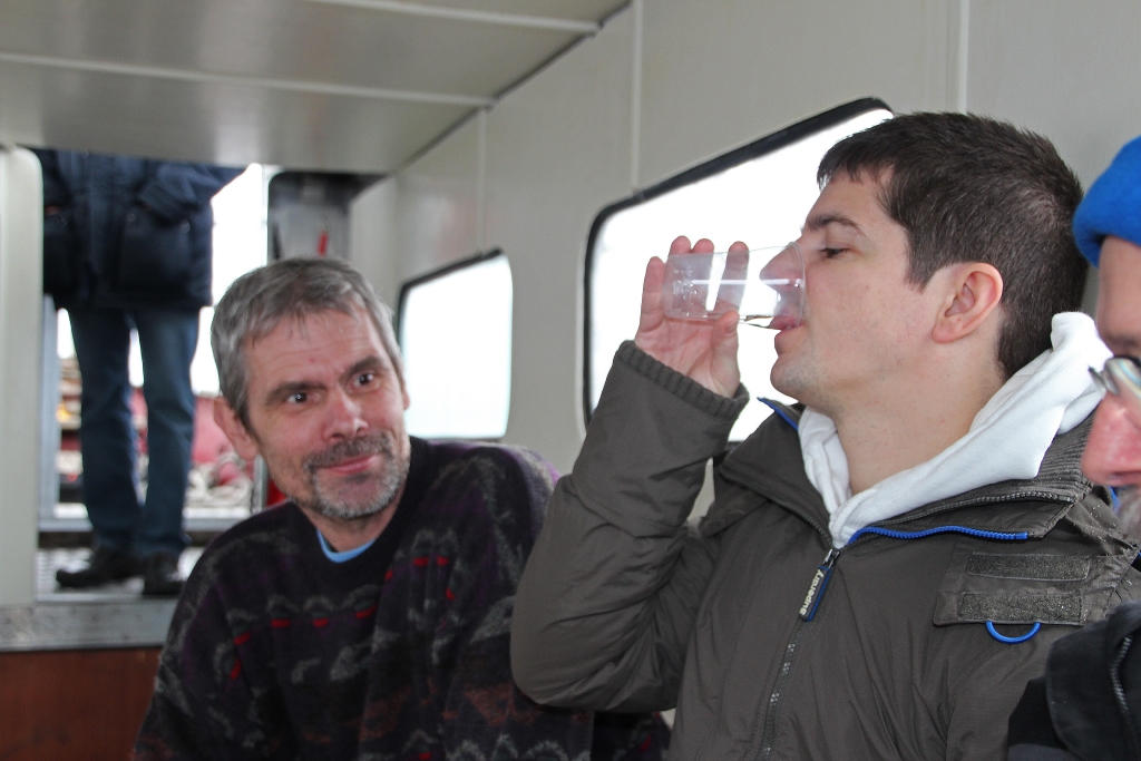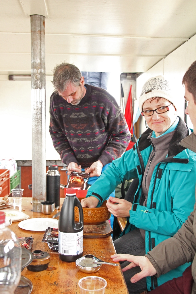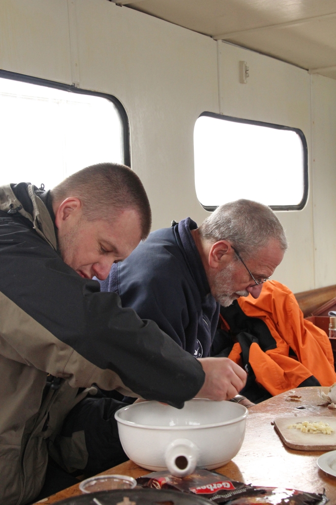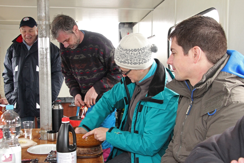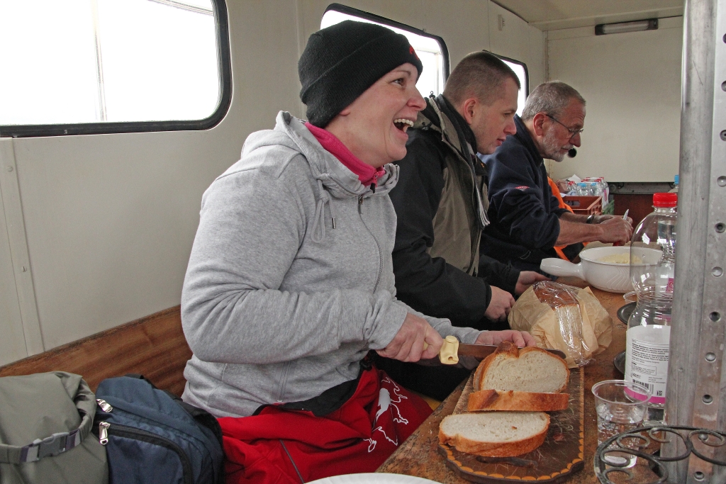 Die Ariel legt ab und wir freuen uns auf die „Käsesuppe“. Weit draussen auf dem ruhigen, nebelverhangenen See stellt Reini den Motor ab. Wir lassen treiben und geniessen unser Fondue bei bester Laune und viel „Pressluftgeschnorre“.