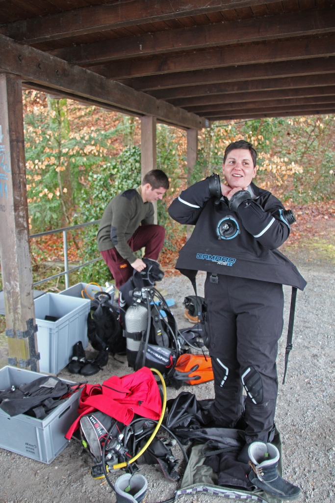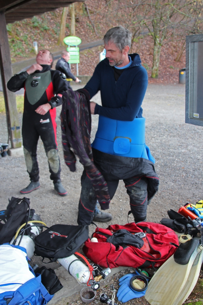 Nach ca. 45 Minuten haben alle wieder festen Boden unter den Füssen und jetzt ist abermals umziehen angesagt. Lustig dabei ist zu beobachten, welchen Erfindungsgeist jeder entwickelt, um nicht in Socken auf der nassen Erde stehen zu müssen: Taschen, Flossen, Plastik – alles erfüllt den Zweck.
