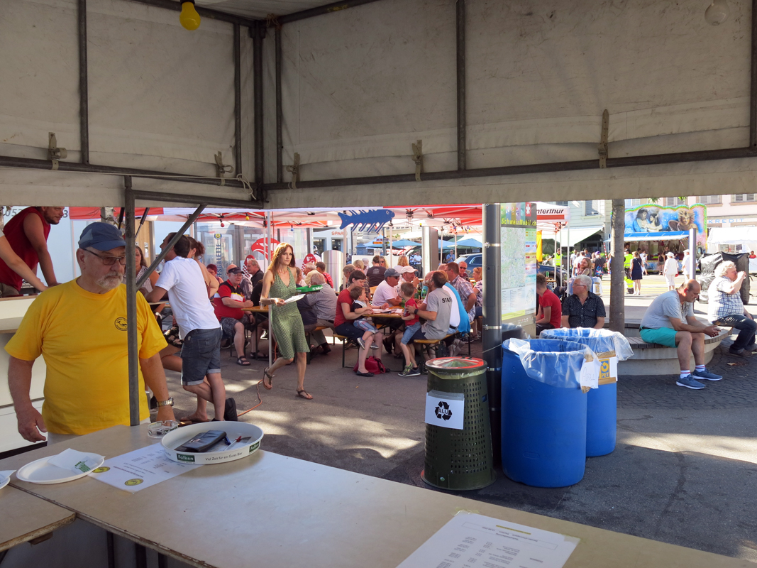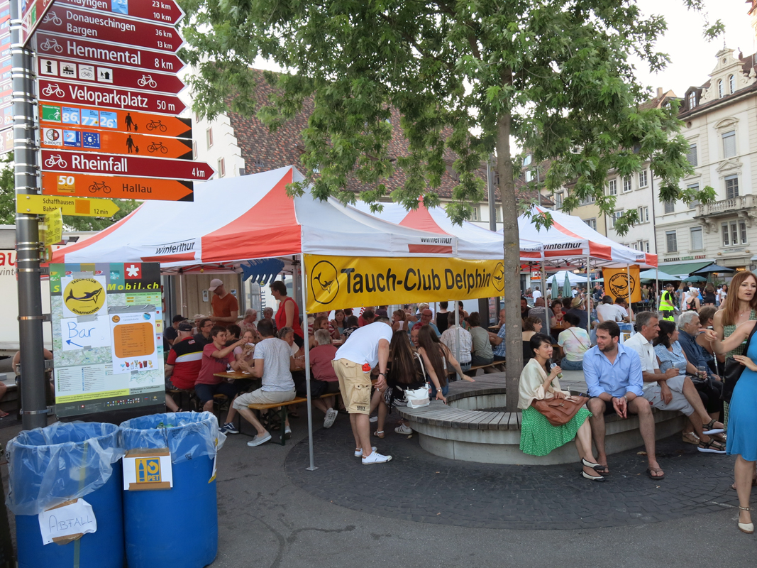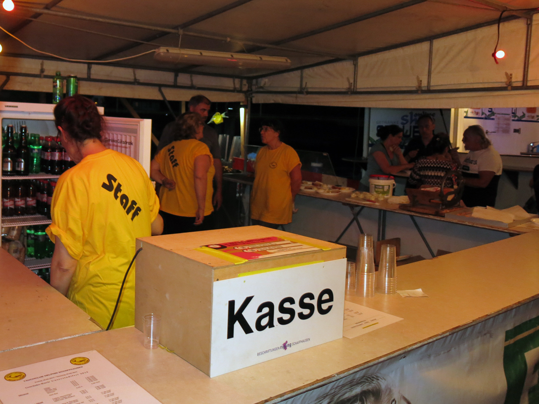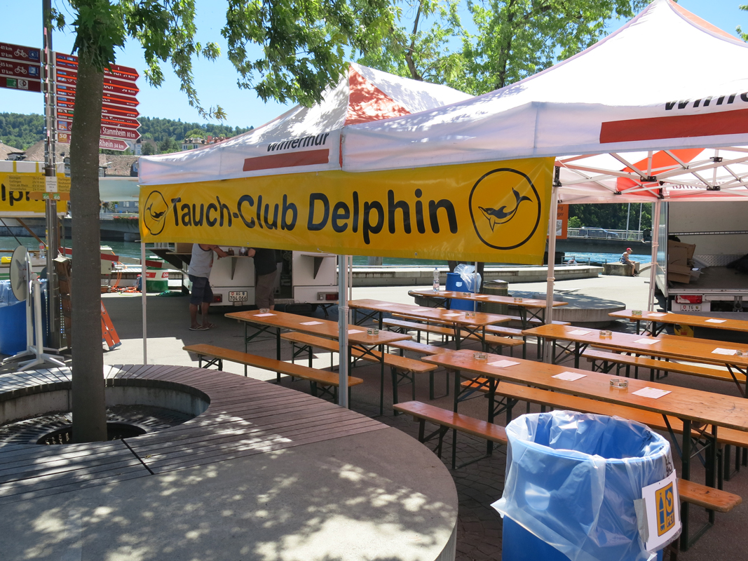 Alles was als Barkeeper oder Restaurateur gebraucht wurde, musste zum Festplatz an der Schifflände 1 am Freien Patz in Schaffhausen gekarrt, angeliefert und installiert werden. Auch die Lieferanten wurden zu Extraleistungen für den Tauchclub gebraucht. Aber mit vereinten Kräften war der Festplatz mit Barwagen, Restaurant mit 104 Sitzplätzen in 3 Zelten und Getränkekühlwagen schnell und gut organisiert und kurz nach Mittag am Freitag einsatzbereit, sogar mit Strom und Wasser versorgt.