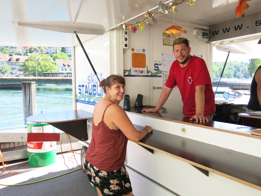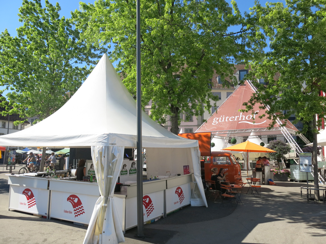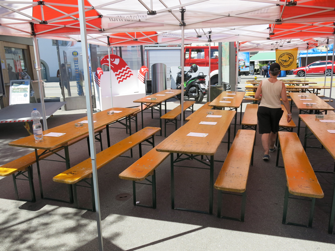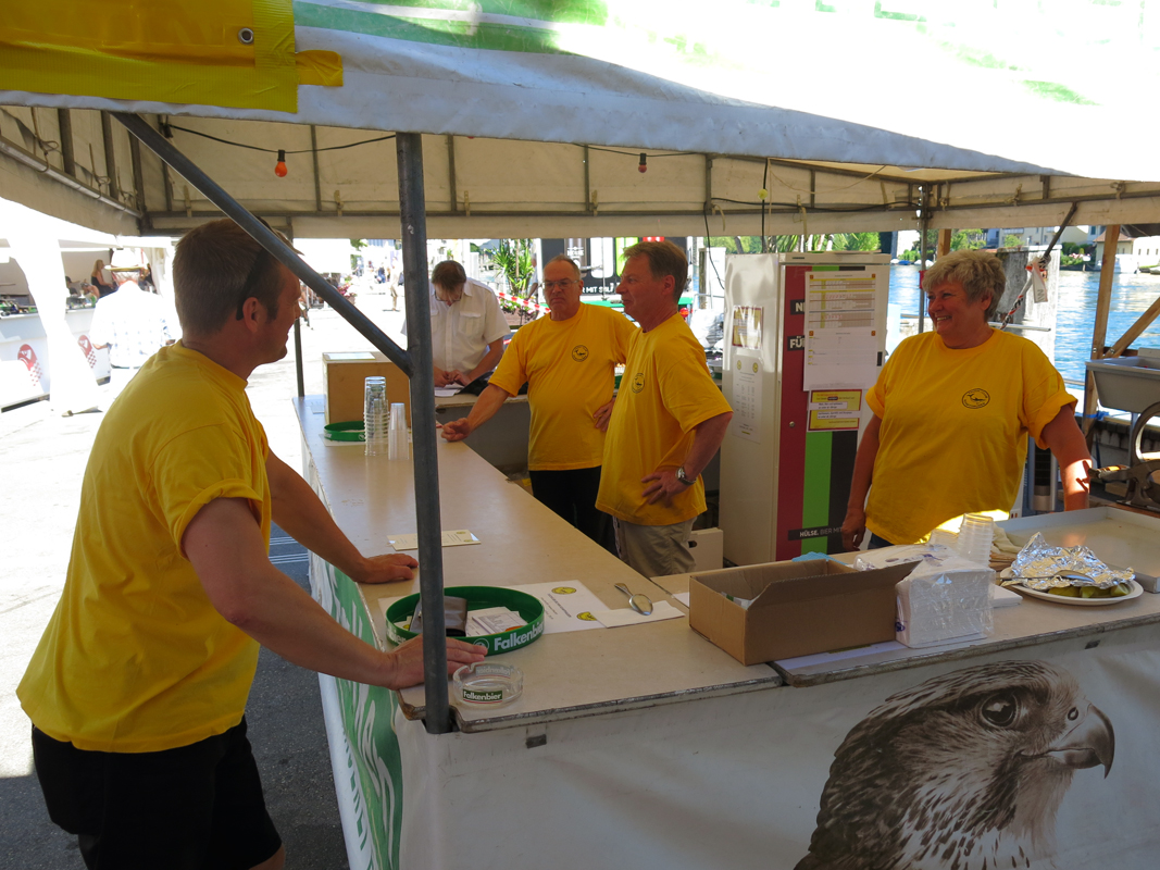 Alles was als Barkeeper oder Restaurateur gebraucht wurde, musste zum Festplatz an der Schifflände 1 am Freien Patz in Schaffhausen gekarrt, angeliefert und installiert werden. Auch die Lieferanten wurden zu Extraleistungen für den Tauchclub gebraucht. Aber mit vereinten Kräften war der Festplatz mit Barwagen, Restaurant mit 104 Sitzplätzen in 3 Zelten und Getränkekühlwagen schnell und gut organisiert und kurz nach Mittag am Freitag einsatzbereit, sogar mit Strom und Wasser versorgt.