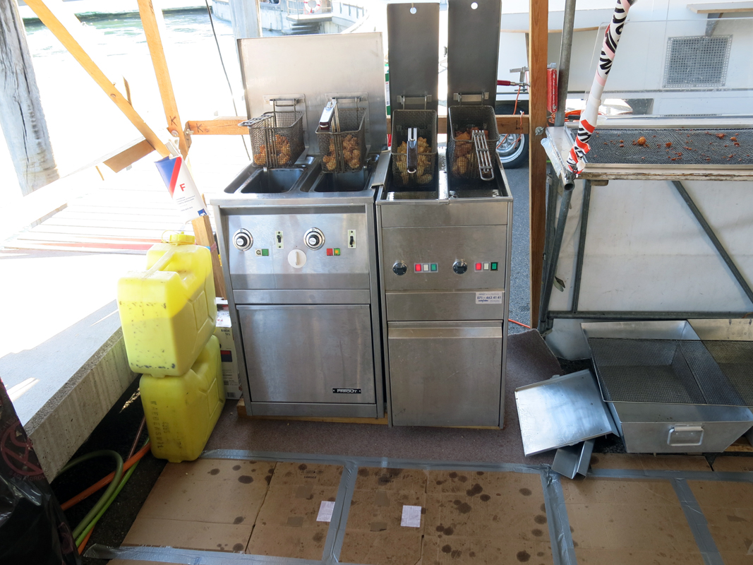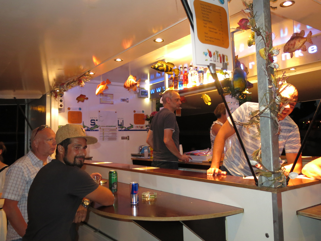 Die Delphin – Familie musste nun zeigen, dass auch harte Arbeit nötig ist. Der Fisch (Zander) wurde nach dem auftauen fachgerecht frittiert und von Zitronenschnitz, Tartar Sauce und Brot begleitet in vielen Portionen serviert. Man merkte, dass da Alles Hand in Hand ging. Der Getränke-Nachschub aus dem Getränkekühlwagen war pannenfrei und ermöglichte der Bar und dem Restaurant eine schnelle Bedienung und somit Abkühlung der Gäste gegen die Hitze. An der Bar wurden immer grössere Bestellungen von Shots, Aperol Spritz und dem speziellen Deep Sea Diver Drink, Wodka Red Bull oder sogar mehr und mehr der alkoholfreie Blue Lagoon Drink registriert.