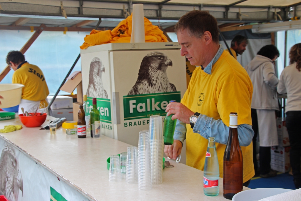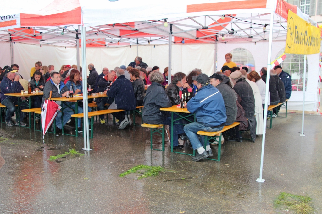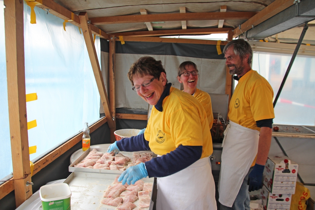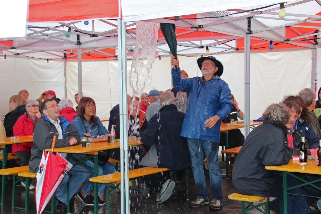 Ja, und dann geht’s bereits morgens los. Es regnet und regnet und regnet nur ein einziges Mal! Unverdrossen eröffnen wir gegen Mittag unseren Stand und die ersten Felchenfilets im Bierteig werden fachgerecht zubereitet. Der grosse Run ist dieses Jahr nicht zu erwarten, doch bewähren sich unsere Zelte. Besucher finden einen (vermeintlich) trockenen Platz. Mehr oder weniger erfolgreich muss das angesammelte Regenwasser von unten vom Dach gestossen werden, was wiederum zu der einen oder anderen feuchten Panne führt. Die Festbesucher nehmen es bewundernswert gelassen, sie sind heute wirklich Kummer gewöhnt, harren auf den Bänken aus, lassen sich den Fisch schmecken und die eine oder andere Flasche Wein findet ihren Abnehmer.
