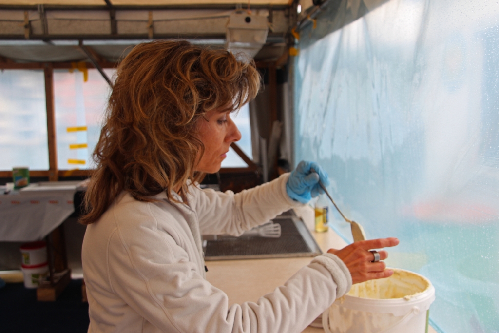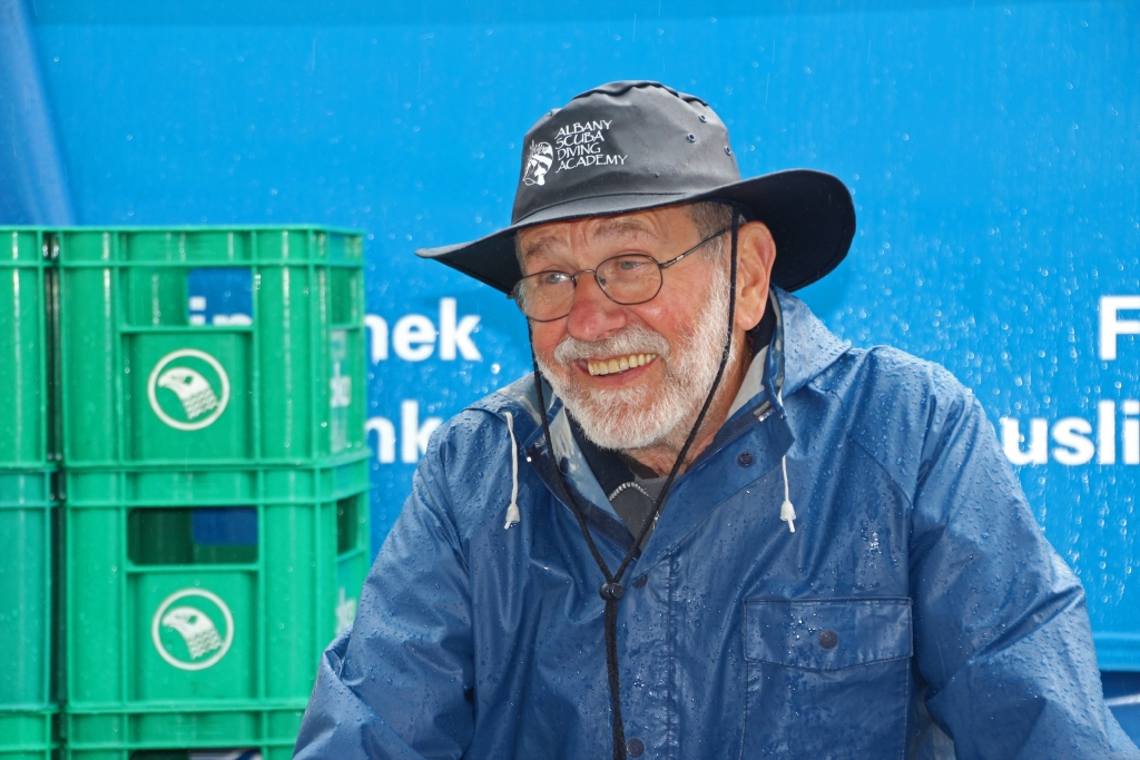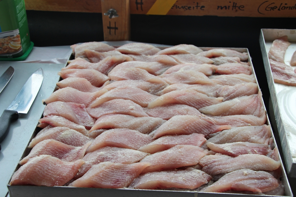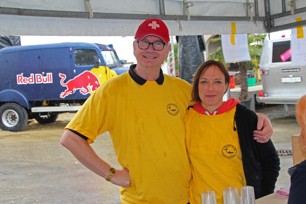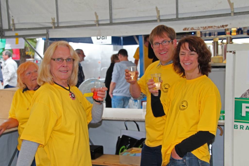 Ja, und dann geht’s bereits morgens los. Es regnet und regnet und regnet nur ein einziges Mal! Unverdrossen eröffnen wir gegen Mittag unseren Stand und die ersten Felchenfilets im Bierteig werden fachgerecht zubereitet. Der grosse Run ist dieses Jahr nicht zu erwarten, doch bewähren sich unsere Zelte. Besucher finden einen (vermeintlich) trockenen Platz. Mehr oder weniger erfolgreich muss das angesammelte Regenwasser von unten vom Dach gestossen werden, was wiederum zu der einen oder anderen feuchten Panne führt. Die Festbesucher nehmen es bewundernswert gelassen, sie sind heute wirklich Kummer gewöhnt, harren auf den Bänken aus, lassen sich den Fisch schmecken und die eine oder andere Flasche Wein findet ihren Abnehmer.
